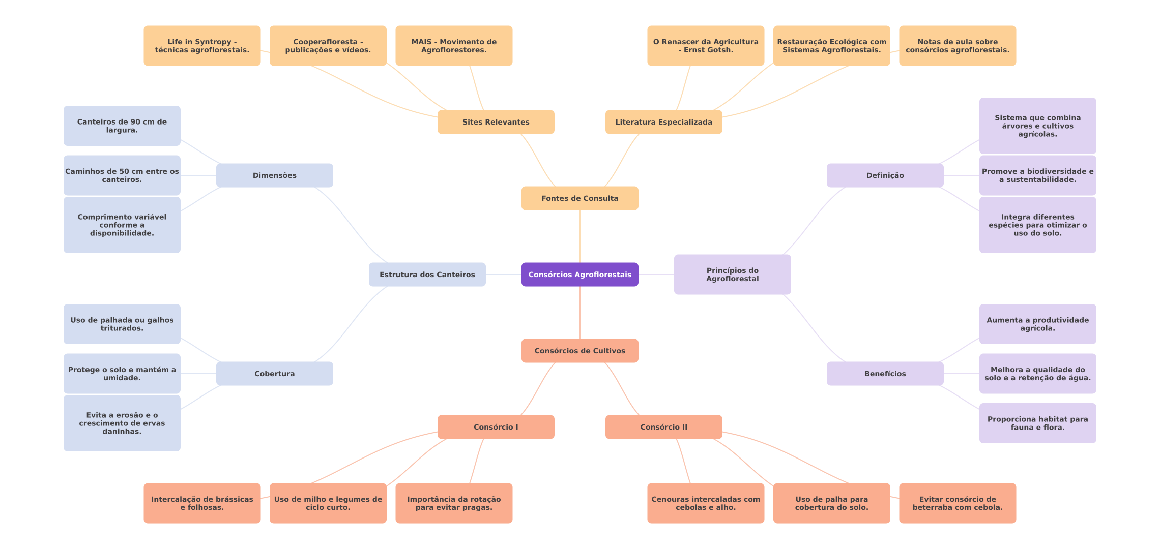 Life in Syntropy Cooperafloresta MAIS Movimento de Renascer da Agricultura Restauração Ecológica com Notas de aula sobre técnicas agroflorestais. publicações e vídeos. Agroflorestores. Ernst Gotsh. Sistemas Agroflorestais. consórcios agroflorestais. Sistema que combina Canteiros de 90 cm de Sites Relevantes Literatura Especializada árvores e cultivos largura. agrícolas. Caminhos de 50 cm entre os Promove a biodiversidade e Dimensões Definição canteiros. a sustentabilidade. Fontes de Consulta Comprimento variável Integra diferentes conforme a espécies para otimizar disponibilidade. uso do solo. Estrutura dos Canteiros Princípios do Consórcios Agroflorestais Agroflorestal Uso de palhada ou galhos Aumenta a produtividade triturados. agrícola. Consórcios de Cultivos Protege solo e mantém a Benefícios Melhora a qualidade do Cobertura umidade. solo e a retenção de água. Evita a erosão e Proporciona habitat para crescimento de ervas Consórcio I Consórcio II fauna e flora. daninhas. Intercalação de brássicas Uso de milho e legumes de Importância da rotação Cenouras intercaladas com Uso de palha para Evitar consórcio de e folhosas. ciclo curto. para evitar pragas. cebolas e alho. cobertura do solo. beterraba com cebola.