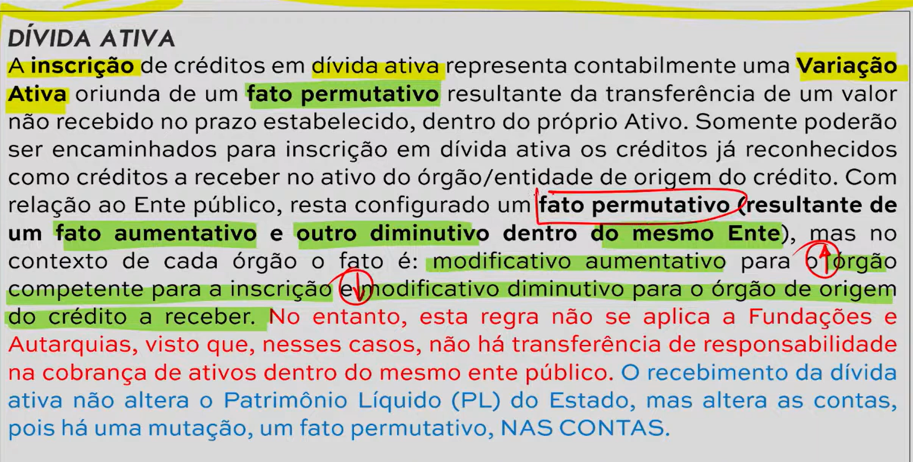 DÍVIDA ATIVA A inscrição de créditos em dívida ativa representa contabilmente uma Variação Ativa oriunda de um fato permutativo resultante da transferência de um valor não recebido no prazo estabelecido, dentro do próprio Ativo. Somente poderão ser encaminhados para inscrição em dívida ativa os créditos já reconhecidos como créditos a receber no ativo do órgão/entidade de origem do crédito. Com relação ao Ente público, resta configurado um fato permutativo (resultante de um fato aumentativo e outro diminutivo dentro do mesmo Ente), mas no contexto de cada órgão fato é: modificativo aumentativo para competente para a inscrição emodificativo diminutivo para órgão de origem do crédito a receber. No entanto, esta regra não se aplica a Fundações e Autarquias, visto que, nesses casos, não há transferência de responsabilidade na cobrança de ativos dentro do mesmo ente público. O recebimento da dívida ativa não altera O Patrimônio Líquido (PL) do Estado, mas altera as contas, pois há uma mutação, um fato permutativo, NAS CONTAS.