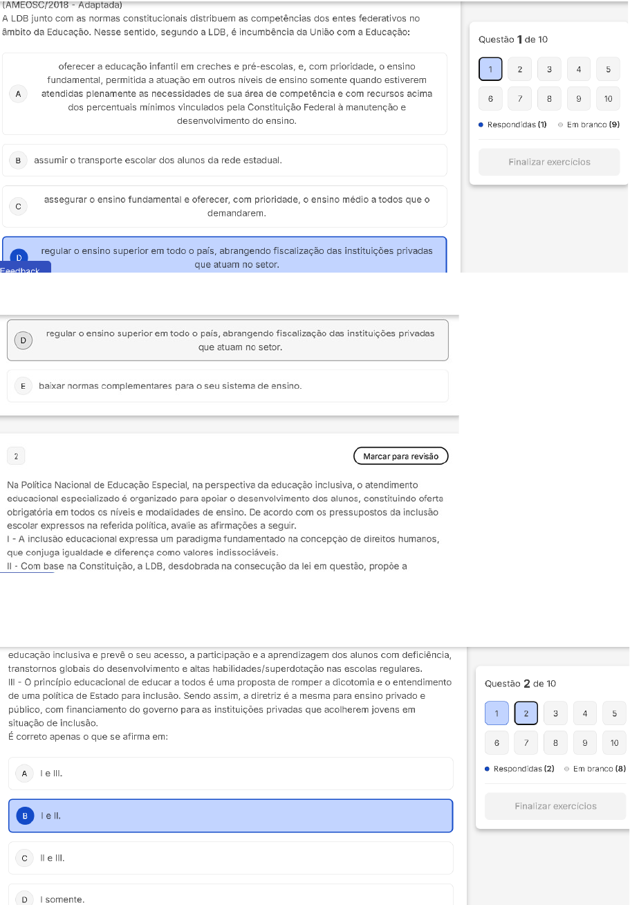 EXERCICIO Tema 2 - Lei de Diretrizes e Bases da Educação Nacional- 9,0 ACERTOS 1 (AMEOSC/2018 – ADAPTADA) A LDB junto com as normas constitucionais distribuem as competências dos entes federativos no âmbito da educação. Nesse sentido, segundo a LDB, é incumbência da união com a educação: LETRA: D 2 Na política nacional de educação especial, na perspectiva da educação inclusiva, o atendimento educacional especializado é organizado para apoiar o desenvolvimento dos alunos, constituindo oferta obrigatória em todos os níveis e modalidades de ensino. De acordo com os pressupostos da inclusão escolar expressos na referida política, LETRA: B 3 Sobre a temática da educação como o direito de todos, assinale a alternativa incorreta LETRA: E 4 Sobre a inclusão educacional, enquanto política pública adotada pelo país para a educação de pessoas com deficiências e transtornos globais de desenvolvimento na escola regular, é incorreto afirmar que: LETRA: D 5 Um dos aspectos previstos na LDB 9394/96 é garantir aos sistemas de ensino autonomia e flexibilidade na organização curricular com o objetivo de propiciar-lhes condições de perceberem as diferentes demandas de seus estudantes e atendê-los de forma equânime. Nesse sentido, a organização da educação básica pode ser: LETRA: E 6 A primeira Constituição Republicana brasileira foi promulgada em 1891, num contexto histórico em que o regime escravocrata ainda vigia. Sobre suas características, assinale a alternativa correta: LETRA: C 7 O fim dos anos 80 e a década de 90 foi um período importante de normativas voltadas para a criança, incluindo, principalmente, a promulgação da constituição da Rebública, que representou verdadeira mudança de paradigma na educação. Sobre o tema, analise as preposições a seguir e a relação entre elas: LETRA: A 8 As diretrizes e bases da educação Nacional (LDB 9394, de 1996) é um marco legislativo na história da educação Brasileiras. Segundo a lei, a composição dos níveis escolaresb que corresponde a educação básica é formada por: LETRA: A 9 O Manifesto dos pioneiros da educação nova foi publicado em 1932 e assinado por 26 educadores brasileiros, entre eles Anísio Teixeira de Azevedo e Lourenço filho. Nos trechos a seguir, aparecem algumas de suas principais ideias. Mas, do direito de cada indivíduo à sua educação integral, decorre logicamente para o Estado que o reconhece e o proclama, o dever de considerar a educação, na variedade dos seus graus e manifestações, como uma função social e eminentemente pública, que ele é chamado a realizar, com a cooperação de todas as instituições sociais.... LETRA: D 10 Com o fim da ditadura civil-militar no Brasil, em 5 de outubro de 1988 foi promulgada a constituição da República, também conhecida como “Constituição cidadã”. Sobre as características da constituição de 1988, analise as preposições abaixo e a relação entre elas. .... LETRA: A image7.png image8.png image9.png image10.png image11.png image12.png image13.png image14.png image15.png image16.png image17.png image1.png image2.png image3.png image4.png image5.png image6.png