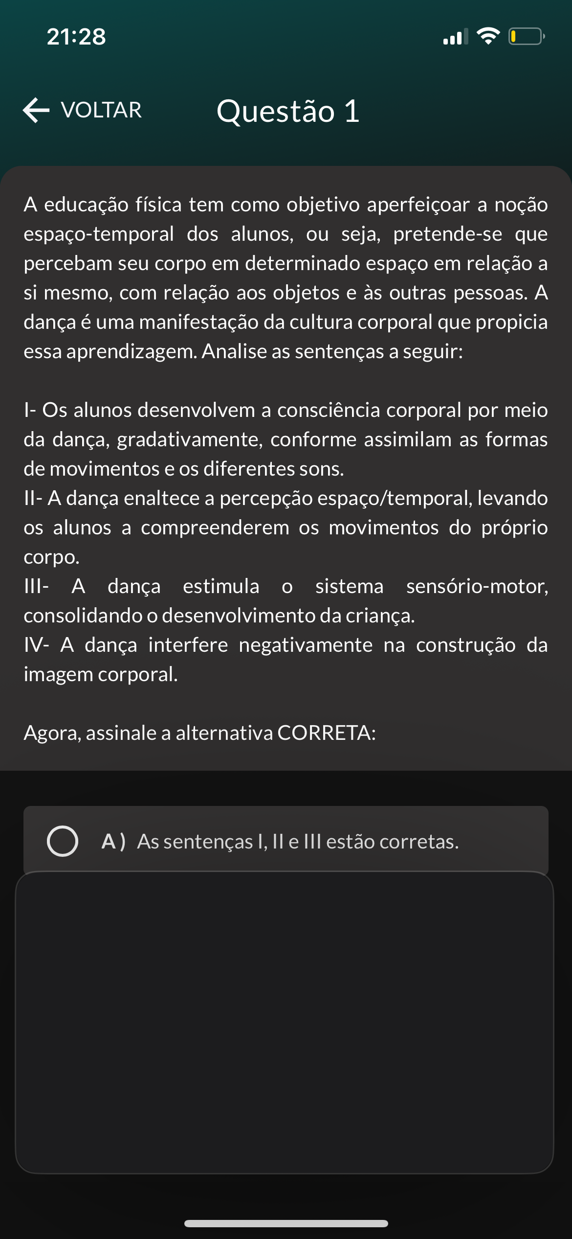 21:28 VOLTAR Questão 1 A educação física tem como objetivo aperfeiçoar a noção espaço-temporal dos alunos, ou seja, pretende-se que percebam seu corpo em determinado espaço em relação a si mesmo, com relação aos objetos e às outras pessoas. A dança é uma manifestação da cultura corporal que propicia essa aprendizagem. Analise as sentenças a seguir: I- Os alunos desenvolvem a consciência corporal por meio da dança, gradativamente, conforme assimilam as formas de movimentos e os diferentes sons. II- A dança enaltece a percepção espaço/temporal, levando os alunos a compreenderem os movimentos do próprio corpo. III- A dança estimula sistema sensório-motor, consolidando desenvolvimento da criança. IV- A dança interfere negativamente na construção da imagem corporal. Agora, assinale a alternativa CORRETA: A) As sentenças I, e III estão corretas.