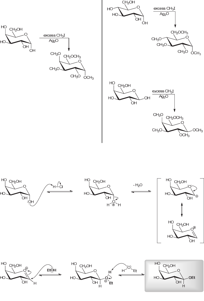 1028 CHAPTER 24 24.24. (a) Upon treatment with excess methyl iodide in the presence of silver oxide, all of the OH groups are converted into methoxy groups, as shown: (b) Upon treatment with excess methyl iodide in the presence of silver oxide, all of the OH groups are converted into methoxy groups, as shown: (c) Upon treatment with excess methyl iodide in the presence of silver oxide, all of the OH groups are converted into methoxy groups, as shown: 24.25. Under acidic conditions, the anomeric OH group can be protonated, giving an excellent leaving group (water). Loss of the leaving group generates a resonance-stabilized cation intermediate. This intermediate can then be attacked by ethanol, giving an oxonium ion, which is then deprotonated to give an acetal: www.MyEbookNiche.eCrater.com