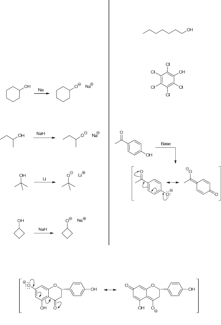 400 CHAPTER 12 12.3. Nonyl mandelate has a longer alkyl chain than octyl mandelate and is therefore more effective at penetrating cell membranes, rendering it a more potent agent. Nonyl mandelate has a shorter alkyl chain than decyl mandelate and is therefore more water-soluble, enabling it to be transported through aqueous media and to reach its target destination more effectively. 12.4. (a) When an alcohol is treated with elemental sodium (Na), the OH group is deprotonated, giving the corresponding alkoxide ion. (b) When an alcohol is treated with sodium hydride (NaH), the OH group is deprotonated, giving the corresponding alkoxide ion. (c) When an alcohol is treated with elemental lithium (Li), the OH group is deprotonated, giving the corresponding alkoxide ion. (d) When an alcohol is treated with sodium hydride (NaH), the OH group is deprotonated, giving the corresponding alkoxide ion. 12.5. (a) The first compound is more acidic because the conjugate base of a primary alcohol will be more easily solvated than the conjugate base of a tertiary alcohol. (b) The first compound is more acidic because the electron-withdrawing effects of the chlorine atoms stabilize the conjugate base. (c) The second compound is more acidic because its conjugate base is more stabilized by resonance, with the negative charge spread over two oxygen atoms, rather than just one oxygen atom. (d) The second compound is more acidic because its conjugate base is stabilized by resonance. In contrast, the conjugate base of the first compound is not resonance-stabilized. 12.6. The hydroxyl group on the benzene ring on the left is expected to be more acidic (lower pKa) because its conjugate base has a resonance structure in which the negative charge is spread onto an oxygen atom of the carbonyl group, as shown below: In contrast, the hydroxyl corresponding to pKa2 does not have such a resonance structure and can only spread its negative charge onto carbon atoms. www.MyEbookNiche.eCrater.com