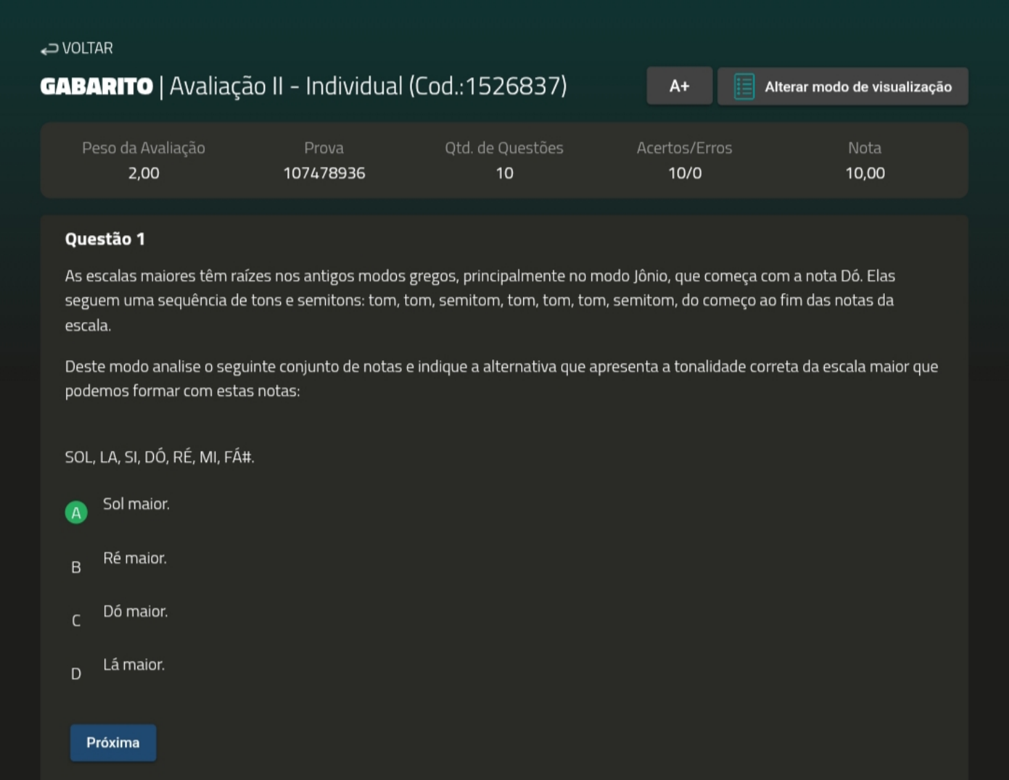 VOLTAR GABARITO Avaliação - Individual (Cod.: 1526837) A+ Alterar modo de visualização Peso da Avaliação Prova Qtd. de Questões Acertos/Erros Nota 2,00 107478936 10 10/0 10,00 Questão 1 As escalas maiores têm raízes nos antigos modos gregos, principalmente no modo Jônio, que começa com a nota Dó. Elas seguem uma sequência de tons e semitons: tom, tom, semitom, tom, tom, tom, semitom, do começo ao fim das notas da escala. Deste modo analise seguinte conjunto de notas e indique a alternativa que apresenta a tonalidade correta da escala maior que podemos formar com estas notas: SOL, LA, SI, DÓ, RÉ, MI, FÁ#. Sol maior. A Ré maior. Dó maior. Lá maior. D PróximaVOLTAR GABARITO Avaliação - Individual (Cod.: 1526837) A+ Alterar modo de visualização Peso da Avaliação Prova Qtd. de Questões Acertos/Erros Nota 2,00 107478936 10 10/0 10,00 Questão 2 Os acordes são parte fundamental da prática musical do teclado que utiliza além da melodia tocada em geral pela mão direita as funções harmônicas musicais, realizadas usualmente pela mão esquerda. 4 4 A partir dos seus conhecimentos sobre os acordes constituintes do campo harmônico e da imagem em anexo, analise as sentenças a seguir: I. Estes acordes referem-se ao campo harmônico de dó menor. II. Os acordes do campo harmônico ilustrado na imagem acima referem-se aos acordes de Dó Maior, Ré Maior, Mi Maior, Fá Maior, Sol Maior, Lá Maior e Si Maior. III. IV° e V° graus deste campo harmônico (Dó Maior, Fá Maior e Sol Maior) referem-se respectivamente à Tônica, Subdominante e Dominante. É correto que se afirma em: A le II, apenas. le III, apenas. II, apenas. D I, apenas. E III, apenas. Anterior PróximaVOLTAR GABARITO Avaliação II - Individual (Cod.: 1526837) A+ Alterar modo de visualização Peso da Avaliação Prova Qtd. de Questões Acertos/Erros Nota 2,00 107478936 10 10/0 10,00 Questão 8 Dentro das funções harmônicas musicais encadeamento de alguns acordes traz efeitos mais ou menos conclusivos à peça musical. Estes encadeamentos de acordes e os efeitos harmônicos por ele produzidos são conhecidos como cadências. Sobre as cadências, analise as afirmativas a seguir: I- A Cadência Perfeita caracteriza-se pela resolução da subdominante diretamente na tônica. II- A Semicadência, também conhecida como Cadência à dominante, consiste em uma cadência perfeita incompleta, em que o apoio final é a dominante. III- A Cadência Plagal é a cadência perfeita completa que tem seguinte encaminhamento: IV Assinale a alternativa CORRETA: As afirmativas e III estão corretas. A Somente a afirmativa I está correta. Somente a afirmativa está correta. As afirmativas e III estão corretas. D Somente a afirmativa III está correta. E Anterior PróximaVOLTAR GABARITO Avaliação - Individual (Cod.:1526837) A+ Alterar modo de visualização Peso da Avaliação Prova Qtd. de Questões Acertos/Erros Nota 2,00 107478936 10 10/0 10,00 Questão 9 0 campo harmônico triádico (chamado de simples) é uma estrutura musical que consiste em acordes básicos, chamados tríades, que estão relacionados entre si dentro de uma tonalidade específica. Esses acordes são a base da harmonia em muitas músicas e proporcionam uma variedade de progressões e texturas sonoras. Com relação ao tema, analise os acordes a seguir e indique a alternativa que apresenta o campo harmônico triádico de mi maior: E F#m G# A C# Dm(b5). A E F#m - G#m - Ab Bm C# Dm(b5). E F#m G# - A Bm C# D#m(b5). E F#m - G#m - A C#m D#m(b5). D Anterior PróximaVOLTAR GABARITO Avaliação II - Individual (Cod.: 1526837) A+ Alterar modo de visualização Peso da Avaliação Prova Qtd. de Questões Acertos/Erros Nota 2,00 107478936 10 10/0 10,00 Questão 10 A formação de um padrão rítmico melódico é determinada por diferentes elementos dentro da teoria musical, que podem aparecer indicados nas partituras. Sobre trecho da música em anexo, representado numa melodia cifrada, analise qual seria padrão rítmico condizente para executar seu acompanhamento no teclado: C G C (I) (II) (III) (IV) Sobre esse padrão, assinale a alternativa CORRETA: I. A II. III. D IV. E AnteriorVOLTAR GABARITO Avaliação Individual (Cod.: 1526837) A+ Alterar modo de visualização Peso da Avaliação Prova Qtd. de Questões Acertos/Erros Nota 2,00 107478936 10 10/0 10,00 Questão 3 Todo acorde diatônico de função secundária se relaciona à função principal vizinha de superior ou inferior, podendo funcionar como seu substituto. Sobre o exposto, analise as sentenças a seguir: Se acorde diatônico de função secundária for Am, acorde de função principal superior é de Dó Maior e acorde de função principal inferior é Fá Maior. II- Se acorde diatônico de função secundária for Em, acorde de função principal inferior é de Sol Maior e acorde de função principal superior é Dó Maior. III- Se acorde diatônico de função secundária for Bm, acorde de função principal inferior é o de Ré Maior e o acorde de função principal superior é Sol Maior. Assinale a alternativa CORRETA: A Somente a sentença está correta. B As sentenças e III estão corretas. As sentenças II e III estão corretas. D Somente a sentença II está correta. E As sentenças le estão corretas. Anterior PróximaVOLTAR GABARITO Avaliação Individual A+ Alterar modo de visualização Peso da Avaliação Prova Qtd. de Questões Acertos/Erros Nota 2,00 107478936 10 10/0 10,00 Questão 7 Para que modo menor pudesse ser mais efetivo com relação à harmonia, inseriu-se um semitom entre os VII VIII graus, elevando um semitom, 0 VII grau da escala menor natural. Essa escala menor que tem 0 VII elevado em relação à escala menor natural é chamada Escala Menor Harmônica. (1) (2) (3) (4) Sobre a escala menor harmônica, observe as escalas da imagem e assinale a alternativa que não representa uma escala menor harmônica: Apenas a escala 2. A Apenas as escalas 1 e 2. Apenas as escal