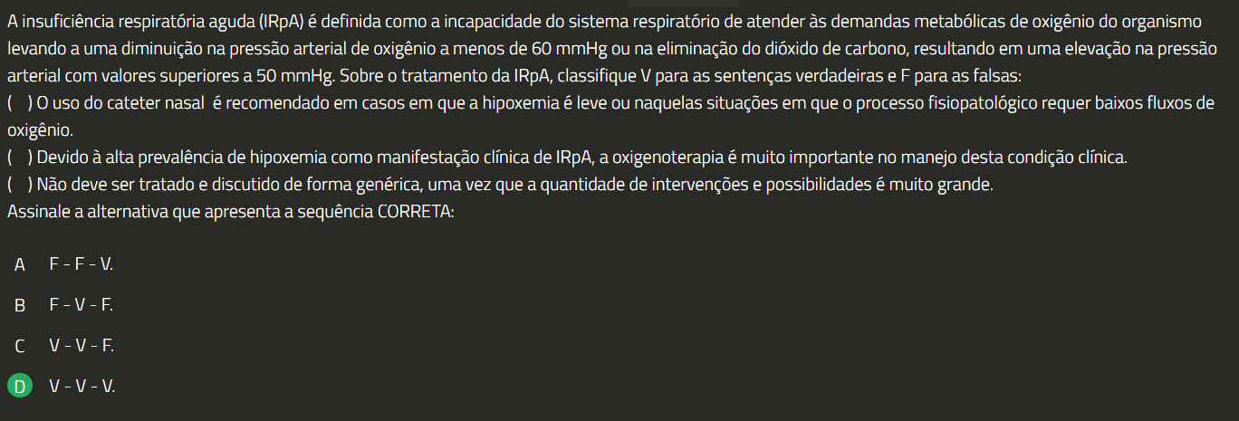 A insuficiência respiratória aguda (IRpA) é definida como a incapacidade do sistema respiratório de atender às demandas metabólicas de oxigênio do organismo levando a uma diminuição na pressão arterial de oxigênio a menos de 60 mmHg ou na eliminação do dióxido de carbono, resultando em uma elevação na pressão arterial com valores superiores a 50 mmHg. Sobre 0 tratamento da IRpA, classifique V para as sentenças verdadeiras e F para as falsas: ( ) 0 uso do cateter nasal é recomendado em casos em que a hipoxemia é leve ou naquelas situações em que 0 processo fisiopatológico requer baixos fluxos de oxigênio. Devido à alta prevalência de hipoxemia como manifestação clínica de IRpA, a oxigenoterapia é muito importante no manejo desta condição clínica. Não deve ser tratado e discutido de forma genérica, uma vez que a quantidade de intervenções e possibilidades é muito grande. Assinale a alternativa que apresenta a sequência CORRETA: A B D V-V-V.