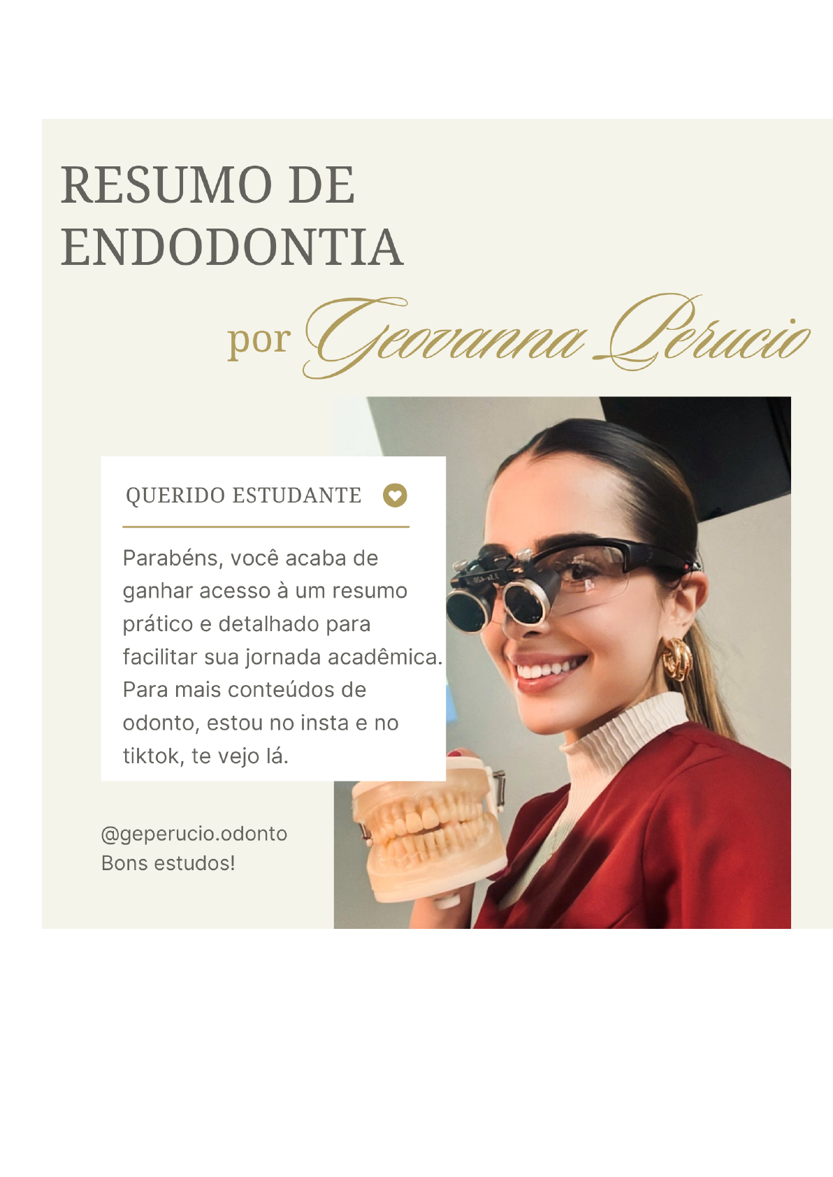 Geo va nn a P eru cio @geperucio.odonto Geo va nn a P eru cio ENDODONTIA ANATOMIA DENTAL INTERNA A cavidade pulpar está dividida em duas partes: câmara pulpar e canal radicular. Geralmente há desvios da direção radicular decorrentes da adaptação da raiz em direção aos vasos sanguíneos e nervos: Teoria da Hemodinâmica (ápice com leve inclinação disto-palatina/disto-lingual). Composição da câmara pulpar A - Assoalho C - Cornos pulpares P - Paredes T - Teto Sistema de canais radiculares @geperucio.odonto Anatomia apical ● CDC - Junção Cemento Dentina Canal ● D - dentina ● C - cemento Atencão: forame, vértice radicular e CDC são coisas diferentes. O forame apical distancia-se do ápice radicular, podendo esta distância variar entre 0,5 à 1,0mm em jovens, chegando a 2-3mm em idosos (o cemento continua sendo depositado ao longo da vida), com maior freqüência para distal. Em uma única raiz pode haver mais de um canal, e esses canais podem apresentar forames diferentes ou se unirem em um único forame apical. Dente Qtd de raízes Canais mais comuns Incisivos Centrais Superiores 1 1 canal Incisivos Laterais Superiores 1 1 canal Incisivos Centrais Inferiores 1 1 canal (2 raramente) Geo va nn a P eru cio Incisivos Laterais Inferiores 1 1 canal (2 raramente) Caninos superiores 1 1 canal Caninos inferiores 1 1 canal (2 raramente) Primeiros Pré-Molares 2 2 canais Segundos Pré-Molares Superiores 1 1 canal (2 às vezes) Primeiros Pré-Molares Inferiores 1 1 canal (2 ás vezes) Segundos Pré-Molares Inferiores 1 1 canal (2 raramente) Primeiros Molares Superiores 3 3-4 canais (MB2 comum) Segundos Molares Superiores 3 3 canais Terceiros Molares Superiores Variável (1-3) Variável (1-3 canais) Primeiros Molares Inferiores 2 3 canais Segundos Molares Inferiores 2 3 canais Terceiros Molares Inferiores Variável (1-2) Variável (1-3 canais) @geperucio.odonto CIRURGIA DE ACESSO Por meio do ponto de eleição (PE), direção de trepanação (DT) e forma de conveniência (FC), com uma broca esférica alcançamos o acesso à câmara pulpar, importante remover todo o teto. Para o desgaste de concrescências, utilizamos broca tronco-cônica de ponta inativa. A localização ou exploração do canal radicular é feita com explorador modificado (ponta reta) para canais amplos ou instrumentos endodõnticos manuais do tipo K, de fino calibre para canais conscritos, de preferência número 15, 21mm, pré-curvados. Para o preparo da entrada do canal ou preparo cervical, utilizamos em lateralidade as brocas de Largo e Gates-Glidden (baixa rotação), respectivamente, de número compatível ao diâmetro do canal. Após a fase de odontometria utilizaremos instrumentos endodônticos - limas, nunca inferior ao número 15, devido à facilidade de visualização radiográfica. No caso de canais conscritos, esvaziar e ampliar com instrumentos 08 e 10 o suficiente para conceder o instrumento número 15. Observar a linha em azul: longo eixo do dente e a verde: linha paralela à face palatina do ICS. O procedimento de trepanação é algo desejável, do contrário seria uma perfuração/acidente. Trepanação: alcançar uma cavidade pré existente - câmara pulpar. Dente Ponto de eleição Direção de trepanação Forma de conveniência Incisivos Próximo ao cíngulo Perpendicular à face palatina ao longo do eixo do dente Triangular de base incisal Geo va nn a P eru cio Caninos Próximo ao cíngulo Perpendicular à face palatina e depois ao longo do eixo do dente Ovalada/forma de chama Pré-molar superior fosseta central Ao longo do eixo do dente Elíptica no sentido vestìbulo- palatino Pré-molar inferior Fosseta mesial Ao longo do eixo do dente Ovalada Molares Superiores Fosseta central Canal palatino ao longo eixo do dente Triangular com base para vestibular Molares Inferiores Fosseta central Canal distal (leve inclinação) Trapezoidal com base maior para mesial Os dentes não citados tendem a ter características semelhantes com os outros da mesma classe. ODONTOMETRIA Para tratarmos endodonticamente um dente é necessário estabelecer seu comprimento e o limite de atuação. A determinação da odontometria é em grande parte passível de erros, provocados desde distorções da técnica radiográfica, falta de contraste e nitidez, medição da radiografia com régua milimetrada, etc. O intuito é obter o valor mais próximo possível do comprimento real do dente. Passo a passo 1 - Radiografia inicialCOM posicionador (Técnica do paralelismo) Erros comuns: Angulação vertical excessiva → dente encurtado Angulação vertical diminuída→ dente alongado 2 -Medir o CAD (comprimento aparente do dente) distância em milímetros da borda incisal ou oclusal até o vértice radiográfico. 3 -Medir o CRI (Comprimento Real do Instrumento). Nesse momento, o dente já deve estar isolado com a cirurgia de acesso feita. A partir do CAD, subtraímos 3mm (medida constante pra todos os dentes como margem de segurança), transferindo o resultado para o instrumento de odontometria: CAD - 3mm=CRI. 4 - Introduz-se no canal a lima calibrado no CRI (através da régua endodôntica milimetrada e limitadores na lima; “stops”) e tiramos a Radiografia para encontrar o X (Técnica da bissetriz excêntrica). Mede-se, com régua milimetrada transparente, o espaço entre a ponta do instrumento e o vértice radiográfico. A esta medida teremos um valorX. (medida que varia de dente pra dente). 5 - Somamos o valor de X com o valor do CRI e obtemos o comprimento real do dente (CRD). CRI + X =CRD 6 - Para dentes com polpa viva subtraímos 1mm do CRD, para dentes com polpa morta subtraímos 0,5mm do CRD como medida de segurança. Sendo assim. teremos nosso comprimento real de trabalho (CRT). 7 - Tiramos a radiografia de confirmação do CRT (técnica da bissetriz excêntrica) para confirmar que a distância do final da lima até o vértice rádiografico seja 0,5mm ou 1mm. Obs 1. Em dentes cariados ou fraturados onde n