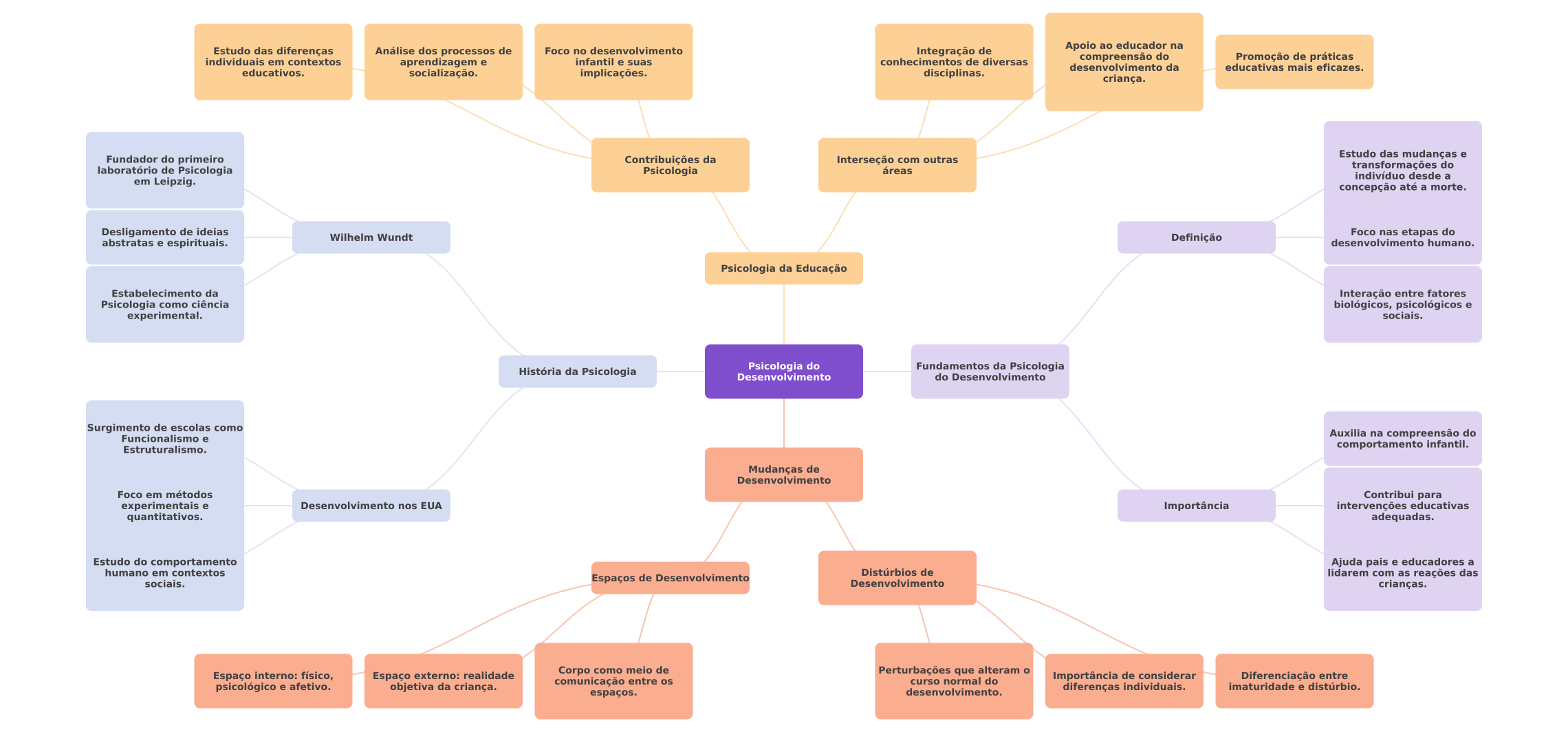 Estudo das diferenças Análise dos processos de Foco no desenvolvimento Integração de Apoio ao educador na individuais em contextos aprendizagem e infantil e suas conhecimentos de diversas compreensão do Promoção de práticas desenvolvimento da educativas mais eficazes. educativos. socialização. implicações. disciplinas. criança. Fundador do primeiro Estudo das mudanças e Contribuições da Interseção com outras laboratório de Psicologia transformações do Psicologia áreas indivíduo desde a em Leipzig. concepção até a morte. Desligamento de ideias Wilhelm Wundt Definição Foco nas etapas do abstratas e espirituais. desenvolvimento humano. Psicologia da Educação Estabelecimento da Interação entre fatores Psicologia como ciência biológicos, psicológicos e experimental. sociais. História da Psicologia Psicologia do Fundamentos da Psicologia Desenvolvimento do Desenvolvimento Surgimento de escolas como Funcionalismo e Auxilia na compreensão do Estruturalismo. comportamento infantil. Mudanças de Desenvolvimento Foco em métodos Contribui para experimentais e Desenvolvimento nos EUA Importância intervenções educativas quantitativos. adequadas. Estudo do comportamento Ajuda pais e educadores a humano em contextos Distúrbios de sociais. Espaços de Desenvolvimento lidarem com as reações das Desenvolvimento crianças. Espaço interno: físico, Espaço externo: realidade Corpo como meio de Perturbações que alteram comunicação entre os curso normal do Importância de considerar Diferenciação entre psicológico e afetivo. objetiva da criança. desenvolvimento. diferenças individuais. imaturidade e distúrbio. espaços.