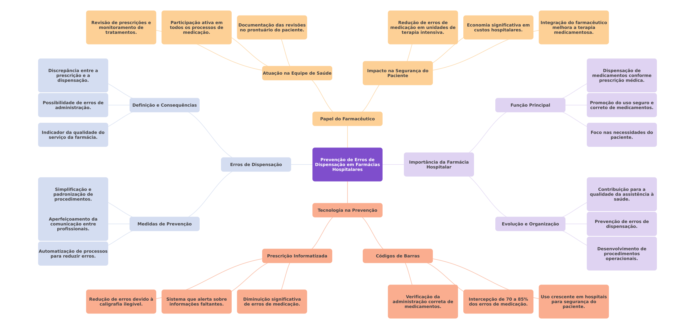 Revisão de prescrições e Participação ativa em monitoramento de Documentação das revisões Redução de erros de Economia significativa em Integração do farmacêutico todos os processos de medicação em unidades de tratamentos. no prontuário do paciente. melhora a terapia medicação. terapia intensiva. custos hospitalares. medicamentosa. Discrepância entre a Atuação na Equipe de Saúde Impacto na Segurança do Dispensação de prescrição e a Paciente medicamentos conforme dispensação. prescrição médica. Possibilidade de erros de administração. Definição e Consequências Função Principal Promoção do uso seguro e correto de medicamentos. Papel do Farmacêutico Indicador da qualidade do Foco nas necessidades do serviço da farmácia. paciente. Prevenção de Erros de Erros de Dispensação Importância da Farmácia Dispensação em Farmácias Hospitalares Hospitalar Simplificação e Contribuição para a padronização de qualidade da assistência à procedimentos. saúde. Tecnologia na Prevenção Aperfeiçoamento da Medidas de Prevenção Prevenção de erros de comunicação entre Evolução e Organização profissionais. dispensação. Desenvolvimento de Automatização de processos para reduzir erros. Prescrição Informatizada Códigos de Barras procedimentos operacionais. Redução de erros devido à Sistema que alerta sobre Diminuição significativa Verificação da Intercepção de 70 a 85% Uso crescente em hospitais informações faltantes. de erros de medicação. administração correta de caligrafia ilegível. medicamentos. dos erros de medicação. para segurança do paciente.