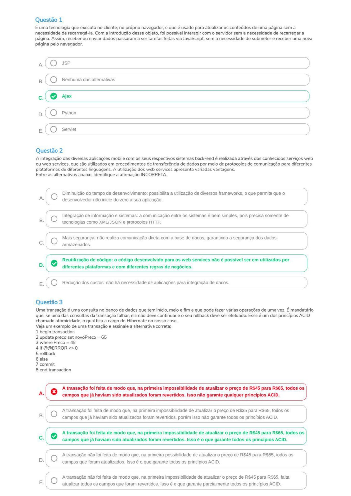 Questão 1 É uma tecnologia que executa no cliente, no próprio navegador, e que é usado para atualizar os conteúdos de uma página sem a necessidade de recarregá-la. Com a introdução desse objeto, foi possível interagir com servidor sem a necessidade de recarregar a página. Assim, receber ou enviar dados passaram a ser tarefas feitas via JavaScript, sem a necessidade de submeter e receber uma nova página pelo navegador. A. JSP B. Nenhuma das alternativas C. Ajax D. Python E. Questão 2 A integração das diversas aplicações mobile com os seus respectivos sistemas back-end é realizada através dos conhecidos serviços web ou web services, que são utilizados em procedimentos de transferência de dados por meio de protocolos de comunicação para diferentes plataformas de diferentes linguagens. A utilização dos web services apresenta variadas vantagens. Entre as alternativas abaixo, identifique a afirmação INCORRETA. Diminuição do tempo de desenvolvimento: possibilita a utilização de diversos frameworks, 0 que permite que A. desenvolvedor não inicie do zero a sua aplicação. Integração de informação e sistemas: a comunicação entre os sistemas é bem simples, pois precisa somente de tecnologias como XML/JSON e protocolos HTTP. Mais segurança: não realiza comunicação direta com a base de dados, garantindo a segurança dos dados C. armazenados. Reutilização de código: código desenvolvido para os web services não é possível ser em utilizados por D. diferentes plataformas e com diferentes regras de negócios. E. Redução dos custos: não há necessidade de aplicações para integração de dados. Questão 3 Uma transação é uma consulta no banco de dados que tem início, meio e fim e que pode fazer várias operações de uma vez. É mandatário que, se uma das consultas da transação falhar, ela não deve continuar e o seu rollback deve ser efetuado. Esse é um dos princípios ACID chamado atomicidade, qual fica a cargo do Hibernate no nosso caso. Veja um exemplo de uma transação e assinale a alternativa correta: 1 begin transaction 2 update preco set novoPreco = 65 3 where Preco 45 4 if @@ERROR 0 5 rollback 6 else 7 commit 8 end transaction A transação foi feita de modo que, na primeira impossibilidade de atualizar preço de R$45 para R$65, todos os A. campos que já haviam sido atualizados foram revertidos. Isso não garante qualquer princípios ACID. A transação foi feita de modo que, na primeira impossibilidade de atualizar 0 preço de R$35 para R$65, todos os B. campos que já haviam sido atualizados foram revertidos, porém isso não garante todos princípios ACID. A transação foi feita de modo que, na primeira impossibilidade de atualizar preço de R$45 para R$65, todos os C. campos que já haviam sido atualizados foram revertidos. Isso é que garante todos os princípios ACID. A transação não foi feita de modo que, na primeira possibilidade de atualizar preço de R$45 para R$65, todos os D. campos que foram atualizados. Isso é que garante todos os princípios ACID. A transação não foi feita de modo que, na primeira impossibilidade de atualizar preço de R$45 para R$65, falta E. atualizar todos campos que foram revertidos. Isso é 0 que garante parcialmente todos os princípios ACID.Questão 4 Os frameworks são extremamente importantes no processo de desenvolvimento pois, entre outras coisas, asseguram modularização e reutilização de código. Isso permite o ganho de tempo, assegurando, por exemplo, cumprimento de prazos. Entre os frameworks disponíveis no mercado, existem vários para utilização com a Linguagem Java. Assinale a alternativa que não representa um framework para essa linguagem: A. Spring B. Hibernates C. JSF D. React E. Quarkus Questão 5 Quanto aos frameworks para Python, analise as afirmativas a seguir e assinale alternativa correta: I) Full-stack esse tipo de framework é empacotado com um extenso conjunto de funcionalidades. objetivo dele é já contemplar um grande conjunto de necessidades que os desenvolvedores presentem para construir aplicações. Dessa forma, o que se busca é oferecer um conjunto amplo de funcionalidades que atenderão o desenvolvimento desde criação de interfaces até procedimentos de segurança, lógica de negócio e conectividade com bancos de dados. II) Django segue o princípio DRY (don't repeat yourself, ou, não se repita). Possui um grande conjunto de funcionalidades oferecidas como parte do framework e não como um conjunto de bibliotecas agrupadas. Por exemplo, Django faz uso de um mecanismo próprio para mapeamento objeto-relacional. III) Web2Py tem uma abordagem ampla também e possui um ambiente integrado de desenvolvimento próprio que conta com editor de código, debugador e desenvolvimento rápido. Apresenta um mecanismo para MVC, recursos para conectividade com banco de dados e internacionalização e localização. Assinale alternativa correta: A. le são verdadeiras I, e III são verdadeiras C. III apenas é verdadeira D. I, e III são falsas E. apenas é verdadeira Questão 6 Um dos frameworks para PHP com maior utilização no mercado. No caso dele, existem vários recursos que facilitam a criação de aplicações e uma clara separação de responsabilidades, as quais buscam estruturar uma arquitetura MVC. É um framework open-source que, em alguns casos, também atua como um middleware. Surgiu em 2011 e oferece vários recursos para administração e desenvolvimento de aplicações tais como: eloquent query reverse routing: restful controllers; unit testing, entre outros. Também tem pacotes que atendem necessidades como cobrança ou assinaturas, infraestrutura, autenticação e autorização, busca textual e autenticação com redes sociais. Estamos falando de qual framework? A. Jasmine B. Bootstrap C. Micronaut D. Laravel E. Spring bootQuestão 7 Analise o código a seguir: 1 print("PROGRAMA PARA IMPRIMIR QUANTIDADE DE NÚMEROS PARES DE UM INTERVALO") 2 