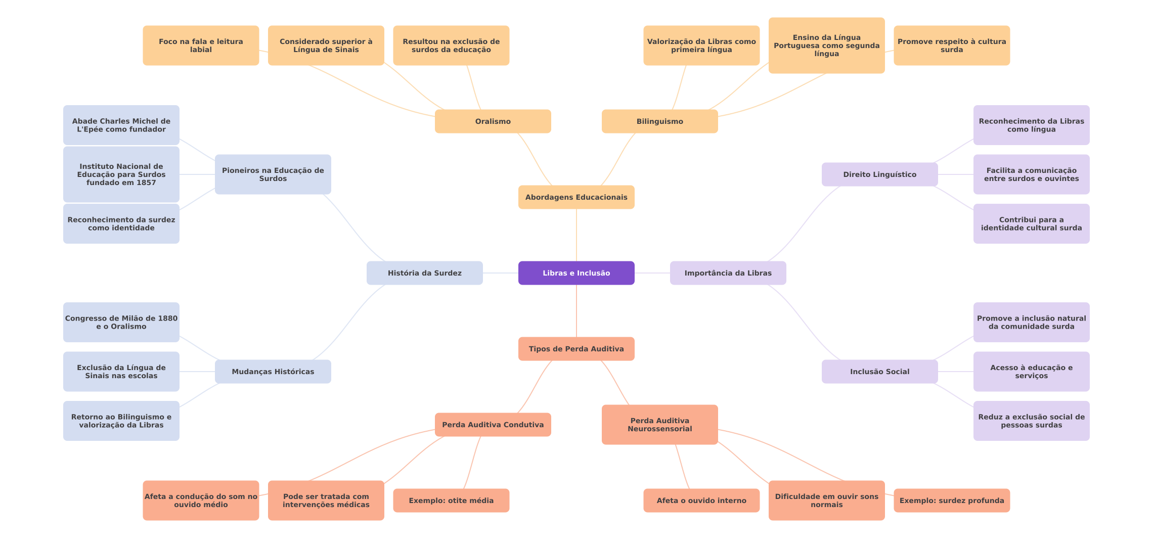 Foco na fala e leitura Considerado superior à Resultou na exclusão de Valorização da Libras como Ensino da Língua labial Língua de Sinais surdos da educação primeira língua Portuguesa como segunda Promove respeito à cultura surda língua Abade Charles Michel de Oralismo Bilinguismo Reconhecimento da Libras L'Epée como fundador como língua Instituto Nacional de Educação para Surdos Pioneiros na Educação de Surdos Direito Linguístico Facilita a comunicação entre surdos e ouvintes fundado em 1857 Abordagens Educacionais Reconhecimento da surdez Contribui para a como identidade identidade cultural surda História da Surdez Libras e Inclusão Importância da Libras Congresso de Milão de 1880 Promove a inclusão natural e Oralismo da comunidade surda Tipos de Perda Auditiva Exclusão da Língua de Mudanças Históricas Inclusão Social Acesso à educação e Sinais nas escolas serviços Retorno ao Bilinguismo e Reduz a exclusão social de Perda Auditiva valorização da Libras Perda Auditiva Condutiva Neurossensorial pessoas surdas Afeta a condução do som no Pode ser tratada com Dificuldade em ouvir sons ouvido médio intervenções médicas Exemplo: otite média Afeta ouvido interno normais Exemplo: surdez profunda