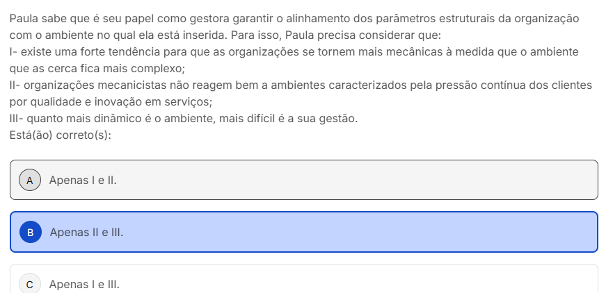 Paula sabe que é seu papel como gestora garantir alinhamento dos parâmetros estruturais da organização com ambiente no qual ela está inserida. Para isso, Paula precisa considerar que: I- existe uma forte tendência para que as organizações se tornem mais mecânicas à medida que ambiente que as cerca fica mais complexo; II- organizações mecanicistas não reagem bem a ambientes caracterizados pela pressão contínua dos clientes por qualidade e inovação em serviços; III- quanto mais dinâmico é O ambiente, mais difícil é a sua gestão. Está(ão) correto(s): A Apenas e II. B Apenas II e III. C Apenas I e III.