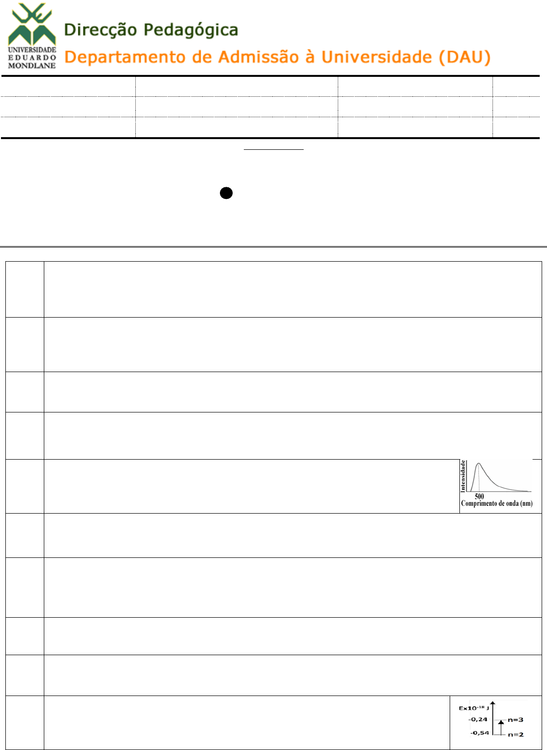 Disciplina 2: FÍSICA I2 Nº Questões: 40 Duração: 90 minutos Alternativas por questão: 5 Ano: 2021 INSTRUÇÕES 1. Preencha as suas respostas na FOLHA DE RESPOSTAS que lhe foi fornecida no início desta prova. Não será aceite qualquer outra folha adicional, incluindo este enunciado. 2. Na FOLHA DE RESPOSTAS, assinale a letra que corresponde à alternativa escolhida pintando completamente o interior do círculo por cima da letra. Por exemplo, pinte assim . 3. A máquina de leitura óptica anula todas as questões com mais de uma resposta e/ou com borrões. Para evitar isto, preencha primeiro à lápis HB, e só depois, quando tiver certeza das respostas, à esferográfica (de cor azul ou preta). Leia o texto com atenção e responda às questões que se seguem. 1. Quais são os mecanismos de transmissão de calor? A. Convecção, contacto e condução. B. Dilatação, condução e fricção. C. Condução, radiação e convecção. D. Fricção, contacto e influência. E. Rarefação, radiação e dilatação. 2. Um líquido é aquecido através de uma fonte térmica que fornece 25 calorias por minuto. Observa-se que 100 g deste líquido se aquecem de 10 °C em 10 min. Qual é, em cal/ (g °C), o calor específico do líquido? A. 0,25 B. 0,40 C. 0,50 D. 2,50 E. 4,80 3. O pico da curva espectral de um corpo negro ocorre a uma frequência de 5,5.1014 Hz. Qual é, em Kelvin, a temperatura desse corpo negro? (c=3.108 m/s, b=3.10-3 SI) A. 4000 B. 5000 C. 5500 D. 6000 E. 6500 4. Os comprimentos de onda máximos respeitantes aos picos das curvas espectrais de dois corpos negros às temperaturas T1=800K e T2=3200K, são, respectivamente, λ1 e λ2. Qual é a razão ? A. 0,25 B. 0,50 C. 2 D. 3 E. 4 5. O gráfico mostra a curva espectral de um corpo negro. Qual é, em Kelvin, a temperatura a que ele se encontra? (b = 3.10-3 SI) A. 2000 B. 3000 C. 4000 D. 6000 E. 8000 6. Duas estrelas X e Y têm temperaturas superficiais de 6000 K e 3000 K, respectivamente. Qual é a relação entre as intensidades IX e IY das radiações emitidas pelas estrelas X e Y? A. IX=2IY B. IX=16IY C. IX=32IY D. IX=64IY E. IX=256IY 7. Qual das alternativas seguintes, apresenta apenas ondas exclusivamente electromagnéticas? A. Raios x, raios gama, ultravioleta. B. Infravermelho, ondas de rádio, som. C. Luz visível, ultravioleta, som. D. Ultravioleta, raios gama, infrassom. E. Ondas de rádio, infravermelho, ultrassom. 8. Qual das cores do espectro visível apresenta maior frequência? A. Vermelho B. Amarelo C. Verde D. Azul E. Violeta 9. Um laser emite um pulso de luz monocromático com duração de 6 ns, com frequência de 4.1014 Hz e potência de 110 mW. Qual é o número de fotões contidos nesse pulso? (h = 6,6 x 10-34 J.s) A. 2,5.109 B. 2,5.1012 C. 6,9.1013 D. 2,5.1014 E. 4,2.1014 10. Qual é, em nanómetros, o comprimento de onda associado à energia envolvida na transição mostrada na figura? (h = 6,6.10-34 SI, C= 3.108 m/s ) A. 330 B. 440 C. 550 D. 660 E. 770 21 /ll Exame de admissão de Física I2 - 2021 DAU Página 2 de 4 11. O diagrama mostra os níveis de energia (n) num dado átomo. Qual das transições mostradas na figura representa a absorção de um fotão com o maior comprimento de onda? A. I B. II C. III D. IV E. V 12. O gráfico representa a variação do potencial de corte em função da frequência para um material fotoeléctrico. Qual é, em eV, a função trabalho do material? (h = 4.10-15 eV) A. -1 B. 0,25 C. 1 D. 2 E. 3 13. Quando a luz de comprimento de onda de 450 nm incide no potássio, fotoelectrões com potencial de corte de 0.52 V são emitidos. Se o comprimento de onda da luz incidente é mudado para 300 nm, o potencial de corte é 1.90 V. Qual é, em eV, o valor da função trabalho do potássio? A. 2,24 B. 3,24 C. 3,11 D. 4,11 E. 5,55 14. A função trabalho dum dado material é de 5,3 eV. Qual é, em Joules, a energia cinética máxima dos fotoelectrões emitidos quando nele se faz incidir uma radiação de 3x1015 Hz? (h = 4,1.10-15eV.s) A. 1 B. 3 C. 5 D. 7 E. 9 15. A radiação de comprimento de onda l = 150 nm incide sobre uma superfície metálica, para a qual são necessários 6,28 eV para remover um electrão. Qual é, em eV, o potencial de corte? (h = 4,14.10-15 eV.s , c= 3.108 m/s) A. 1 B. 2 C. 3 D. 4 E. 5 16. Qual é, em kV, a voltagem mínima que deve ser aplicada a um tubo de raios X para que sejam produzidos raios X com o comprimento de onda de 1 Å? (h = 4,14.10-15 eV.s , c=3.108 m/s , e =1,6.10-19C ) A. 10,12 B. 10,42 C. 11,12 D. 11,70 E. 12,42 A. 0,60 17. Para uma tensão máxima de 40 kV em um aparelho radiográfico, o comprimento de onda mínimo de um raio X é de 0,3 Å. Qual será, em Angstrons, o comprimento de onda mínimo dos raio X se a tensão aplicada for de 80 kV? A. 0,10 B. 0,15 C. 0,20 D. 0,25 E. 0,50 18. A radioatividade emitida por determinadas amostras de substâncias provém… A. Da energia térmica libertada em sua combustão. B. De rupturas de ligações químicas entre os átomos que as formam. C. Do escape de electrões das electrosferas de átomos que as formam. D. De alterações em núcleos de átomos que as formam. E. Da reorganização de átomos que ocorre em sua decomposição. 19. O defeito de massa para o núcleo de hélio é 0,0303 u.m.a. Qual é em MeV , a energia de ligação do núcleo de hélio? ( 1 u.m.a= 9,3 x 102 MeV) A. 8,2 B. 12,4 C. 28,2 D. 212,1 E. 327,3 20. Um núcleo de Berío-9 pode ser formado pela junção de 4 protões e 5 neutrões, como mostra a reacção: . Qual é, em u.m.a, o defeito de massa? A. 0,06027 B. 0,6027 C. 60,27 D. 602,7 E. 6027,7 Partícula Massa(u.m.a) Protão 1,00728 Neutrão 1,00867 Berílio 9,0122 21. Suponha-se que seja tecnologicamente possível converter massa em energia eléctrica. Qual seria em gramas, a massa para produzir 72x106 kwh de energia? (1 kWh = 3,6 x 106J , c = 3,0 x 108m/ s) A. 0,88 B. 1,88 C. 2,88 D. 3,80 E. 4,12 22. Na sequência radioactiva: 84216M → 82212N → 83212O → 842