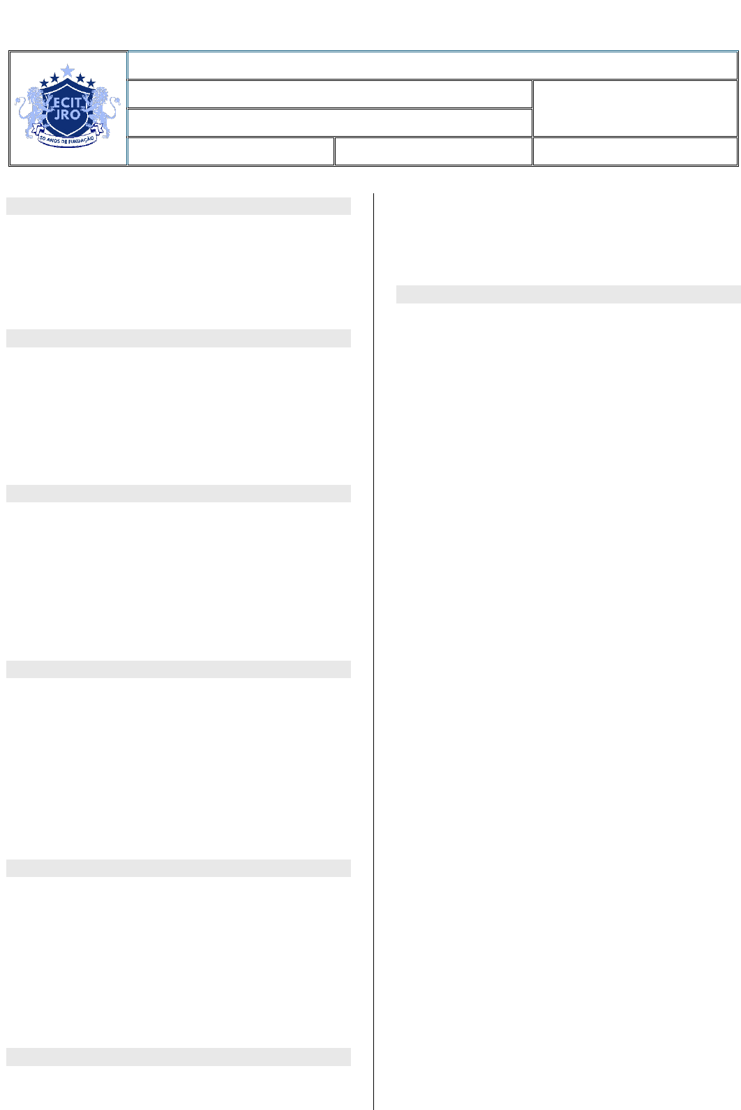 ESCOLA CIDADÃ INTEGRAL TÉCNICA JOSÉ ROLDERICK DE OLIVEIRA PROFESSOR(A): Maria Salete TURMA: ALUNO (A): PERÍODO: 3º DATA: ___/___/2025 DISCIPLINA: Sociologia QUESTÃO 01 A Independência do Brasil foi proclamada em que ano: ________________________________________ ________________________________________ QUESTÃO 02 Quem proclamou a Independência do Brasil? A) Dom João VI B) Tiradentes C) Dom Pedro I D) Marechal Deodoro da Fonseca E) José Bonifácio QUESTÃO 03 O episódio conhecido como “Grito do Ipiranga” ocorreu: A) Às margens do Rio São Francisco B) Às margens do Rio Ipiranga C) Na cidade do Rio de Janeiro D) No interior de Pernambuco E) Em Lisboa QUESTÃO 04 Após a independência, o Brasil adotou a forma de governo: A) República Federativa B) Monarquia Constitucional C) Ditadura Militar D) República Parlamentarista E) Monarquia Absolutista QUESTÃO 05 A Constituição de 1824, a primeira do Brasil, foi marcada por: A) Extinção da escravidão B) Adoção do presidencialismo C) Criação do Poder Moderador D) Direito ao voto universal E) Implantação da República QUESTÃO 06 A democracia no Brasil só se consolidou com: A) A independência do Brasil em 1822 B) A Constituição de 1824 C) A proclamação da República em 1889 D) A Constituição de 1988 E) A Lei Áurea de 1888 QUESTÃO 07 A Constituição Federal de 1988 é conhecida como: A) Constituição Cidadã B) Constituição Popular C) Carta de Liberdade D) Constituição Republicana E) Carta Magna de Ouro Preto. BOA PROVA