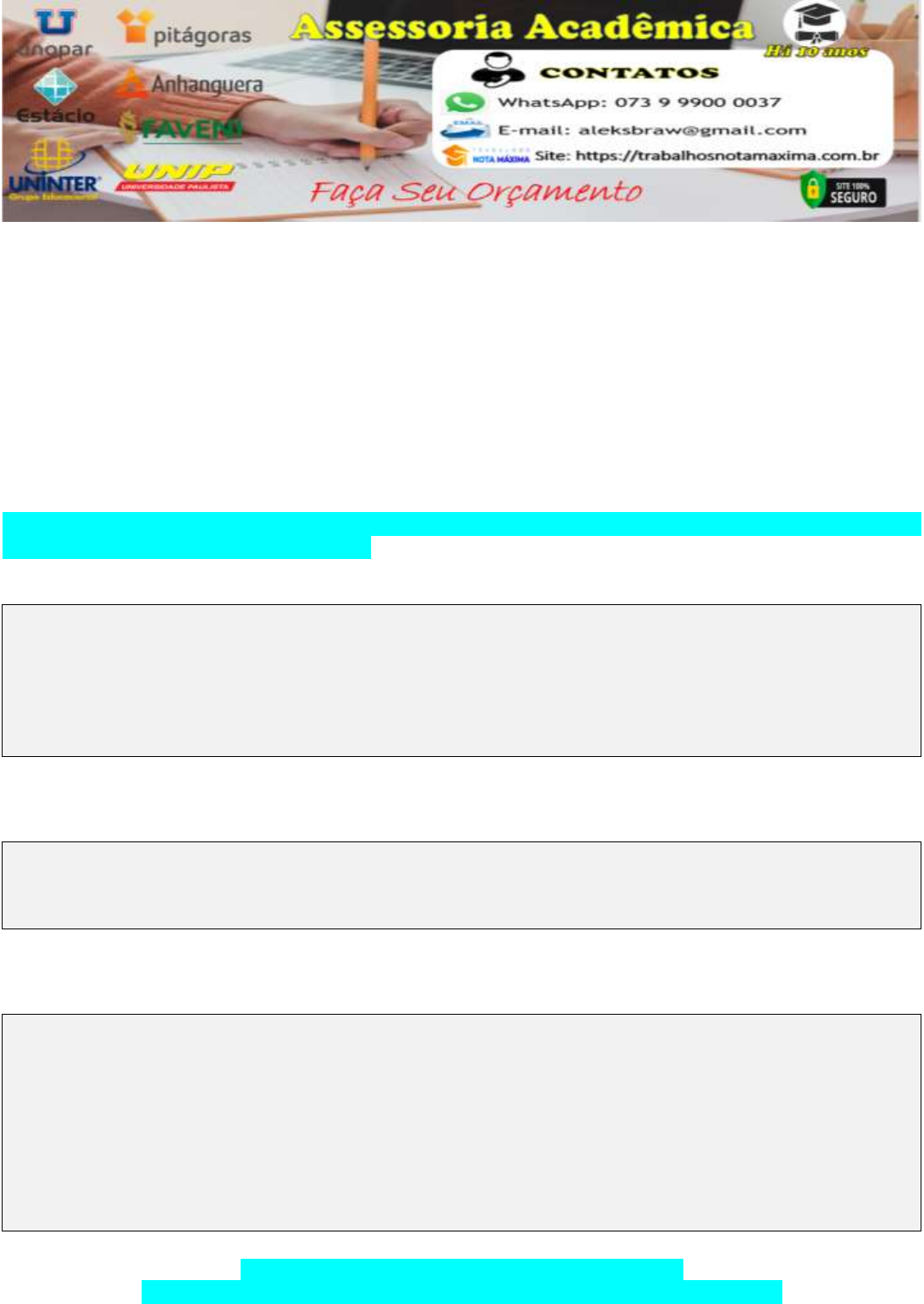 Já imaginou sempre tirar NOTA MÁXIMA em seu Portfólio assim como os demais Cursistas fazem sem precisar quebrar cabeça e perder noites confeccionando-o? Então, seja muito bem vindo(a), meu nome é ALEX, sou especialista em confecção de TRABALHOS ACADEMICOS na área Ciências Contábeis, Economia, Administração, Gestão Financeira, Gestão Comercial, Gestão Púbica, Educação Física, Serviço Social, Produção Industrial, Negócios Imobiliários entre outros Cursos da UNOPAR, ANHNAGUERA, FAVENI, ESTACIO, UNIASSELVI, UNIP, UNINTER. Estou no mercado há 10 (DEZ) anos, tenho muitos clientes satisfeito Graças a DEUS. Estou aqui para te ajudar a tirar uma nota máxima em seu trabalho acadêmico e já tenho pronto para envio este: RELATÓRIO FINAL - PROJETO DE EXTENSÃO II - CIÊNCIAS CONTÁBEIS - PROGRAMA DE INOVAÇÃO E EMPREENDEDORISMO. FINALIDADE E MOTIVAÇÃO: A realização da extensão universitária do curso de Ciências Contábeis vinculada ao Programa de Inovação e Empreendedorismo, oportuniza contribuições à solução de problemas diversificados, presentes no contexto social, e ao desenvolvimento local ou regional, sendo que a inovação e o empreendedorismo podem oferecer importante impactos econômico e produtivo e, dessa forma, o novo saber e o desenvolvimento de competências e soft skills específica do corpo discente do curso são potencializados. As ações poderão ser realizadas em locais diversos, como: Empresa Privada, Estabelecimento de Microempreendedor (MEI), Associação de Bairro, Escolas, Associações Comerciais, Receita Federal, Sebrae. COMPETÊNCIAS: I - Exercer as funções contábeis utilizando adequadamente a terminologia e a linguagem da ciência contábil; II - Interpretar e aplicar as normatizações, os pronunciamentos e as legislações inerentes à contabilidade, gerando informações para o processo decisório; III - Elaborar pareceres e relatórios, valendo-se da quantificação de informações. PERFIL DO EGRESSO: A IES idealizou um perfil do egresso para o curso de Ciências Contábeis que permite a formação de um profissional que tenha como pressupostos essenciais um perfil generalista, crítico, propositivo, dinâmico, humanístico e reflexivo, capaz de atuar como profissional ético, produzindo informações contábeis que subsidiem os usuários para a tomada de decisões, pronto para exercer as funções contábeis com conhecimento e proficiência técnica e científica, sendo que, pelas atividades extensionistas vinculadas ao Programa de Inovação e Empreendedorismo, esse egresso poderá desenvolver habilidades, com domínio científico e intelectual, com capacidade para empreender no negócio e na sua carreira e conduzir atividades relacionadas à compreensão da realidade social, cultural e econômica do meio em que está inserido, contribuindo com a promoção da transformação da realidade e do desenvolvimento da inovação, do emprego e dos negócios. CASO TENHA INTERESSE ENTRE EM CONTATO: WhatsApp: 073 99900 0037 ou pelo E-mail: aleksbraw@gmail.com