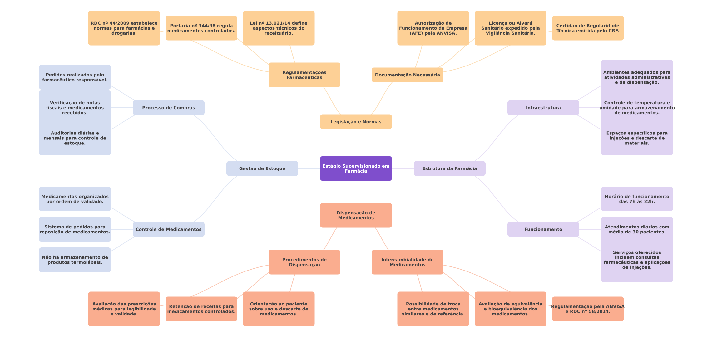 RDC 44/2009 estabelece Lei 13.021/14 define Portaria 344/98 regula Autorização de Licença ou Alvará medicamentos controlados. Funcionamento da Empresa Certidão de Regularidade normas para farmácias e aspectos técnicos do Sanitário expedido pela drogarias. receituário. (AFE) pela ANVISA. Vigilância Sanitária. Técnica emitida pelo CRF. Pedidos realizados pelo Regulamentações Ambientes adequados para Farmacêuticas Documentação Necessária atividades farmacêutico responsável. e de dispensação. Verificação de notas Controle de temperatura e fiscais e medicamentos Processo de Compras Infraestrutura midade para armazenamento recebidos. de medicamentos. Legislação e Normas Auditorias diárias e Espaços específicos para mensais para controle de injeções e descarte de estoque. materiais. Gestão de Estoque Estágio Supervisionado em Estrutura da Farmácia Farmácia Medicamentos organizados Horário de funcionamento por ordem de validade. das 7h às 22h. Dispensação de Medicamentos Sistema de pedidos para Atendimentos diários com Controle de Medicamentos Funcionamento reposição de medicamentos. média de 30 pacientes. Serviços oferecidos Não há armazenamento de incluem consultas Procedimentos de de produtos termolábeis. Dispensação Medicamentos farmacêuticas e aplicações de injeções. Avaliação das prescrições Orientação ao paciente Possibilidade de troca Avaliação de equivalência médicas para legibilidade Retenção de receitas para sobre uso e descarte de entre medicamentos e bioequivalência dos Regulamentação pela ANVISA medicamentos controlados. e RDC 58/2014. e validade. medicamentos. similares e de referência. medicamentos.