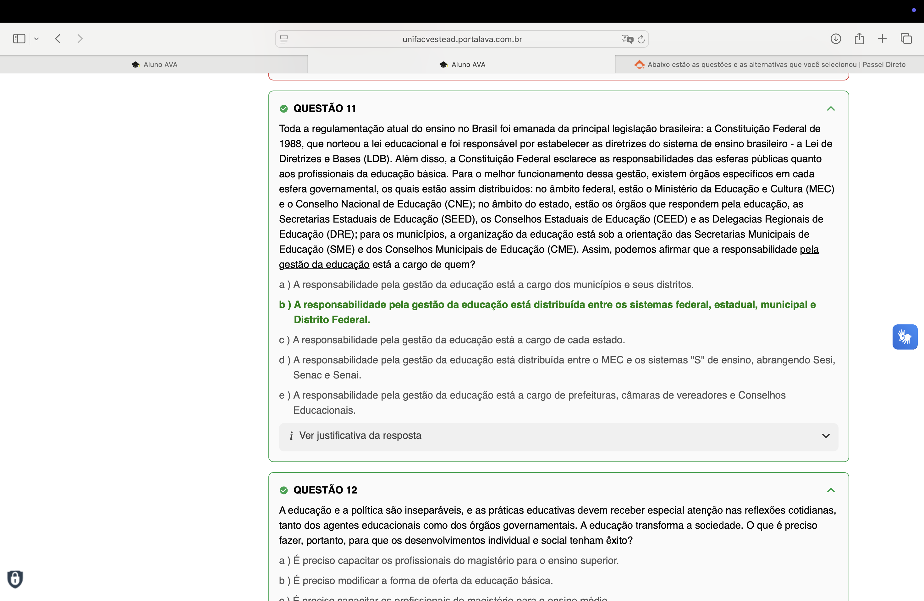 unifacvestead.portalava.com.br + Aluno AVA Aluno AVA Abaixo estão as questões e as alternativas que você selecionou Passei Direto QUESTÃO 11 Toda a regulamentação atual do ensino no Brasil foi emanada da principal legislação brasileira: a Constituição Federal de 1988, que norteou a lei educacional e foi responsável por estabelecer as diretrizes do sistema de ensino brasileiro a Lei de Diretrizes e Bases (LDB). Além disso, a Constituição Federal esclarece as responsabilidades das esferas públicas quanto aos profissionais da educação básica. Para o melhor funcionamento dessa gestão, existem órgãos específicos em cada esfera governamental, os quais estão assim distribuídos: no âmbito federal, estão o Ministério da Educação e Cultura (MEC) e o Conselho Nacional de Educação (CNE); no âmbito do estado, estão os órgãos que respondem pela educação, as Secretarias Estaduais de Educação (SEED), os Conselhos Estaduais de Educação (CEED) e as Delegacias Regionais de Educação (DRE); para os municípios, a organização da educação está sob a orientação das Secretarias Municipais de Educação (SME) e dos Conselhos Municipais de Educação (CME). Assim, podemos afirmar que a responsabilidade pela gestão da educação está a cargo de quem? a ) A responsabilidade pela gestão da educação está a cargo dos municípios e seus distritos. b) A responsabilidade pela gestão da educação está distribuída entre os sistemas federal, estadual, municipal e Distrito Federal. c) A responsabilidade pela gestão da educação está a cargo de cada estado. d) A responsabilidade pela gestão da educação está distribuída entre o MEC e os sistemas "S" de ensino, abrangendo Sesi, Senac e Senai. e ) A responsabilidade pela gestão da educação está a cargo de prefeituras, câmaras de vereadores e Conselhos Educacionais. i Ver justificativa da resposta QUESTÃO 12 A educação e a política são inseparáveis, e as práticas educativas devem receber especial atenção nas reflexões cotidianas, tanto dos agentes educacionais como dos órgãos governamentais. A educação transforma a sociedade. que é preciso fazer, portanto, para que os desenvolvimentos individual e social tenham êxito? a) É preciso capacitar os profissionais do magistério para o ensino superior. b) É preciso modificar a forma de oferta da educação básica. É