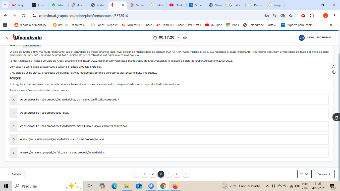 Login dns Portal Settin dell in Bluet Supor Nova G talho G Pesqu G + X ceadvirtual.grupoa.education/plataforma/course/3578516 g reddit: a primeira p... 6m:17s Eobot Deposit Torrents BJ-Share Home BJ-Share Gmail YouTube Maps Uniandrade Portal... Suporte para Inspir... Uniandrade 00:17:20 GM GILSON LUIS FERREIRA M... 0,400 ciclo de Krebs é uma via muito importante que é controlada de modo dinâmico pelo nivel celular de de adenina (ADP e ATP). Após iniciado 0 sua regulação é muito importante. Três fatores controlam a velocidade do fluxo por meio do ciclo: quantidade de acúmulo de produtos e inibição alostérica retroativa das primeiras enzimas do ciclo. Fonte: Regulação e Inibição do Ciclo de Krebs. Disponível em: http://www.ledson.ufla.br/respiracao_plantas/ciclo-de-krebs/regulacao-e-inibicao-do-ciclo-de-krebs/.Aceso em: 20 jul 2022. Com base no texto avalie as asserções a seguir e a relação proposta entre No ciclo do ácido a regulação de enzimas nas vias metabólicas por meio de efetores alostéricos é muito importante. i PORQUE II. A regulação das através de mecanismos alostéricos e evita de uma superprodução de Sobre as assinale a alternativa correta. A As asserções e II são proposições verdadeiras, e a II é uma justificativa correta da B As asserções e II são proposições falsas. C As asserções e II são proposições verdadeiras, mas a II não é uma justificativa correta da D A asserção é uma proposição e a II é uma proposição falsa. E A asserção é uma proposição falsa, e a II é uma proposição verdadeira. Anterior 3/5 > POR 21:23 Pesquisar 20°C Parc. nublado PTB2 04/10/2025 4