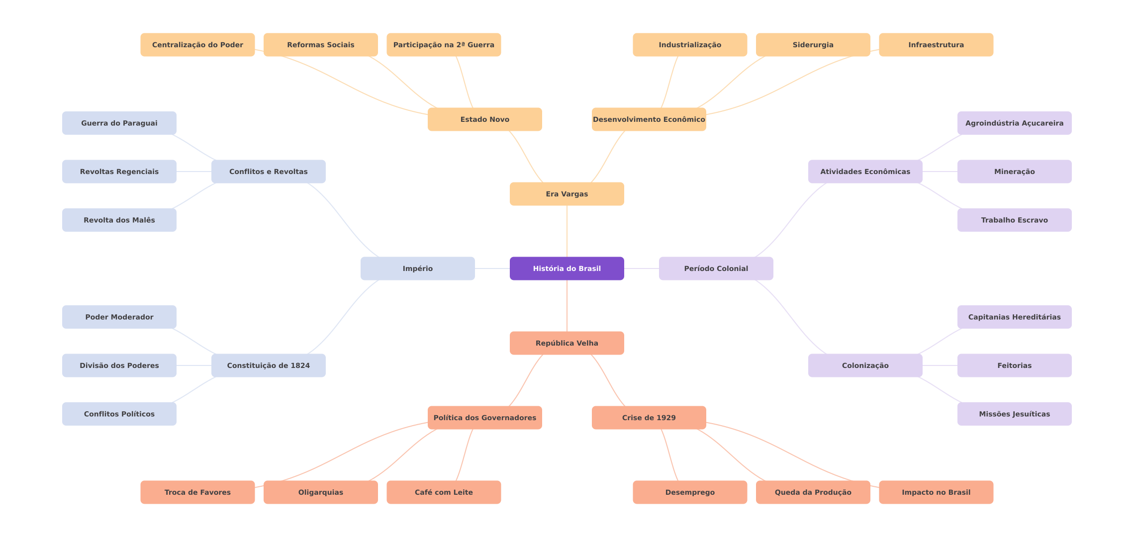 Centralização do Poder Reformas Sociais Participação na Guerra Industrialização Siderurgia Infraestrutura Estado Novo Desenvolvimento Econômico Guerra do Paraguai Agroindústria Açucareira Revoltas Regenciais Conflitos e Revoltas Atividades Econômicas Mineração Era Vargas Revolta dos Malês Trabalho Escravo Império História do Brasil Período Colonial Poder Moderador Capitanias Hereditárias República Velha Divisão dos Poderes Constituição de 1824 Colonização Feitorias Conflitos Políticos Política dos Governadores Crise de 1929 Missões Jesuíticas Troca de Favores Oligarquias Café com Leite Desemprego Queda da Produção Impacto no Brasil