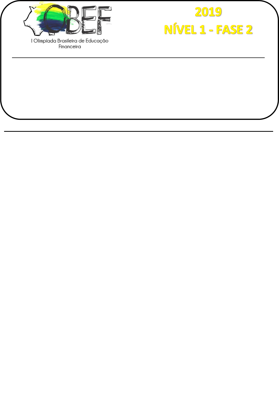 QUESTÕES DE MÚLTIPLA ESCOLHA 1.Thiago e seus três vizinhos queriam comprar uma bola para jogar na quadra do condomínio, para isso, cada um deu R$ 7,00. Sobraram R$ 4,00 de troco que devem ser devolvidos de forma igual para cada um que contribuiu. Quanto custou a bola e quanto cada um recebeu de volta? a) A bola custou R$ 32 e cada um recebeu de volta R$ 2,00. b) A bola custou R$ 33 e cada um recebeu de volta R$ 1,50. c) A bola custou R$ 26 e cada um recebeu de volta R$ 1,00. d) A bola custou R$ 24 e cada um recebeu de volta R$ 1,00. e) A bola custou R$ 28 e cada um recebeu de volta R$ 2,00. 2. Pedro está preocupado com a alta conta de água que está pagando a cada mês em sua casa. Para diminuir o valor da conta, ele e sua família decidiram começar a economizar água em casa. Qual dessas ações representa melhor uma economia de água? a) Lavar a calçada com mangueira. b) Escovar os dentes com a torneira aberta. c) Usar a máquina de lavar todos os dias. d) Fechar as torneiras e chuveiros quando não estiverem sendo usadas. e) Tomar banhos longos. 3. Larissa foi ao supermercado e comprou 10 biscoitos, cada um custava R$ 3,00. Ao passar no caixa, a atendente informou que o biscoito estava na promoção e cada um saiu por R$ 2,25. Larissa pagou com uma nota de R$ 50,00. Quanto custaram todos os biscoitos e quanto ela recebeu de troco? a) Os biscoitos custaram R$ 25,00 e ela recebeu de troco R$ 22,50 b) Os biscoitos custaram R$ 22,50 e ela recebeu de troco R$ 27,50 c) Os biscoitos custaram R$ 22,50 e ela recebeu de troco R$ 23,50 d) Os biscoitos custaram R$ 27,50 e ela recebeu de troco R$ 22,50 e) Os biscoitos custaram R$ 20,50 e ela recebeu de troco R$ 25,50 4. Betina tem R$ 7,00 em moedas de R$ 0,25. Quantas moedas ela tem? a) 14 moedas b) 24 moedas c) 26 moedas d) 28 moedas e) 30 moedas INSTRUÇÕES 1. A prova contém quinze (15) questões: doze (12) questões do tipo múltipla escolha e três (3) questões abertas. 2. Para responder às questões de múltipla escolha, identifique APENAS UMA ÚNICA alternativa correta e marque a letra correspondente no gabarito existente na Folha de Respostas. 3. Para responder às questões abertas, utilize APENAS o espaço destinado para cada uma das questões na Folha de Respostas. 4. A prova tem duração de três (3) horas. Você somente poderá entregar a prova após ter transcorrido uma hora do início. 5. Maria possui um caderninho onde organiza todas as suas receitas e despesas financeiras. Dentre os gastos feitos por Maria no mês de junho, qual deles não representa uma necessidade? a) Alimentação b) Energia Elétrica c) Compra de celular d) Mensalidade escolar e) Compra de medicamentos 6. Na escola do Marcos todo final de ano acontece a Festinha de Natal e nesse dia tem um amigo secreto. Ele tem na carteira a quantia de R$ 67,40. Ele precisa comprar o presente e ainda comprar o ingresso da festinha, que custa R$ 15,60. Qual presente ele poderá escolher? Marque a alternativa correta: a) presentes ( B ) e ( C ) b) presentes ( B ) e ( A ) c) apenas presente ( A ) d) apenas presente ( B ) e) apenas presente ( C ) 7. Qual animal representa o cofre onde as pessoas costumam juntar moedas? a) Coelho b) Elefante c) Rinoceronte d) Porco e) Hipopótamo 8. Larissa e Nicole são irmãs e precisam ir à livraria comprar seu material escolar. Elas não têm carro e o local fica longe da casa delas. Quais opções abaixo seriam mais econômicas para as duas: I) 4 passagens de ônibus no valor de R$ 3,60 II) 2 corridas de Uber de R$ 7,20 III) 2 corridas de Táxi de R$ 10,50 a) Opções I ou II b) Opções II ou III c) Opção I ou III d) Apenas Opção II e) Apenas Opção III 9. Observando a Turma da Mônica podemos identificar que: Fonte: https://www.folhadecapanema.com.br/noticia/o rcamento-familiar-e-tema-da-segunda-edicao-da- serie-especial-de-gibis-da-turma-da-monica a) A turma da Mônica está elencando as suas receitas. b) A turma está se reunindo para tratar sobre suas Despesas. c) A turma está fixando receitas e despesas. d) Mônica ensina como tratar sobre receitas fixas. e) A Magali ensina sobre Lucro. ( A ) ( B ) ( C ) R$ 53,80 R$ 42,80 R$ 51,80 10. Carla, José e Lucas tiveram a brilhante ideia de poupar dinheiro para comprar seus próprios presentes de Natal e resolveram fazer uma contagem quando chegasse no meio do ano para ver quem tinha arrecadado mais. Joana e Luana também quiseram participar. CARLA JOSÉ LUCAS JOANA LUANA Assinale abaixo a alternativa correta. a) Joana poupou R$ 200,00. b) Carla juntou R$ 32,00. c) Lucas foi o que menos arrecadou. d) José arrecadou o dobro do que Luana juntou. e) Carla e Luana pouparam a mesma quantidade. 11. Luiz deu a sua filha Luísa um cofre de presente. Ele prometeu que se ela juntasse dinheiro no cofre, ganharia o dobro do que juntou. Então, Luísa economizou durante três meses para comprar seu patinete. A imagem mostra a quantidade de moedas que Luísa conseguiu juntar em seu cofrinho. Qual o valor total que ela irá receber para comprar seu patinete? a) R$ 32,00 b) R$ 27,00 c) R$ 21,50 d) R$ 16,00 e) R$ 14,50 12. Marque a alternativa que indique as definições de gastos necessários, supérfluos e desperdício, respectivamente: A – São os gastos que não geram bem-estar nem estão ligados às necessidades ou aos desejos; B – São os gastos considerados importantes; C – São os gastos que geram bem-estar e estão ligados mais aos desejos. a) C / B / A b) B / A / C c) B / C / A d) A / B / C e) C / A / B QUESTÕES ABERTAS Alice foi à feira com sua mãe comprar frutas. O valor de cada uma das frutas está na tabela abaixo: Agora responda as questões a seguir: 13. Qual o valor que Alice vai pagar se comprarem 3 maças, 3 abacaxis e 5 kiwis? 14. Qual o valor total que elas irão pagar se comprarem 4 peras e 5 laranjas? 15. Ajude Alice e sua mãe a somarem o valor total da compra, sabendo que foram 3 maças, um cacho de uva, 4 peras, 1 pêssego, 3 abacaxis, 5 laranjas, 1 melanc