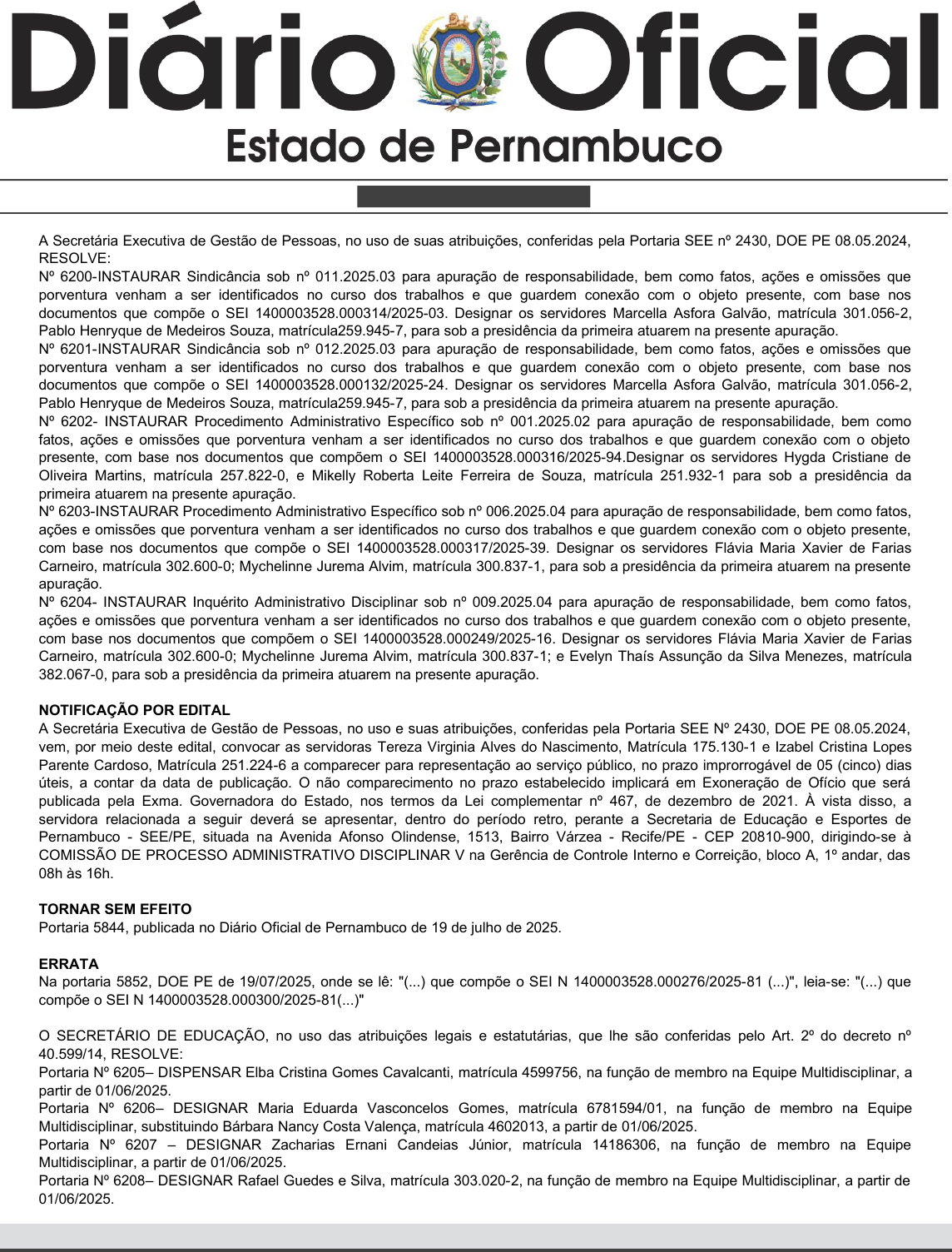 Poder ExecutivoAno CII • Nº 135 Recife, 29 de julho de 2025 CERTIFICADO DIGITALMENTE A Secretária Executiva de Gestão de Pessoas, no uso de suas atribuições, conferidas pela Portaria SEE nº 2430, DOE PE 08.05.2024, RESOLVE: Nº 6200-INSTAURAR Sindicância sob nº 011.2025.03 para apuração de responsabilidade, bem como fatos, ações e omissões que porventura venham a ser identificados no curso dos trabalhos e que guardem conexão com o objeto presente, com base nos documentos que compõe o SEI 1400003528.000314/2025-03. Designar os servidores Marcella Asfora Galvão, matrícula 301.056-2, Pablo Henryque de Medeiros Souza, matrícula259.945-7, para sob a presidência da primeira atuarem na presente apuração. Nº 6201-INSTAURAR Sindicância sob nº 012.2025.03 para apuração de responsabilidade, bem como fatos, ações e omissões que porventura venham a ser identificados no curso dos trabalhos e que guardem conexão com o objeto presente, com base nos documentos que compõe o SEI 1400003528.000132/2025-24. Designar os servidores Marcella Asfora Galvão, matrícula 301.056-2, Pablo Henryque de Medeiros Souza, matrícula259.945-7, para sob a presidência da primeira atuarem na presente apuração. Nº 6202- INSTAURAR Procedimento Administrativo Específico sob nº 001.2025.02 para apuração de responsabilidade, bem como fatos, ações e omissões que porventura venham a ser identificados no curso dos trabalhos e que guardem conexão com o objeto presente, com base nos documentos que compõem o SEI 1400003528.000316/2025-94.Designar os servidores Hygda Cristiane de Oliveira Martins, matrícula 257.822-0, e Mikelly Roberta Leite Ferreira de Souza, matrícula 251.932-1 para sob a presidência da primeira atuarem na presente apuração. Nº 6203-INSTAURAR Procedimento Administrativo Específico sob nº 006.2025.04 para apuração de responsabilidade, bem como fatos, ações e omissões que porventura venham a ser identificados no curso dos trabalhos e que guardem conexão com o objeto presente, com base nos documentos que compõe o SEI 1400003528.000317/2025-39. Designar os servidores Flávia Maria Xavier de Farias Carneiro, matrícula 302.600-0; Mychelinne Jurema Alvim, matrícula 300.837-1, para sob a presidência da primeira atuarem na presente apuração. Nº 6204- INSTAURAR Inquérito Administrativo Disciplinar sob nº 009.2025.04 para apuração de responsabilidade, bem como fatos, ações e omissões que porventura venham a ser identificados no curso dos trabalhos e que guardem conexão com o objeto presente, com base nos documentos que compõem o SEI 1400003528.000249/2025-16. Designar os servidores Flávia Maria Xavier de Farias Carneiro, matrícula 302.600-0; Mychelinne Jurema Alvim, matrícula 300.837-1; e Evelyn Thaís Assunção da Silva Menezes, matrícula 382.067-0, para sob a presidência da primeira atuarem na presente apuração. NOTIFICAÇÃO POR EDITAL A Secretária Executiva de Gestão de Pessoas, no uso e suas atribuições, conferidas pela Portaria SEE Nº 2430, DOE PE 08.05.2024, vem, por meio deste edital, convocar as servidoras Tereza Virginia Alves do Nascimento, Matrícula 175.130-1 e Izabel Cristina Lopes Parente Cardoso, Matrícula 251.224-6 a comparecer para representação ao serviço público, no prazo improrrogável de 05 (cinco) dias úteis, a contar da data de publicação. O não comparecimento no prazo estabelecido implicará em Exoneração de Ofício que será publicada pela Exma. Governadora do Estado, nos termos da Lei complementar nº 467, de dezembro de 2021. À vista disso, a servidora relacionada a seguir deverá se apresentar, dentro do período retro, perante a Secretaria de Educação e Esportes de Pernambuco - SEE/PE, situada na Avenida Afonso Olindense, 1513, Bairro Várzea - Recife/PE - CEP 20810-900, dirigindo-se à COMISSÃO DE PROCESSO ADMINISTRATIVO DISCIPLINAR V na Gerência de Controle Interno e Correição, bloco A, 1º andar, das 08h às 16h. TORNAR SEM EFEITO Portaria 5844, publicada no Diário Oficial de Pernambuco de 19 de julho de 2025. ERRATA Na portaria 5852, DOE PE de 19/07/2025, onde se lê: "(...) que compõe o SEI N 1400003528.000276/2025-81 (...)", leia-se: "(...) que compõe o SEI N 1400003528.000300/2025-81(...)" O SECRETÁRIO DE EDUCAÇÃO, no uso das atribuições legais e estatutárias, que lhe são conferidas pelo Art. 2º do decreto nº 40.599/14, RESOLVE: Portaria Nº 6205– DISPENSAR Elba Cristina Gomes Cavalcanti, matrícula 4599756, na função de membro na Equipe Multidisciplinar, a partir de 01/06/2025. Portaria Nº 6206– DESIGNAR Maria Eduarda Vasconcelos Gomes, matrícula 6781594/01, na função de membro na Equipe Multidisciplinar, substituindo Bárbara Nancy Costa Valença, matrícula 4602013, a partir de 01/06/2025. Portaria Nº 6207 – DESIGNAR Zacharias Ernani Candeias Júnior, matrícula 14186306, na função de membro na Equipe Multidisciplinar, a partir de 01/06/2025. Portaria Nº 6208– DESIGNAR Rafael Guedes e Silva, matrícula 303.020-2, na função de membro na Equipe Multidisciplinar, a partir de 01/06/2025. PROTOCOLO DE ASSINATURAS Código de verificação: 6N8AIQ5VK0-69BO0SGDZ0-P2TH9ZW2VI O documento acima foi proposto para assinatura digital na plataforma SDOE. Para visualizar o documento original clique no link: https://diariooficial.cepe.com.br/diariooficialweb/#/checar- autenticidade?codigo=6N8AIQ5VK0-69BO0SGDZ0-P2TH9ZW2VI. Poder ExecutivoAno CII • Nº 135 Recife, 29 de julho de 2025 CERTIFICADO DIGITALMENTE 2025-08-24T21:05:30-0300 Diário Oficial do Estado de Pernambuco Companhia Editora de Pernambuco