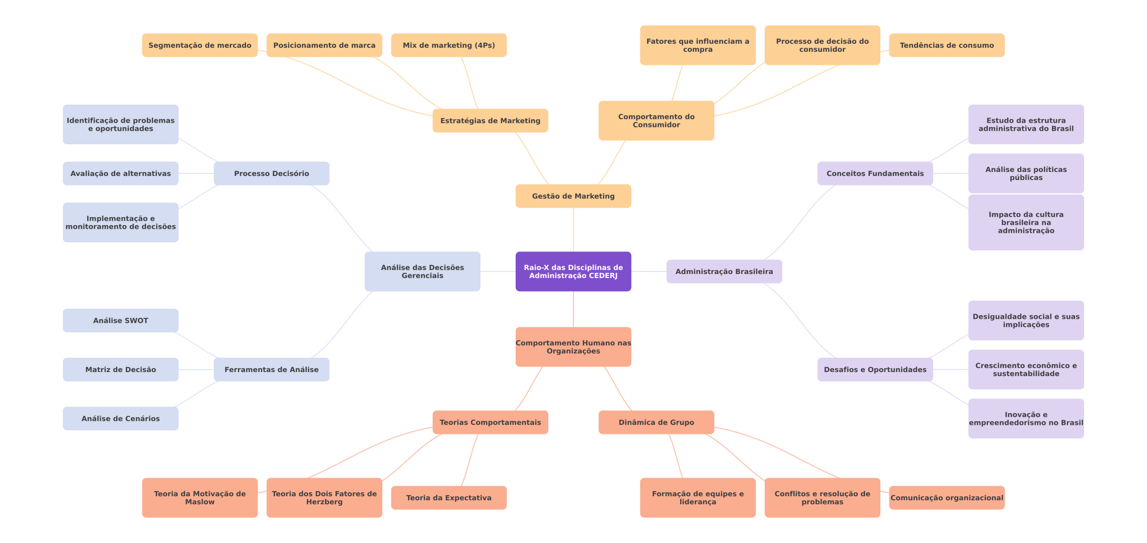 Segmentação de mercado Posicionamento de marca Mix de marketing (4Ps) Fatores que influenciam a Processo de decisão do Tendências de consumo compra consumidor Identificação de problemas Estratégias de Marketing Comportamento do Estudo da estrutura Consumidor e oportunidades administrativa do Brasil Avaliação de alternativas Processo Decisório Conceitos Fundamentais Análise das políticas públicas Gestão de Marketing Implementação e Impacto da cultura brasileira na monitoramento de decisões administração Análise das Decisões Raio-X das Disciplinas de Gerenciais Administração CEDERJ Administração Brasileira Análise SWOT Desigualdade social e suas implicações Comportamento Humano nas Organizações Crescimento econômico e Matriz de Decisão Ferramentas de Análise Desafios e Oportunidades sustentabilidade Análise de Cenários Inovação e Teorias Comportamentais Dinâmica de Grupo empreendedorismo no Brasil Teoria da Motivação de Teoria dos Dois Fatores de Maslow Herzberg Teoria da Expectativa Formação de equipes e Conflitos e resolução de liderança problemas Comunicação organizacional