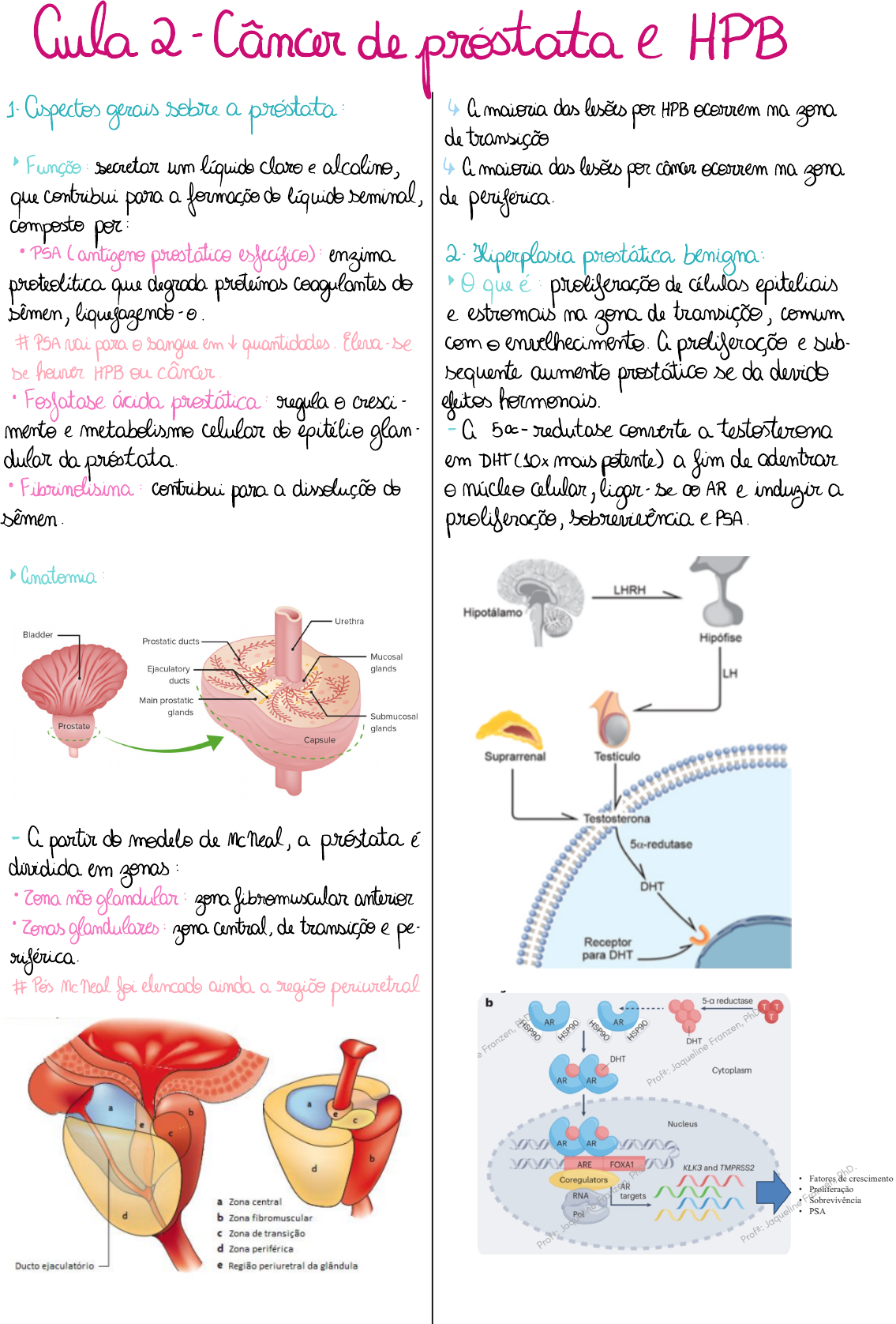 2 - Câncer de e HPB gerais sobre a a maioria das lesões HPB ocorrem ma zona de transição secretar um líquido e a maioria das lesões per câncer ocorrem ma zona que contribui para a líquido seminal, de periferica. composto PSA esfecífico) enzima prestática benigna: proteolitica que degrada proteínas coagulantes de que é proliferação de células epiteliais e estromais ma zona de comum # PSA para sangue em quantidades Eleva-se com envelhecimento. a e sub- HPB ou câncer sequente aumento se da ácida regula efeitos hermonais. mento e celular do epitélio - a conserte a testosterona dular da em DHT (10x mais potente) a fim de adentrar contribui para a dissolução de celular, ligar- se AR e induzir a proliferação, e PSA. Anatomia LHRH Hipotálamo Urethra Bladder Prostatic ducts Hipófise Mucosal Ejaculatory glands LH ducts Main prostatic glands Submucosal Prostate glands Capsule Suprarrenal Testosterona - a partir do modelo de a próstata é dividida em zonas DHT Zona glandular zona fibromuscular anterior Zonas glandulares zona central, de e pe- Receptor riférica. para DHT # Pós Mc neal foi elencado ainda a região periuretral b reductase AR AR Franzen, DHT Franzen, DHT Jaqueline Cytoplasm AR AR b Nucleus AR AR b ARE FOXA1 KLK3 and TMPRSS2 Coregulators Fatores de crescimento AR Proliferação RNA targets a Zona central Sobrevivência b Zona fibromuscular Zona de transição PSA d Zona periférica Ducto ejaculatório Região periuretral da glândula- Com a idade, a testosterona sérica cai, e mas DHT mantem-se pela alta atividade to da redutase e AR a HPB ocorre quando a homeostase supertada pela DHT é inter- do HPB hiperplásicos origi- = entre proliferação lobos laterais e medio, a partir e morte celular (1 sustentada do glandular interno. per DHT e opoptose a alta expressão Próstata Normal de Hiperplasia Prostática Benigna Esvaziamento completo Esvaziamento incompleto Bexiga da bexiga Bexiga da bexiga Androgens (DHT) Androgens Antagonistic Agonistic KGF Antagonistic Agonistic EGF KGF EGF IGFs Cell Cell Cell death Oestrogens Urina proliferation death may inhibit Balanced proliferation Unbalanced Esfíncter Oestrogens may promote Normal prostate Prostate hyperplasia Uretra Próstata Uretra Próstata - total cai, mas a pros. tata mantém alta comersão local em DHT e 3- Neoplasia intraepitelial este se liga com maior afinidade e potência Oque citológicas e proliferação de receptor androgênico = DHT/ luminais, ductos e terona T. Pede varior de (sem prognes- Urethra Stromal and epithelial proliferation tico) a alto grau (risco de câncer). Gland Stroma Progressão a prostata frequen- Testosterone Stromal Steroid cell -reductase temente apresenta de inflamação persistente, type 2 Autocrine DHT regulation qual libera citoninas e ROS => tecido sofre Growth factors EGF and IGFs) Growth factors (KGF, EGF and IGFs) repetitivo DNA, levando a fase "PIA" Paracrine regulation Endocrine regulation ( proliferative inflammatory atrophy). Epithelial cell - a PIA representa áreas de epitelial em Interação estroma/epitelio estroma decorrência da inflamação Essas F.C seb de DHT, que per regulação paracrina esti- lulas tentam se mas seb mula a multiplicar se e de au- estresse possuem maior mas próprias estromais lidade a a PIA considerada uma ma cresce precursora indireta do câncer, muitos vezes evoluindo para PIN intraepite- Sintomas sintomas decorrentes do lial mento da zona de e estrangu- a PIN é uma alteração merfológica em que lamento da uretra. em as epiteliais apresentam atipia nuclear, fraco, micção mas sem invasão da membrana basal. prolongada. mõe é um câncer, mas evoluir para uma frequência, urgência, meoplasia invasiva túria, e redução de - a transiçõe para uma meoplasia é caracte-pela perda de barreiras como basais # Toque digital alterado módulos irre- e integridade da membrana basal. gu tamanho maior, aspecto endurre- Normal PIA PIN Prostate cancer Luminal epithelial Exames baseades PSA cells Basal cells 1- PSA total live + sangue. Basament membrane 2- PSA live a proteínas Stroma 3- PSA live etotal = indicader positive ROS, reactive nitrogen species, Bacteria Damage 4- de PSA em intervalos de tempo Immune cells pro-inflammatory cytokines 5- Densidade do PSA PSA Fatores de risco a de cigarro, 6- PSA idade em homens mais obesidade, dieta rica em e e his- VALORES NORMAIS para VALORES NORMAIS para VALORES NORMAIS para IDADE tórico familiar. indivíduos negros indivíduos pardos indivíduos brancos 40 49 de 0,0 até 2 ng/ml de 0,0 até 2 ng/ml de 0,0 até 2,5 ng/ml genes câncer de próstata BRCA1, ATM anos 50 59 e BRCA2. anos de 0,0 até 4 ng/ml de 0,0 até 3 ng/ml de 0,0 até 3,5 ng/ml 60 69 anos de 0,0 até 4,5 ng/ml de 0,0 até 4 ng/ml de 0,0 até 4,5 ng/ml Principais pélvicos 70 79 de 0,0 até 5,5 ng/ml de 0,0 até 5 ng/ml de 0,0 até 6,5 ng/ml anos e ossos. baseado sistema TNM, PSA Tipes de câncer de mais frequentes 95% e escala de gleason demais tipos incluem Índice de dois tipos padrões carcinoma de pequenas, tumores lares mais presentes ma biópsia são identifica- décrimes, carcinoma de células transicionais e sar- des. Esses padrões ganham uma mota para cada, comas. baseada em de referência. Essas duas mo- tas somadas, a soma resulta indice de Rastreio para a tratamento que vai de 6 a 10, classificando risco. triagem e rastreio levar em conta we 1. Glândulas pequenas Bem Identificação de grupos de risco e uniformes diferenciada 2 de reteste individualizado 2. Mais estroma entre direcionadas as glândulas 4- Inclusão de RNM para reduzir de biópsias Moderadamente 3. Margens distintamente diferenciada Seguir as diretrizes para triagem e pre- infiltrativas coce 4. Massas irregulares de células neoplásicas Pouco diferenciada após rastreio positive ou sintomas. 5. Formação ocasional de glândulas Baseado mes seguintes exames 1- digital anal 2- Dosagem de PSA de próstata tumor de grau 4- de imagem (RNM,TC TC, PET e USTR)
