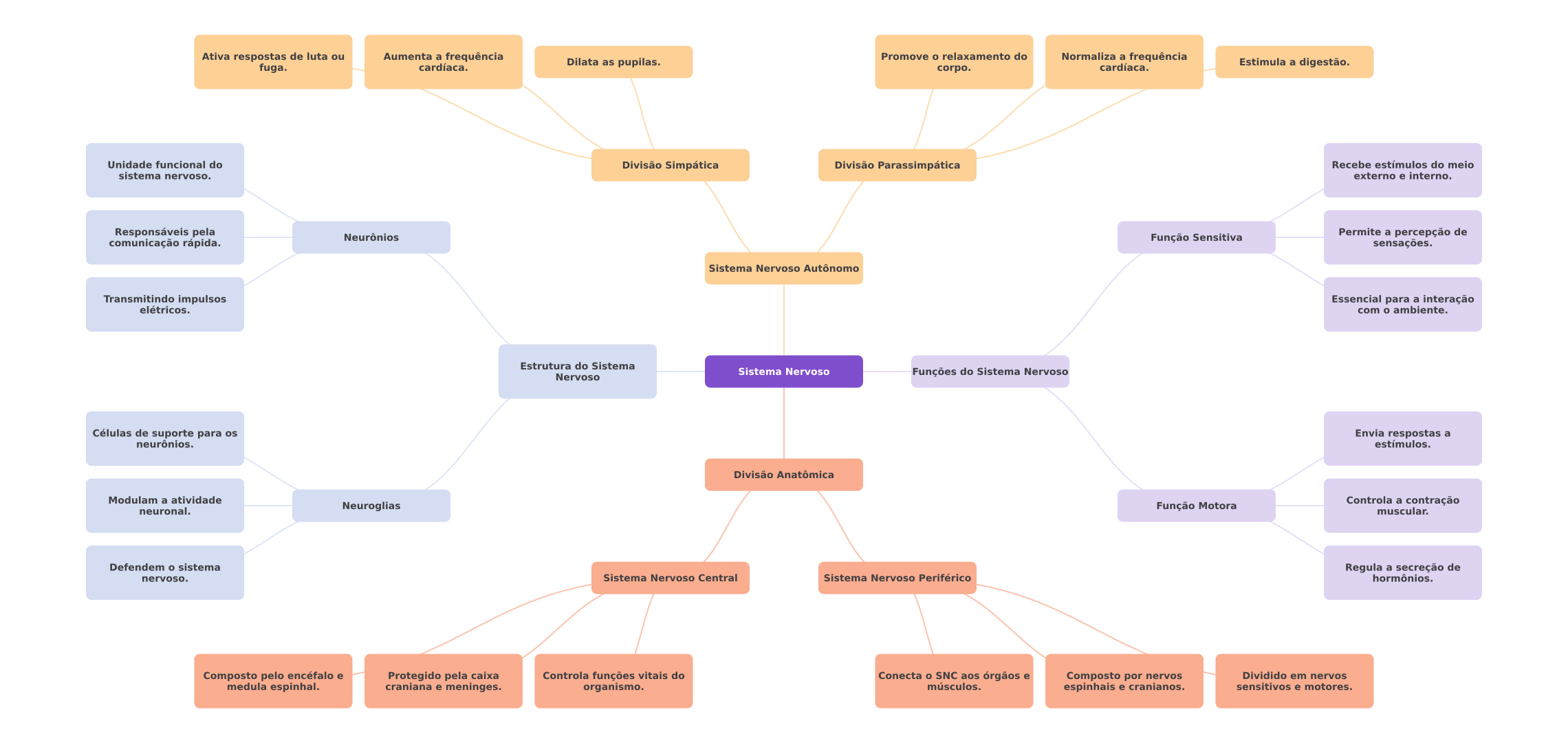 Ativa respostas de luta ou Aumenta a frequência Promove relaxamento do fuga. cardíaca. Dilata as pupilas. Normaliza a frequência corpo. cardíaca. Estimula a digestão. Unidade funcional do Divisão Simpática Divisão Parassimpática Recebe estímulos do meio sistema nervoso. externo e interno. Responsáveis pela Neurônios comunicação rápida. Função Sensitiva Permite a percepção de sensações. Sistema Nervoso Autônomo Transmitindo impulsos Essencial para a interação elétricos. com ambiente. Estrutura do Sistema Sistema Nervoso Nervoso Funções do Sistema Nervoso Células de suporte para os Envia respostas a neurônios. estímulos. Divisão Anatômica Modulam a atividade neuronal. Neuroglias Função Motora Controla a contração muscular. Defendem sistema Regula a secreção de nervoso. Sistema Nervoso Central Sistema Nervoso Periférico hormônios. Composto pelo encéfalo e Protegido pela caixa Controla funções vitais do Conecta SNC aos órgãos e Composto por nervos Dividido em nervos medula espinhal. craniana e meninges. organismo. músculos. espinhais e cranianos. sensitivos e motores.