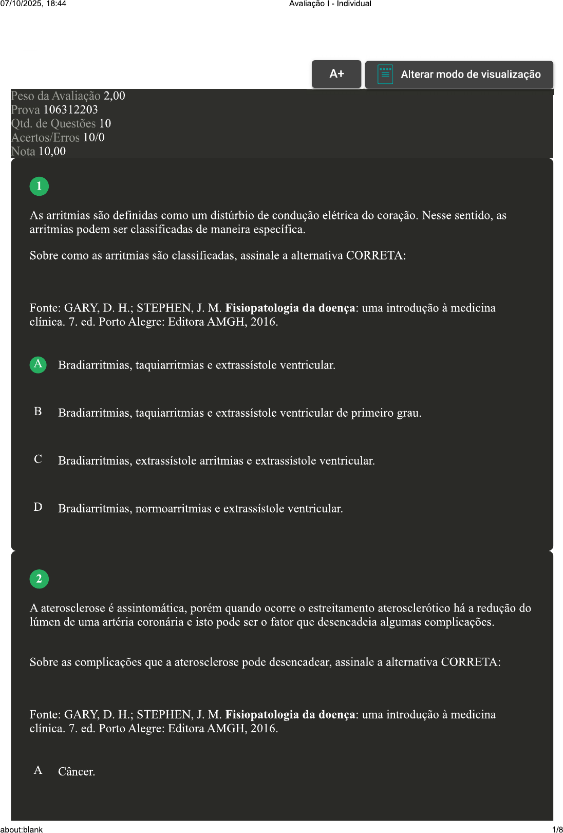 07/10/2025, 18:44 Avaliação I - Individual A+ Alterar modo de visualização Peso da Avaliação 2,00 Prova 106312203 Qtd. de Questões 10 Acertos/Erros 10/0 Nota 10,00 1 As arritmias são definidas como um distúrbio de condução elétrica do coração. Nesse sentido, as arritmias podem ser classificadas de maneira específica. Sobre como as arritmias são classificadas, assinale a alternativa CORRETA: Fonte: GARY, D. H.; STEPHEN, J. M. Fisiopatologia da doença: uma introdução à medicina clínica. 7. ed. Porto Alegre: Editora AMGH, 2016. A Bradiarritmias, taquiarritmias e extrassístole ventricular. Bradiarritmias, taquiarritmias e extrassístole ventricular de primeiro grau. Bradiarritmias, extrassístole arritmias e extrassístole ventricular. D Bradiarritmias, normoarritmias e extrassístole ventricular. 2 A aterosclerose é assintomática, porém quando ocorre o estreitamento aterosclerótico há a redução do lúmen de uma artéria coronária e isto pode ser o fator que desencadeia algumas complicações. Sobre as complicações que a aterosclerose pode desencadear, assinale a alternativa CORRETA: Fonte: GARY, D. H.; STEPHEN, J. M. Fisiopatologia da doença: uma introdução à medicina clínica. 7. ed. Porto Alegre: Editora AMGH, 2016. A Câncer. about:blank 1/807/10/2025, 18:44 Avaliação I - Individual B Angina. Diabetes. D Depressão. 3 Você já deve ter conhecido uma pessoa hipertensa. A hipertensão é uma das doenças mais comuns no mundo, acometendo em torno de um bilhão de pessoas em todo o planeta. No Brasil, cerca de 30% da população adulta e até 60% dos idosos são hipertensos. A hipertensão arterial sistêmica (HAS) é classificada em dois tipos: primária e secundária. Fonte: LEMOS, S. de S. Assistência de Enfermagem na Saúde do Adulto. Indaial: UNIASSELVI, 2022. Sobre o que causa HAS, assinale a alternativa CORRETA: A Estreitamento das artérias renais. B Idade avançada. Sono irregular. D Atividade física regular. 4 As doenças crônicas não transmissíveis (DCNT) são atualmente um dos principais e mais preocupantes problemas de saúde em âmbito global. Sobre as DCNT, analise as sentenças a seguir: I- consumo excessivo de sal aumenta o risco de hipertensão e eventos cardiovasculares; e o alto consumo de carne vermelha, de carne altamente processada e de ácidos graxos trans está relacionado às doenças cardiovasculares e ao diabetes. II- A criação do Sistema Único de Saúde (SUS) e sua continuada e crescente estruturação viabilizaram maior acesso e forte controle social, o que permitiu a formulação de múltiplas políticas about:blank 2/807/10/2025, 18:44 Avaliação I - Individual públicas para o enfrentamento das DCNT. III- Para o enfrentamento das DNCT, a OMS elegeu como alvo de ações em saúde os cinco principais fatores de risco para doenças crônicas: fumo, inatividade física, alimentação inadequada, uso prejudicial de álcool e insônia. IV- As estratégicas para o Enfrentamento das Doenças Crônicas Não Transmissíveis enfatizam ações populacionais para controlar as doenças cardiovasculares, diabetes, câncer e doença respiratória crônica, predominantemente pelo controle do fumo, inatividade física, alimentação inadequada e uso prejudicial de álcool. Assinale a alternativa CORRETA: Fonte: DUNCAN, et al. Doenças crônicas não transmissíveis no Brasil: prioridade para enfrentamento e investigação. Revista de Saúde Pública, V. 46, 126-134, dez. 2012. A As sentenças I, II e IV estão corretas. B As sentenças III e IV estão corretas. As sentenças II e III estão corretas. D As sentenças I, II e III estão corretas. 5 A aterosclerose é considerada uma resposta inflamatória crônica da parede arterial à lesão endotelial e tem como característica a presença das placas ateroscleróticas, sendo a principal causa da doença cardiovascular. Acerca dos fatores modificáveis para a ocorrência da aterosclerose, assinale a alternativa CORRETA: A Diabetes, antecedentes familiares, hipertensão arterial sistêmica, hiperlipidemia. B Inflamação, hipertensão arterial sistêmica e diabetes mellitus. Anormalidades genéticas, antecedentes familiares e hipertensão arterial sistêmica. about:blank 3/807/10/2025, 18:44 Avaliação - Individual D Idade avançada, hipertensão arterial sistêmica, hiperlipidemia. 6 A aterosclerose é considerada uma resposta inflamatória crônica da parede arterial à lesão endotelial, tendo como característica a presença das placas ateroscleróticas e sendo a principal causa da doença cardiovascular. Sobre aterosclerose, classifique V para as sentenças verdadeiras e F para as falsas: Na aterosclerose, a formação dos depósitos de gordura nas artérias pode se soltar e entrar na corrente sanguínea, se alastrando por todo o corpo e levando à formação de um coágulo sanguíneo, afetando o fluxo sanguíneo para outros órgãos. A doença aterosclerótica é a principal representante dos processos patológicos cardiovasculares associados ao envelhecimento, manifestando-se em indivíduos adultos, cuja incidência aumenta significativamente a partir dos 70 anos de idade. Quando lesões de aterosclerose causam coagulação e oclusão de uma artéria coronária, resulta no infarto do miocárdio; e quando ocorre na circulação cerebral, o bloqueio arterial no local de placas ateroscleróticas resulta em acidentes vasculares trombóticos. A aterosclerose apresenta sintomas como cefaleia, tontura e sincope devido ao estreitamento aterosclerótico que reduz o lúmen de uma artéria coronária em mais de 75%, resultando na produção de substâncias que se acumulam na parede do vaso sanguíneo. Assinale a alternativa que apresenta a sequência CORRETA: Fonte: GARY, D. H.; STEPHEN, J. Fisiopatologia da doença: uma introdução à medicina clínica. 7. ed. Porto Alegre: Editora AMGH, 2016. A F-F-F-V. F-V-V-F. V-F-V-F. D V-V-V-F. about:blank 4/807/10/2025, 18:44 Avaliação - Ind