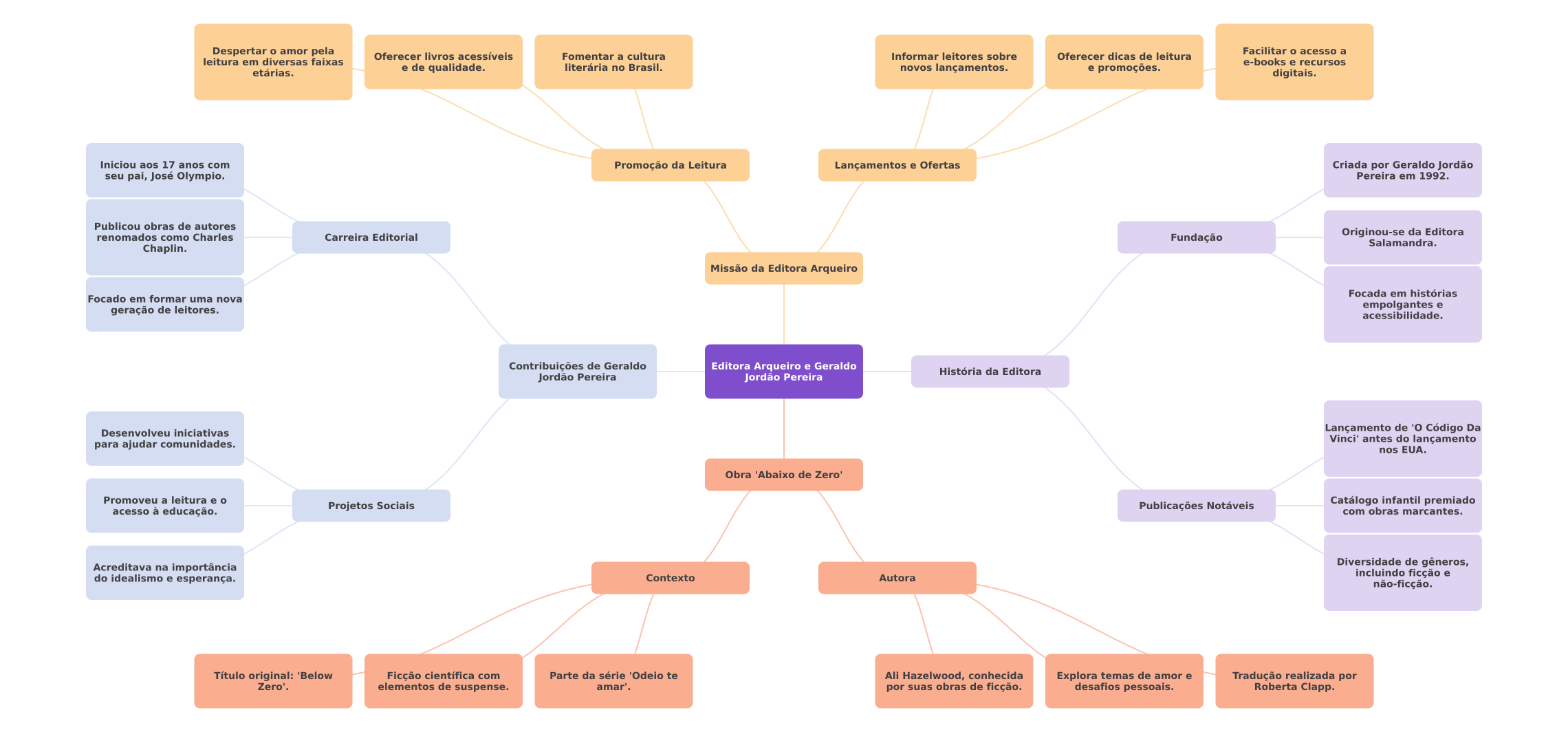 Despertar amor pela Facilitar acesso a Oferecer livros acessíveis Fomentar a cultura Informar leitores sobre Oferecer dicas de leitura leitura em diversas faixas e-books e recursos etárias. e de qualidade. literária no Brasil. novos lançamentos. e promoções. digitais. Iniciou aos 17 anos com Promoção da Leitura Lançamentos e Ofertas Criada por Geraldo Jordão seu pai, José Olympio. Pereira em 1992. Publicou obras de autores renomados como Charles Carreira Editorial Fundação Originou-se da Editora Salamandra. Chaplin. Missão da Editora Arqueiro Focada em histórias Focado em formar uma nova empolgantes e geração de leitores. acessibilidade. Contribuições de Geraldo Editora Arqueiro e Geraldo História da Editora Jordão Pereira Jordão Pereira Desenvolveu iniciativas Lançamento de Código Da Vinci' antes do lançamento para ajudar comunidades. nos EUA. Obra 'Abaixo de Zero' Promoveu a leitura e acesso à educação. Projetos Sociais Publicações Notáveis Catálogo infantil premiado com obras marcantes. Acreditava na importância Diversidade de gêneros, do idealismo e esperança. Contexto Autora incluindo ficção e não-ficção. Título original: 'Below Ficção científica com Parte da série 'Odeio te Ali Hazelwood, conhecida Explora temas de amor e Tradução realizada por Zero'. elementos de suspense. amar'. por suas obras de ficção. desafios pessoais. Roberta Clapp.