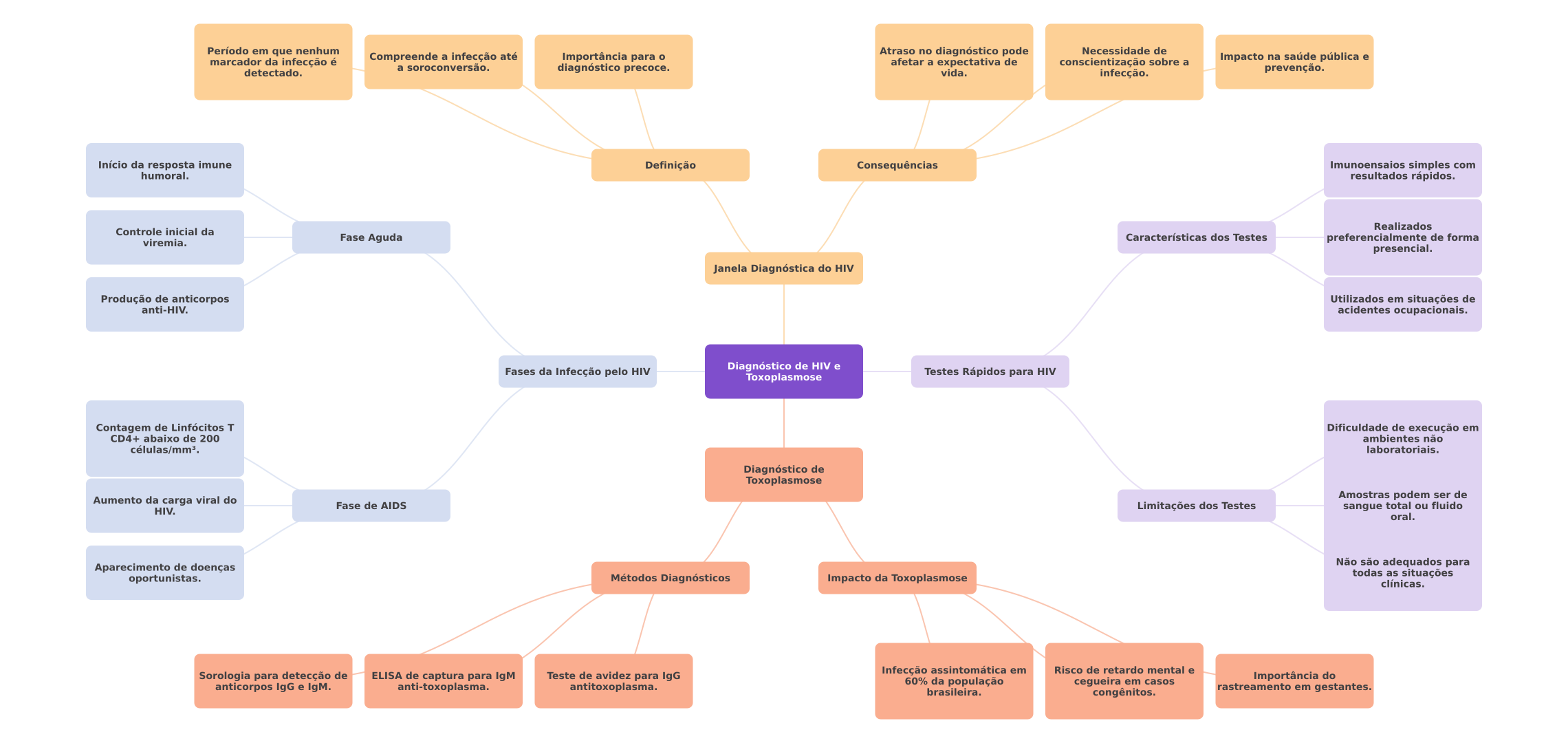 Período em que nenhum Atraso no diagnóstico pode Necessidade de marcador da infecção é Compreende a infecção até Importância para a soroconversão. detectado. diagnóstico precoce. afetar a expectativa de conscientização sobre a Impacto na saúde pública e vida. infecção. prevenção. Início da resposta imune Definição Consequências Imunoensaios simples com humoral. resultados rápidos. Realizados Controle inicial da viremia. Fase Aguda Características dos Testes preferencialmente de forma presencial. Janela Diagnóstica do HIV Produção de anticorpos Utilizados em situações de anti-HIV. acidentes ocupacionais. Fases da Infecção pelo HIV Diagnóstico de HIV e Toxoplasmose Testes Rápidos para HIV Contagem de Linfócitos T Dificuldade de execução em CD4+ abaixo de 200 ambientes não células/mm³. laboratoriais. Diagnóstico de Toxoplasmose Aumento da carga viral do Amostras podem ser de Fase de AIDS Limitações dos Testes sangue total ou fluido HIV. oral. Aparecimento de doenças Não são adequados para oportunistas. Métodos Diagnósticos Impacto da Toxoplasmose todas as situações clínicas. Infecção assintomática em Risco de retardo mental e Sorologia para detecção de ELISA de captura para IgM Teste de avidez para IgG Importância do anticorpos IgG e IgM. anti-toxoplasma. antitoxoplasma. 60% da população cegueira em casos brasileira. congênitos. rastreamento em gestantes.