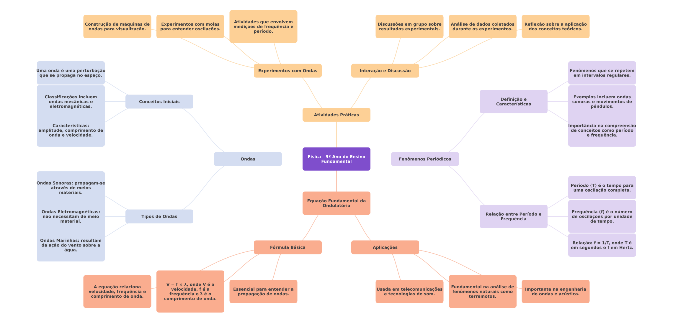 Atividades que envolvem Construção de máquinas de Experimentos com molas medições de frequência e Discussões em grupo sobre Análise de dados coletados Reflexão sobre a aplicação ondas para visualização. para entender oscilações. resultados experimentais. durante os experimentos. dos conceitos teóricos. período. Uma onda é uma perturbação Experimentos com Ondas Interação e Discussão Fenômenos que se repetem que se propaga no espaço. em intervalos regulares. Classificações incluem Exemplos incluem ondas Definição e ondas mecânicas e Conceitos Iniciais sonoras e movimentos de Características eletromagnéticas. pêndulos. Atividades Práticas Características: Importância na compreensão amplitude, comprimento de de conceitos como período onda e velocidade. e frequência. Física Ano do Ensino Ondas Fenômenos Periódicos Fundamental Ondas Sonoras: propagam-se Período (T) é tempo para através de meios uma oscilação completa. materiais. Equação Fundamental da Ondulatória Ondas Eletromagnéticas: Relação entre Período e Frequência (f) é número não necessitam de meio Tipos de Ondas Frequência de oscilações por unidade material. de tempo. Ondas Marinhas: resultam Relação: f = 1/T, onde T é da ação do vento sobre a Fórmula Básica Aplicações em segundos e f em Hertz. água. V = f onde V é a A equação relaciona Fundamental na análise de velocidade, a velocidade, frequência e Essencial para entender a Usada em telecomunicações fenômenos naturais como Importante na engenharia comprimento de onda. frequência e é propagação de ondas. e tecnologias de som. de ondas e acústica. terremotos. comprimento de onda.
