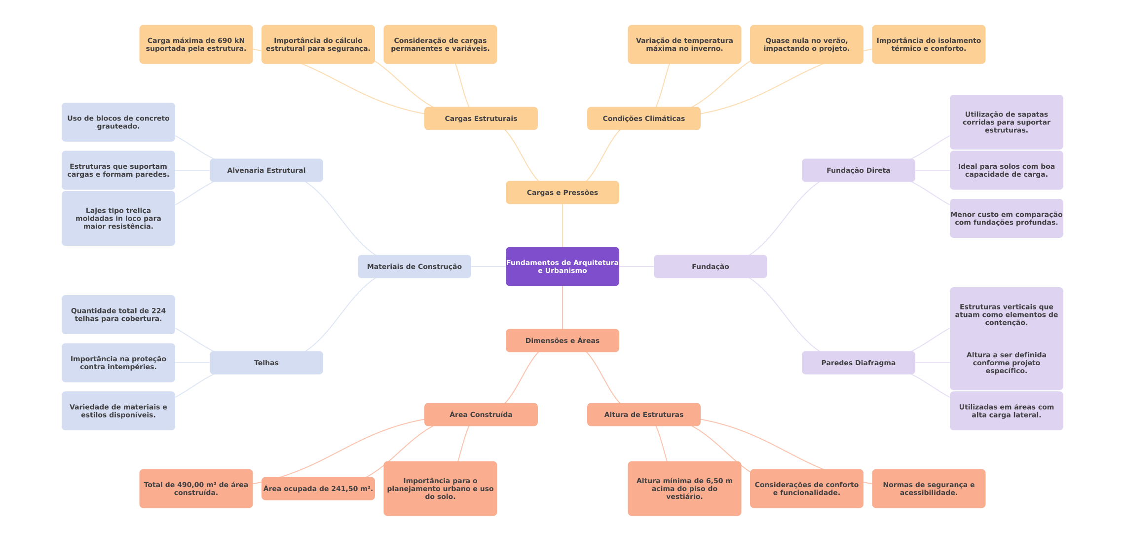 Carga máxima de 690 kN Importância do cálculo Consideração de cargas Variação de temperatura Quase nula no verão, Importância do isolamento suportada pela estrutura. estrutural para segurança. permanentes e variáveis. máxima no inverno. impactando projeto. térmico e conforto. Utilização de sapatas Uso de blocos de concreto Cargas Estruturais Condições Climáticas corridas para suportar grauteado. estruturas. Estruturas que suportam Alvenaria Estrutural Fundação Direta Ideal para solos com boa cargas e formam paredes. capacidade de carga. Cargas e Pressões Lajes tipo treliça Menor custo em comparação moldadas in loco para maior resistência. com fundações profundas. Materiais de Construção Fundamentos de Arquitetura e Urbanismo Fundação Quantidade total de 224 Estruturas verticais que atuam como elementos de telhas para cobertura. contenção. Dimensões e Altura a ser definida Importância na proteção Telhas Paredes Diafragma conforme projeto contra intempéries. específico. Variedade de materiais e Utilizadas em áreas com estilos disponíveis. Área Construída Altura de Estruturas alta carga lateral. Total de 490,00 de área Importância para Altura mínima de 6,50 m construída. Área ocupada de 241,50 Considerações de conforto planejamento urbano e uso acima do piso do Normas de segurança e e funcionalidade. acessibilidade. do solo. vestiário.