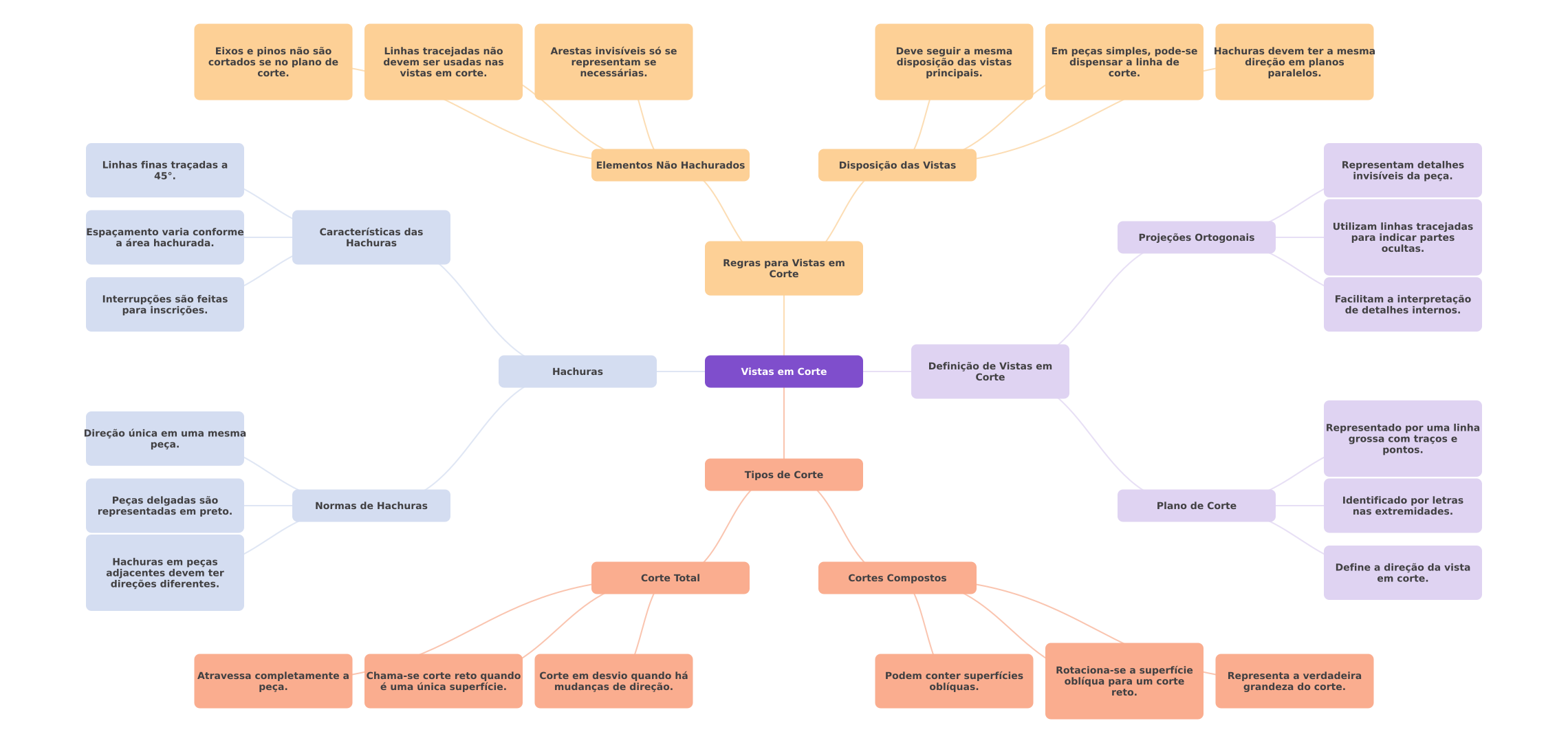 Eixos e pinos não são Linhas tracejadas não Arestas invisíveis só se Deve seguir a mesma Em peças simples, pode-se Hachuras devem ter a mesma cortados se no plano de devem ser usadas nas representam se disposição das vistas dispensar a linha de direção em planos corte. vistas em corte. necessárias. principais. corte. paralelos. Linhas finas traçadas a Elementos Não Hachurados Disposição das Vistas Representam detalhes 45°. invisíveis da peça. Espaçamento varia conforme Características das Utilizam linhas tracejadas a área hachurada. Hachuras Projeções Ortogonais para indicar partes ocultas. Regras para Vistas em Corte Interrupções são feitas Facilitam a interpretação para inscrições. de detalhes internos. Hachuras Vistas em Corte Definição de Vistas em Corte Direção única em uma mesma Representado por uma linha grossa com traços e peça. pontos. Tipos de Corte Peças delgadas são Normas de Hachuras Plano de Corte Identificado por letras representadas em preto. nas extremidades. Hachuras em peças Define a direção da vista adjacentes devem ter Corte Total Cortes Compostos em corte. direções diferentes. Atravessa completamente a Chama-se corte reto quando Corte em desvio quando há Podem conter superfícies Rotaciona-se a superfície peça. é uma única superfície. mudanças de direção. oblíquas. oblíqua para um corte Representa a verdadeira reto. grandeza do corte.