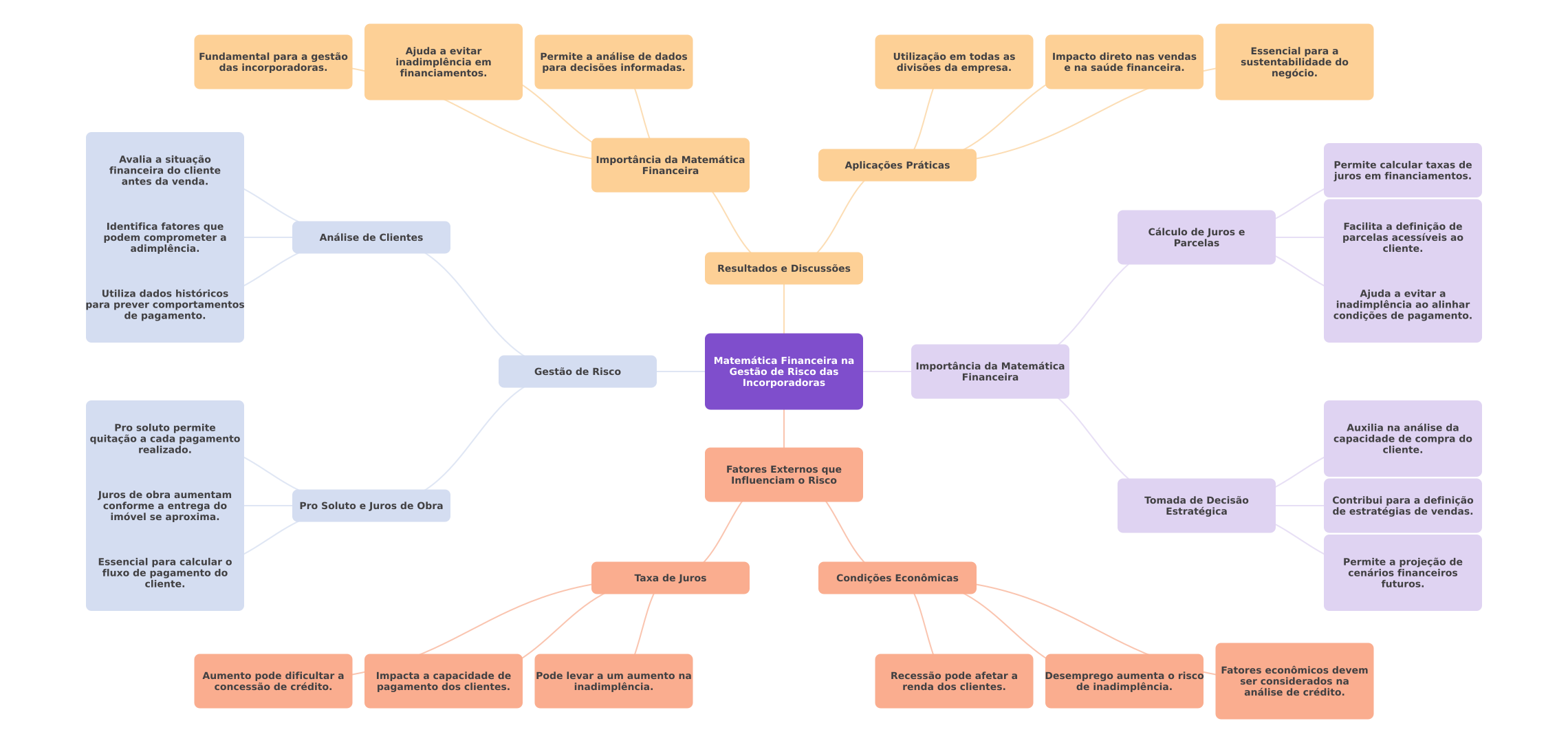 Fundamental para a gestão Ajuda a evitar Permite a análise de dados inadimplência em Utilização em todas as Impacto direto nas vendas Essencial para a do das incorporadoras. financiamentos. para decisões informadas. divisões da empresa. e na saúde financeira. negócio. Avalia a situação Importância da Matemática financeira do cliente Financeira Aplicações Práticas Permite calcular taxas de antes da venda. juros em financiamentos. Identifica fatores que Facilita a definição de podem comprometer a Análise de Clientes Cálculo de Juros e Parcelas parcelas acessíveis ao adimplência. cliente. Resultados e Discussões Utiliza dados históricos Ajuda a evitar a para prever comportamentos inadimplência ao alinhar de pagamento. condições de pagamento. Matemática Financeira na Gestão de Risco Gestão de Risco das Importância da Matemática Financeira Incorporadoras Pro soluto permite Auxilia na análise da quitação a cada pagamento capacidade de compra do realizado. cliente. Fatores Externos que Influenciam Risco Juros de obra aumentam Tomada de Decisão conforme a entrega do Pro Soluto e Juros de Obra Contribui para a definição imóvel se aproxima. Estratégica de estratégias de vendas. Essencial para calcular Permite a projeção de fluxo de pagamento do cenários financeiros cliente. Taxa de Juros Condições Econômicas futuros. Fatores econômicos devem Aumento pode dificultar a Impacta a capacidade de Pode levar a um aumento na Recessão pode afetar a Desemprego aumenta risco ser considerados na concessão de crédito. pagamento dos clientes. inadimplência. renda dos clientes. de inadimplência. análise de crédito.