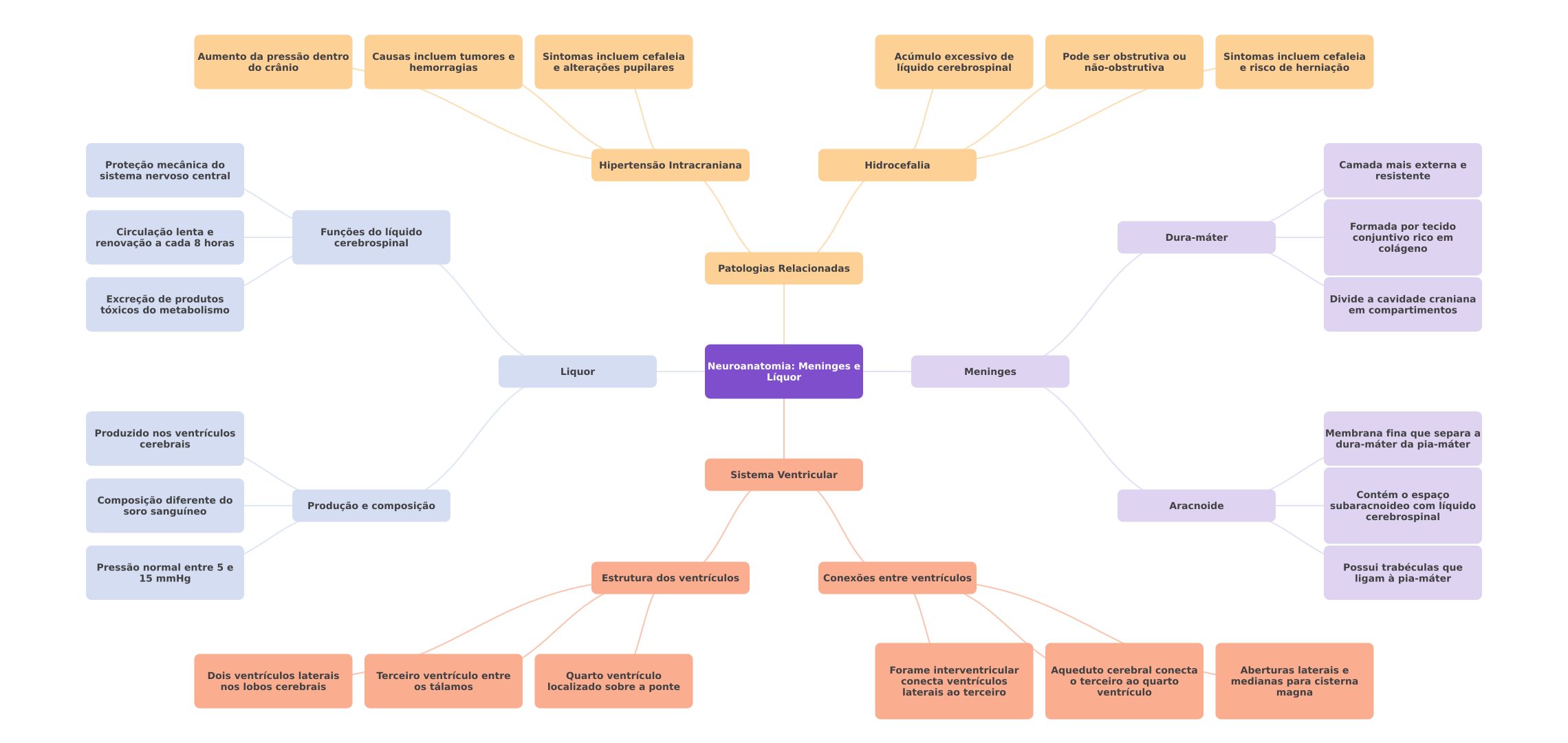 Aumento da pressão dentro Causas incluem tumores e Sintomas incluem cefaleia Acúmulo excessivo de Pode ser obstrutiva ou Sintomas incluem cefaleia do crânio hemorragias e alterações pupilares líquido cerebrospinal não-obstrutiva e risco de herniação Proteção mecânica do Hipertensão Intracraniana Hidrocefalia Camada mais externa e sistema nervoso central resistente Circulação lenta e Funções do líquido Formada por tecido Dura-máter conjuntivo rico em renovação a cada 8 horas cerebrospinal colágeno Patologias Relacionadas Excreção de produtos Divide a cavidade craniana tóxicos do metabolismo em compartimentos Liquor Neuroanatomia: Meninges e Meninges Líquor Produzido nos ventrículos Membrana fina que separa a cerebrais dura-máter da pia-máter Sistema Ventricular Composição diferente do Contém espaço soro sanguíneo Produção e composição Aracnoide subaracnoideo com líquido cerebrospinal Pressão normal entre 5 e Possui trabéculas que 15 mmHg Estrutura dos ventrículos Conexões entre ventrículos ligam à pia-máter Forame interventricular Dois ventrículos laterais Terceiro ventrículo entre Quarto ventrículo Aqueduto cerebral conecta Aberturas laterais e conecta ventrículos nos lobos cerebrais os tálamos localizado sobre a ponte terceiro ao quarto medianas para cisterna laterais ao terceiro ventrículo magna