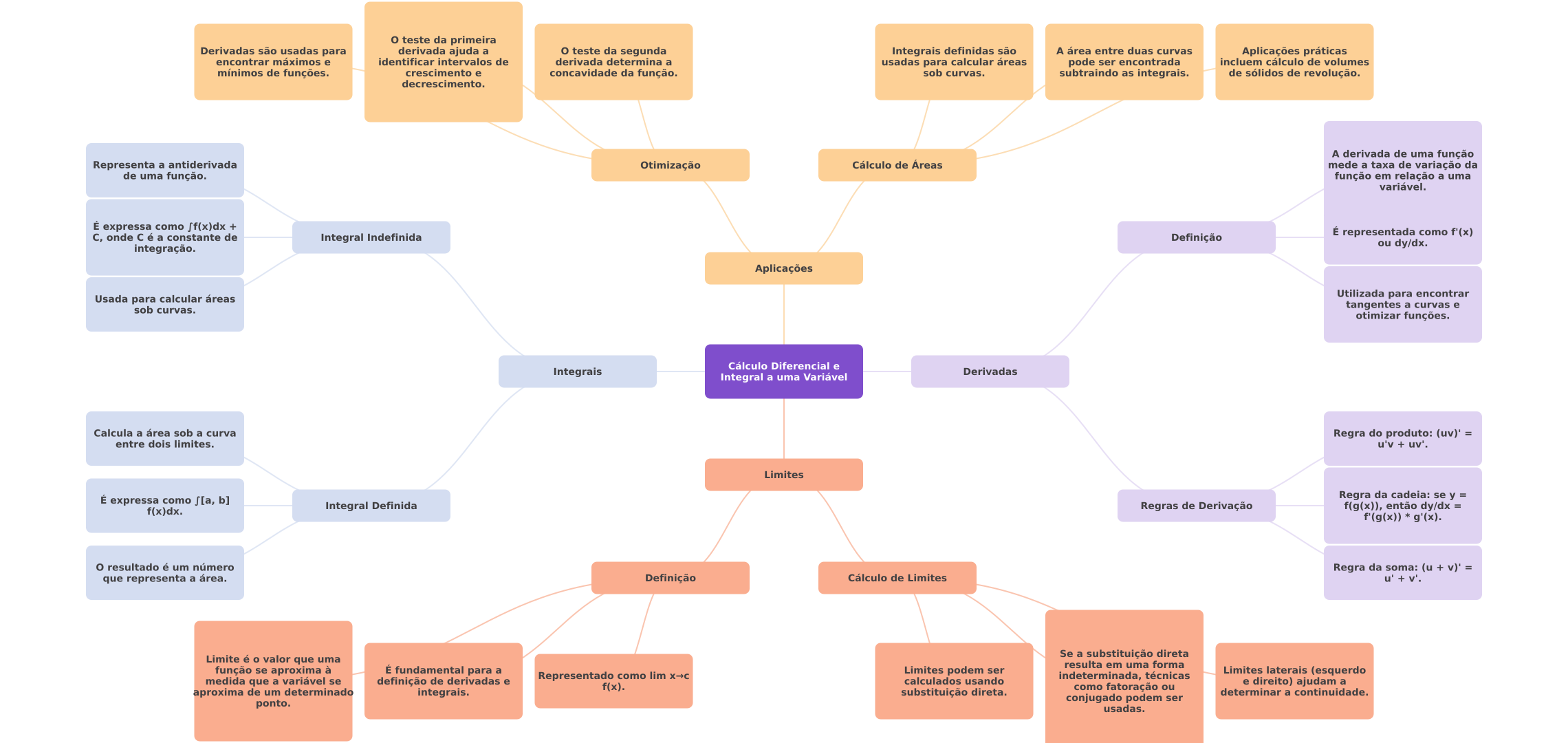 teste da primeira Derivadas são usadas para derivada ajuda a teste da segunda Integrais definidas são A área entre duas curvas Aplicações práticas encontrar máximos e identificar intervalos de derivada determina a usadas para calcular áreas pode ser encontrada incluem cálculo de volumes mínimos de funções. crescimento e concavidade da função. sob curvas. subtraindo as integrais. de sólidos de revolução. decrescimento. A derivada de uma função Representa a antiderivada Otimização Cálculo de Áreas mede a taxa de variação da de uma função. função em relação a uma variável. expressa como + c, onde c é a constante de Integral Indefinida Definição É representada como f'(x) ou dy/dx. integração. Aplicações Usada para calcular áreas Utilizada para encontrar sob curvas. tangentes a curvas e otimizar funções. Cálculo Diferencial e Integrais Derivadas Integral a uma Variável Calcula a área sob a curva Regra do produto: (uv)' = entre dois limites. u'v uv'. Limites É expressa como b] Regra da cadeia: se y = f(x)dx. Integral Definida Regras de Derivação f(g(x)), então dy/dx = f'(g(x)) g'(x). resultado é um número Regra da soma: (u + v)' = que representa a área. Definição Cálculo de Limites u' v'. Limite é valor que uma Se a substituição direta resulta em uma forma função se aproxima à É fundamental para a Limites podem ser Limites laterais (esquerdo medida que a variável se definição de derivadas e Representado como lim calculados usando indeterminada, técnicas f(x). substituição direta. como fatoração ou e direito) ajudam a aproxima de um determinado integrais. determinar a continuidade. conjugado podem ser ponto. usadas.