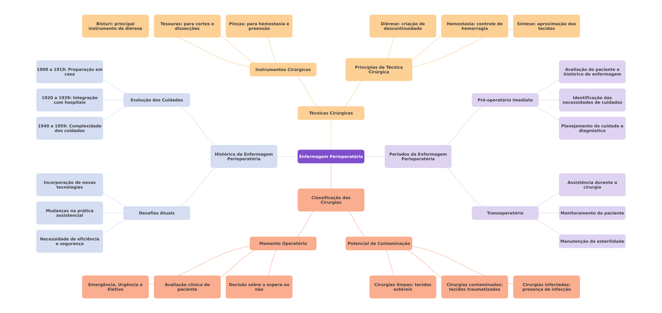 Bisturi: principal Tesouras: para cortes e Pinças: para hemostasia e Diérese: criação de Hemostasia: controle de Síntese: aproximação dos instrumento de diérese dissecções preensão descontinuidade hemorragia tecidos 1900 a 1919: Preparação em Instrumentos Cirúrgicos Princípios de Técnica Avaliação do paciente e Cirúrgica casa histórico de enfermagem 1920 a 1939: Integração com hospitais Evolução dos Cuidados Pré-operatório Imediato Identificação das necessidades de cuidados Técnicas Cirúrgicas 1940 a 1959: Complexidade Planejamento do cuidado e dos cuidados diagnóstico Histórico da Enfermagem Enfermagem Perioperatória Períodos da Enfermagem Perioperatória Perioperatória Incorporação de novas Assistência durante a tecnologias cirurgia Classificação das Cirurgias Mudanças na prática Desafios Atuais assistencial Transoperatório Monitoramento do paciente Necessidade de eficiência e segurança Momento Operatório Potencial de Contaminação Manutenção da esterilidade Emergência, Urgência e Avaliação clínica do Decisão sobre a espera ou Cirurgias limpas: tecidos Cirurgias contaminadas: Cirurgias infectadas: Eletivo paciente não estéreis tecidos traumatizados presença de infecção
