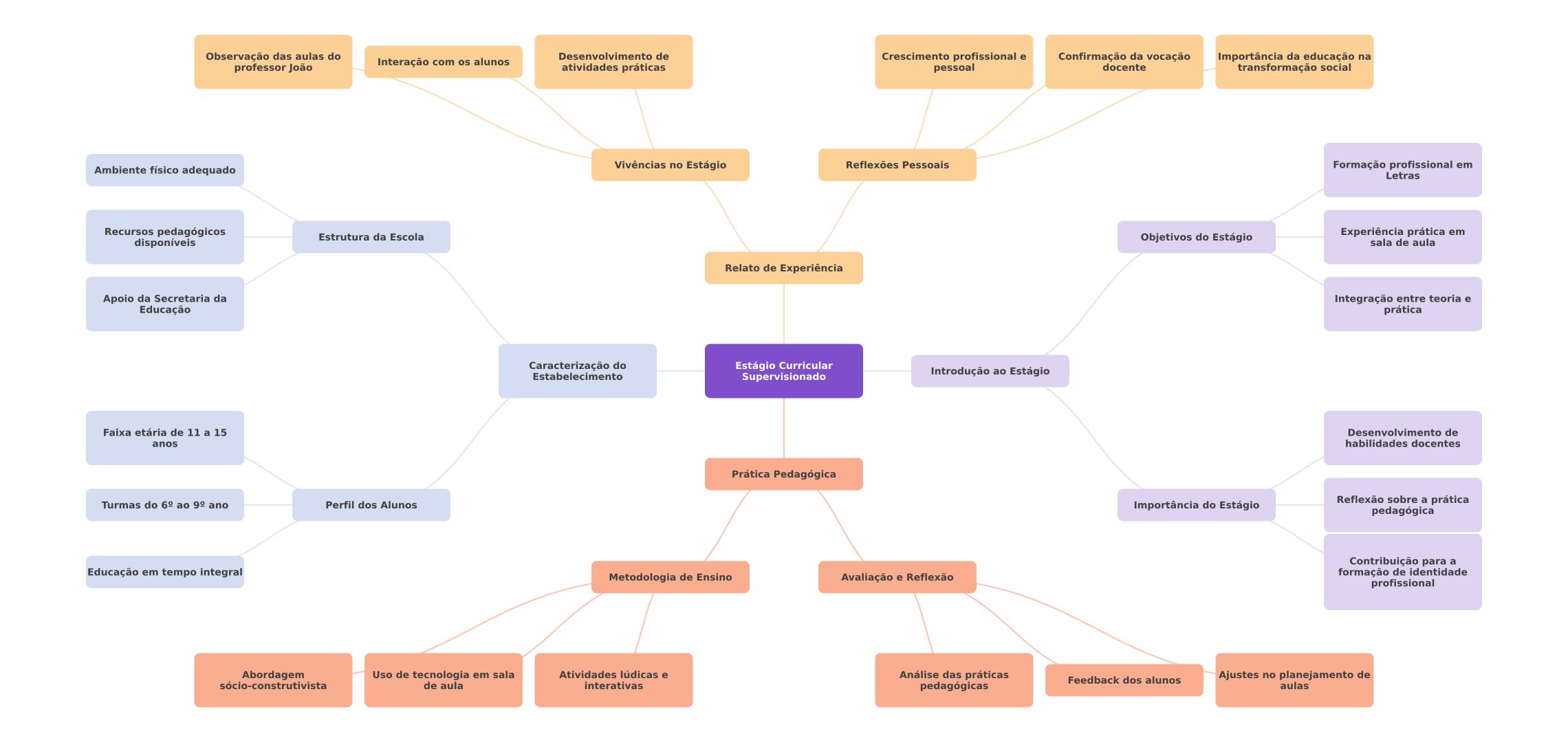 Observação das aulas do Desenvolvimento de Interação com os alunos Crescimento profissional e Confirmação da vocação Importância da educação na professor João atividades práticas pessoal docente transformação social Ambiente físico adequado Vivências no Estágio Reflexões Pessoais Formação profissional em Letras Recursos pedagógicos Estrutura da Escola disponíveis Objetivos do Estágio Experiência prática em sala de aula Relato de Experiência Apoio da Secretaria da Integração entre teoria e Educação prática Caracterização do Estágio Curricular Estabelecimento Supervisionado Introdução ao Estágio Faixa etária de 11 a 15 Desenvolvimento de anos habilidades docentes Prática Pedagógica Turmas do ao ano Perfil dos Alunos Importância do Estágio Reflexão sobre a prática pedagógica Contribuição para a Educação em tempo integral Metodologia de Ensino Avaliação e Reflexão formação de identidade profissional Abordagem Uso de tecnologia em sala Atividades lúdicas e Análise das práticas Feedback dos alunos Ajustes no planejamento de sócio-construtivista de aula interativas pedagógicas aulas
