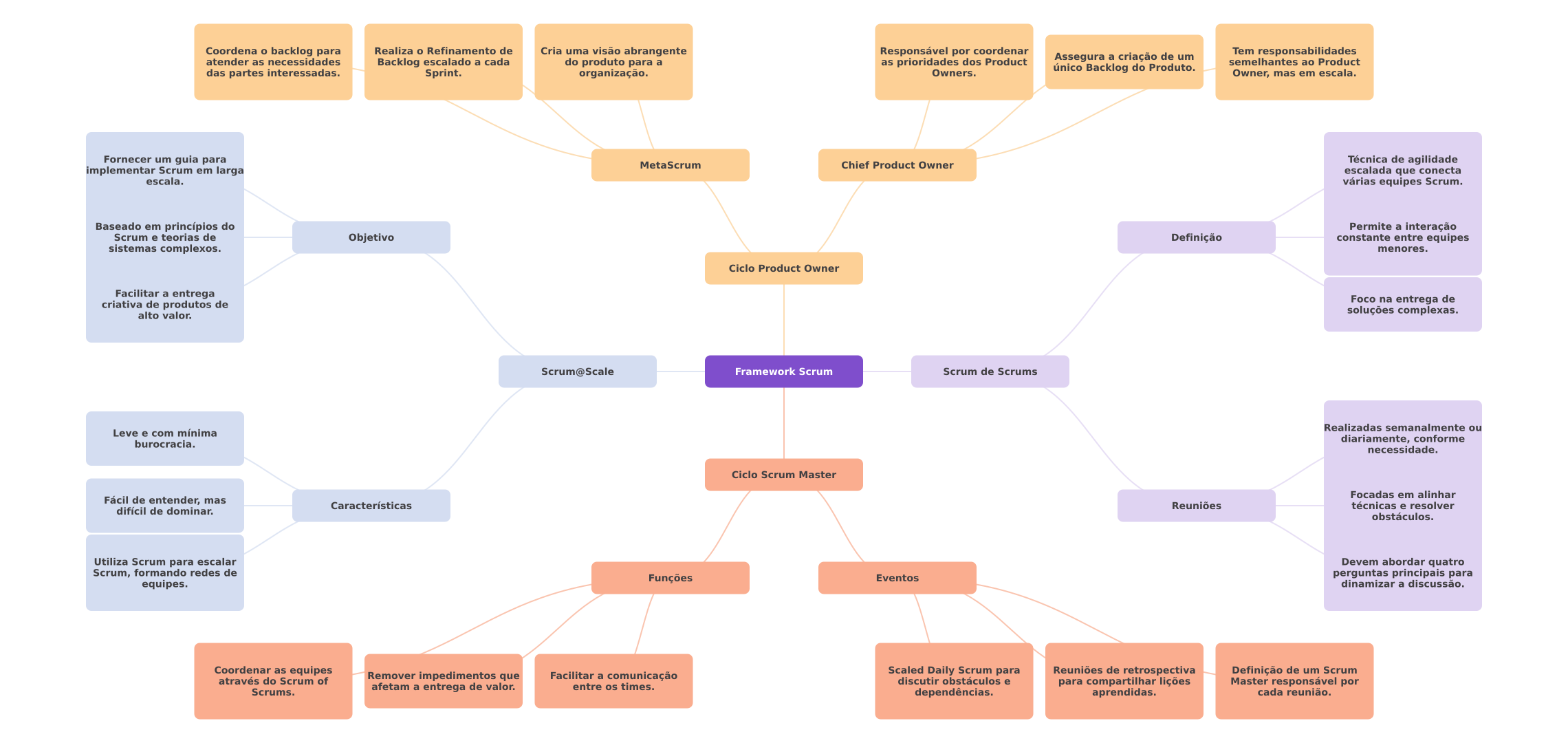 Coordena backlog para Realiza Refinamento de Cria uma visão abrangente Responsável por coordenar atender as necessidades do produto para a Assegura a criação de um Tem responsabilidades Backlog escalado a cada as prioridades dos Product semelhantes ao Product das partes interessadas. Sprint. organização. Owners. único Backlog do Produto. Owner, mas em escala. Fornecer um guia para MetaScrum Chief Product Owner Técnica de agilidade implementar Scrum em larga escalada que conecta escala. várias equipes Scrum. Baseado em princípios do Permite a interação Scrum e teorias de Objetivo Definição constante entre equipes sistemas complexos. menores. Ciclo Product Owner Facilitar a entrega criativa de produtos de Foco na entrega de alto valor. soluções complexas. Scrum@Scale Framework Scrum Scrum de Scrums Realizadas semanalmente ou Leve e com mínima burocracia. diariamente, conforme necessidade. Ciclo Scrum Master Focadas em alinhar Fácil de entender, mas Características Reuniões técnicas e resolver difícil de dominar. obstáculos. Utiliza Scrum para escalar Devem abordar quatro Scrum, formando redes de Funções Eventos perguntas principais para equipes. dinamizar a discussão. Coordenar as equipes através do Scrum of Remover impedimentos que Facilitar a comunicação Scaled Daily Scrum para Reuniões de retrospectiva Definição de um Scrum discutir obstáculos e afetam a entrega de valor. entre os times. para compartilhar lições Master responsável por Scrums. dependências. aprendidas. cada reunião.
