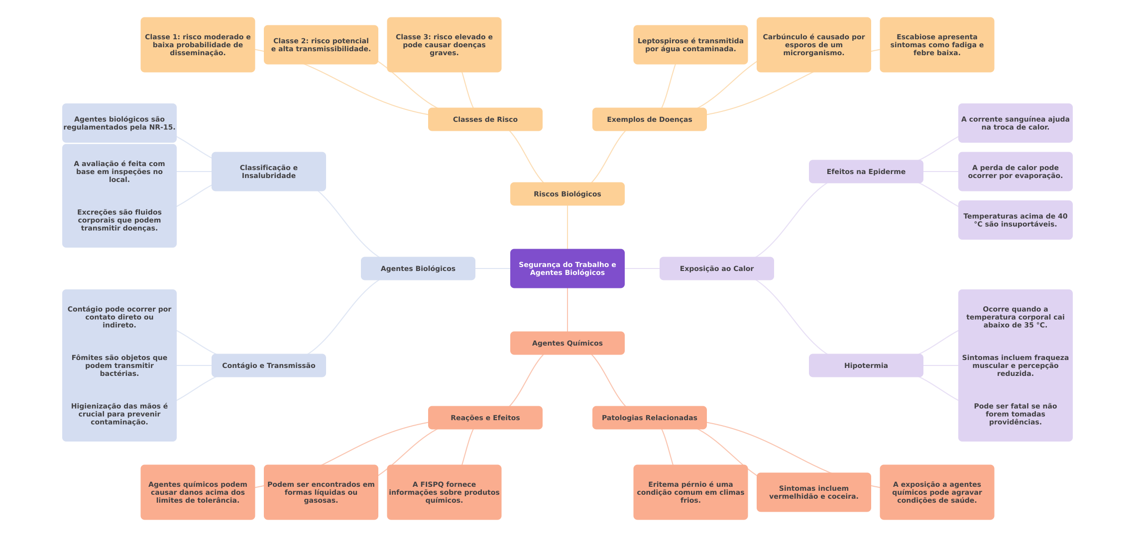 Classe 1: risco moderado e Classe 3: risco elevado e baixa probabilidade de Classe 2: risco potencial Leptospirose é transmitida Carbúnculo é causado por Escabiose apresenta e alta transmissibilidade. pode causar doenças por água contaminada. esporos de um sintomas como fadiga e disseminação. graves. microrganismo. febre baixa. Agentes biológicos são Classes de Risco Exemplos de Doenças A corrente sanguínea ajuda regulamentados pela NR-15. na troca de calor. A avaliação é feita com base em inspeções no Classificação e Efeitos na Epiderme A perda de calor pode Insalubridade local. ocorrer por evaporação. Riscos Biológicos Excreções são fluidos corporais que podem Temperaturas acima de 40 transmitir doenças. °C são insuportáveis. Agentes Biológicos Segurança do Trabalho e Exposição ao Calor Agentes Biológicos Contágio pode ocorrer por Ocorre quando a contato direto ou temperatura corporal cai indireto. abaixo de 35 Agentes Químicos Fômites são objetos que Sintomas incluem fraqueza podem transmitir Contágio e Transmissão Hipotermia muscular e percepção bactérias. reduzida. Higienização das mãos Pode ser fatal se não crucial para prevenir forem tomadas Reações e Efeitos Patologias Relacionadas contaminação. providências. Agentes químicos podem Podem ser encontrados em A FISPQ fornece Eritema pérnio é uma Sintomas incluem A exposição a agentes causar danos acima dos formas líquidas ou informações sobre produtos condição comum em climas vermelhidão e coceira. químicos pode agravar limites de tolerância. gasosas. químicos. frios. condições de saúde.