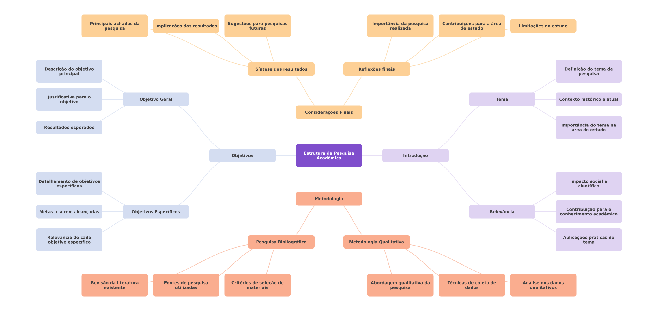 Principais achados da Implicações dos resultados Sugestões para pesquisas Importância da pesquisa Contribuições para a área pesquisa futuras realizada de estudo Limitações do estudo Descrição do objetivo Síntese dos resultados Reflexões finais Definição do tema de principal pesquisa Justificativa para Objetivo Geral Tema Contexto histórico e atual objetivo Considerações Finais Resultados esperados Importância do tema na área de estudo Objetivos Estrutura da Pesquisa Acadêmica Introdução Detalhamento de objetivos Impacto social e específicos científico Metodologia Metas a serem alcançadas Objetivos Específicos Relevância Contribuição para o conhecimento acadêmico Relevância de cada Aplicações práticas do objetivo específico Pesquisa Bibliográfica Metodologia Qualitativa tema Revisão da literatura Fontes de pesquisa Critérios de seleção de Abordagem qualitativa da Técnicas de coleta de Análise dos dados existente utilizadas materiais pesquisa dados qualitativos