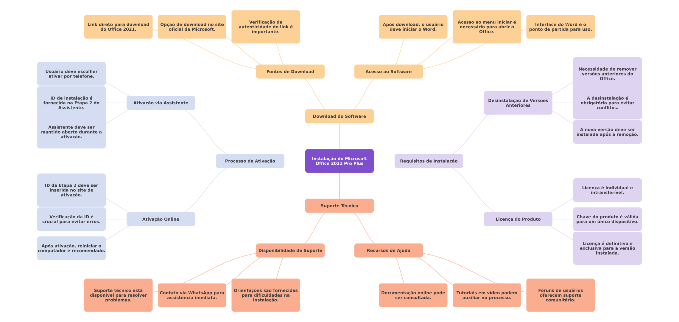 Opção de download no site Verificação da Acesso ao menu iniciar é Link direto para download Após download, usuário Interface do Word é autenticidade do link é do Office 2021. oficial da Microsoft. deve iniciar Word. necessário para abrir importante. Office. ponto de partida para uso. Necessidade de remover Usuário deve escolher Fontes de Download Acesso ao Software versões anteriores do ativar por telefone. Office. ID de instalação é Ativação via Assistente Desinstalação de Versões A desinstalação é fornecida na Etapa 2 do Anteriores obrigatória para evitar Assistente. conflitos. Download do Software Assistente deve ser A nova versão deve ser mantido aberto durante a ativação. instalada após a remoção. Instalação do Microsoft Processo de Ativação Office 2021 Pro Plus Requisitos de Instalação ID da Etapa 2 deve ser inserida no site de Licença é individual e intransferível. ativação. Suporte Técnico Verificação da ID é crucial para evitar erros. Ativação Online Licença do Produto Chave do produto é válida para um único dispositivo. Após ativação, reiniciar Licença é definitiva e computador é recomendado. Disponibilidade de Suporte Recursos de Ajuda exclusiva para a versão instalada. Suporte técnico está Orientações são fornecidas Fóruns de usuários disponível para resolver Contato via WhatsApp para assistência imediata. para dificuldades na Documentação online pode Tutoriais em vídeo podem ser consultada. problemas. auxiliar no processo. oferecem suporte instalação. comunitário.