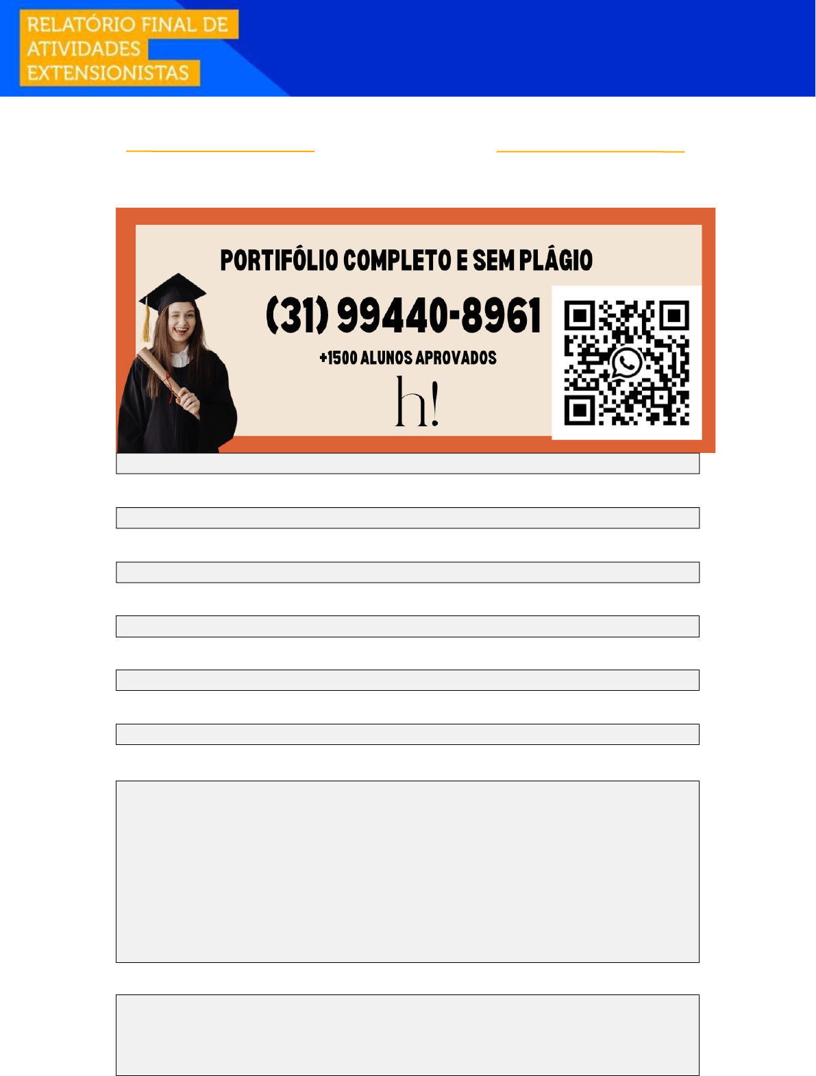 DADOS DO ALUNO Aluno: [Nome completo] RA: [Número do RA do aluno] POLO / UNIDADE: CURSO: CST EM MARKETING COMPONENTE CURRICULAR: PROJETO DE EXTENSÃO II - MARKETING PROGRAMA DE EXTENSÃO: PROGRAMA DE INOVAÇÃO E EMPREENDEDORISMO. FINALIDADE E MOTIVAÇÃO: Orientada pelo Programa de Inovação e Empreendedorismo, a extensão universitária do CST em Marketing possibilita que sejam oferecidas contribuições à solução de problemas diversificados, presentes no contexto social, e ao desenvolvimento local ou regional, sendo que a inovação e o empreendedorismo impactam na economia e na produtividade dos negócios, dessa forma, levando à criação do novo saber e do desenvolvimento de competências e soft skills específica. As ações poderão ser realizadas em locais diversos, como: Micro e Pequena Empresa, Estabelecimento de Microempreendedor (MEI), Associação de Bairro, Associação Comercial, Escola, Sebrae e Centro Comercial. COMPETÊNCIAS: I - Utilizar novas tecnologias em ações do marketing; II - Atuar em todas as dimensões que envolvam a relação com o consumidor on-line e/ou offline; III - Diagnosticar potenciais de mercado considerando oportunidades e ameaças. PERFIL DO EGRESSO: A IES idealizou um perfil do egresso para o CST em Marketing que permite a formação do profissional que tenha como valores e pressupostos essenciais um perfil generalista, crítico, reflexivo, propositivo, humanístico e dinâmico, apto a agir eticamente, diagnosticando os ambientes externo e interno, para a tomada de decisão e do estabelecimento de estratégias e objetivos, a fim de investigar inovações e implementá-las nos processos estruturados e, atuando postura socialmente responsável, sendo que, pelas atividades extensionistas vinculadas ao Programa de Inovação e Empreendedorismo, esse egresso poderá desenvolver habilidades, com 5 domínio científico e intelectual, com capacidade para empreender no negócio e na sua carreira, conduzir atividades do processo gerencial e aquelas referentes à compreensão da realidade social, cultural e econômica do meio em que está inserido, contribuindo com a promoção da transformação da realidade e do desenvolvimento da inovação, do emprego e dos negócios. SOFT SKILLS (COMPETÊNCIAS SOCIOEMOCIONAIS): Planejamento e organização Inteligência Emocional Tomada de Decisão OBJETIVOS DE APRENDIZAGEM: Proporcionar a geração do novo conhecimento, originado da aplicação da aprendizagem multidisciplinar do curso em benefício do empreendedorismo e da inovação local e, consequentemente, a contribuição com o desenvolvimento econômico e social do local e da região, é o principal objetivo da extensão universitária do CST em Marketing, vinculada ao Programa de Inovação e Empreendedorismo. CONTEÚDOS: I - Estratégias mercadológicas; II - Marketing; III - Composto mercadológico; IV - Empreendedorismo e Inovação. INDICAÇÕES BIBLIOGRÁFICAS: ALMEIDA, Eder Gonçalves de; ALEIXO, Tayra Carolina Nascimento. Empreededorismo e inovação. Londrina: Editora e Distribuidora Educacional S.A., 2020. MICCOLI, Rita Regiani Benito; CAMPOS, Maria Isabel de. Composto mercadológico. Londrina: Editora e Distribuidora Educacional S.A., 2016. NONAKA, Henry Tetsuji et al. Fundamentos de marketing. Londrina: Editora e Distribuidora Educacional S.A., 2014. RELATÓRIO FINAL Aluno e Aluna, após realizar suas atividades de extensão, é necessário que você o formalize, enviando esse Relatório Final para ser avaliado junto ao seu Ambiente Virtual (AVA) e também para você poder comprovar sua atuação. Para o preenchimento, busque as anotações junto ao TEMPLATE PCDA para auxiliar na apresentação das atividades desenvolvidas. Todos os campos são de preenchimento obrigatório! DESCRIÇÃO DA AÇÃO COM RESULTADOS ALCANÇADOS Metas dos Objetivos de Desenvolvimento Sustentável (ODS) aderentes a este projeto: CAMPO OBRIGATÓRIO – busque no seu Template PDCA quais Metas você selecionou como aderentes ao seu projeto, conforme cada Objetivo de Desenvolvimento Sustentável (ODS) da Organização das Nações Unidas (ONU) que você explorou no seu planejamento. Liste as Metas selecionadas (pelo menos uma opção): Local de realização da atividade extensionista: Durante a ação: Caso necessário, houve mudança de estratégia para alcançar o resultado: Resultado da ação: Conclusão: Depoimentos (se houver): RELATE SUA PERCEPÇÃO DAS AÇÕES EXTENSIONISTAS REALIZADAS NO PROGRAMA DESENVOLVIDO CAMPO OBRIGATÓRIO – relate em no mínimo 15 (quinze) linhas sua experiência com as ações extensionistas. O texto deve ser de sua autoria e inédito, evite plágio. Questões norteadoras: (1) Você notou que suas habilidades profissionais foram aprimoradas, com a atuação nas ações extensionistas? (2) Você identificou melhoria/resolução do problema identificado? (3) Você conseguiu articular os conhecimentos adquiridos no curso com as ações extensionistas? Ao escrever seu texto evite deixá-lo em forma de respostas as questões norteadoras, relate sua experiência em forma de texto dissertativo com justificativas. DEPOIMENTO DA INSTITUIÇÃO PARTICIPANTE CAMPO OBRIGATÓRIO - insira depoimento(s) do(s) gestor(es) da instituição/órgão/associação participante que contribuam como um feedback da ação realizada por você. REFERÊNCIAS BIBLIOGRÁFICAS CAMPO OBRIGATÓRIO – Siga a normas ABNT, para isso consulte sua Biblioteca Virtual; Utilize como referências bibliográficas as indicações do Campo: Indicações Bibliográficas e as demais referências utilizadas no desenvolvimento do seu projeto. AUTOAVALIAÇÃO DA ATIVIDADE Realize a sua avaliação em relação à atividade desenvolvida considerando uma escala de 0 a 10 para cada pergunta, assinalando com um X: 1. A atividade permitiu o desenvolvimento do projeto de extensão articulando as competências e conteúdos propostos junto ao Curso? 0 () 1 () 2 () 3 () 4 () 5 () 6 () 7 () 8 ()