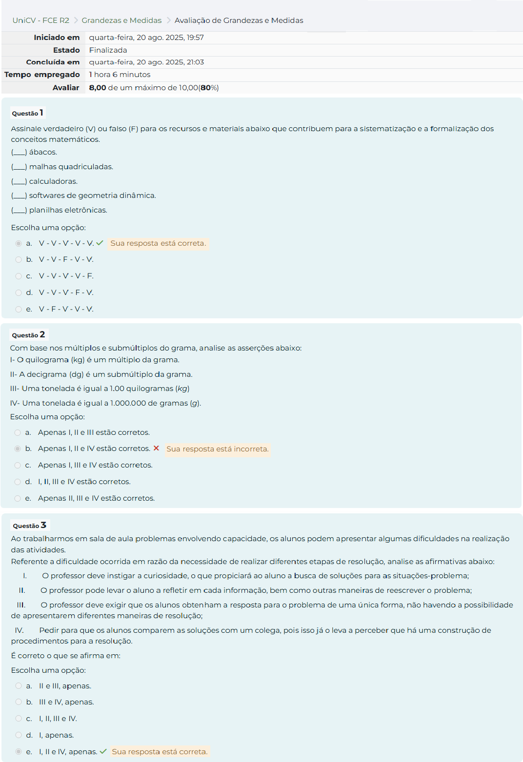 UniCV FCE R2 Grandezas e Medidas Avaliação de Grandezas e Medidas Iniciado em quarta-feira, 20 ago. 2025, 19:57 Estado Finalizada Concluída em quarta-feira, 20 ago. 2025, 21:03 Tempo empregado 1 hora 6 minutos Avaliar 8,00 de um máximo de 10,00(80%) Questão 1 Assinale verdadeiro (V) ou falso (F) para recursos e materiais abaixo que contribuem para a sistematização e a formalização dos conceitos matemáticos. ábacos. malhas quadriculadas. calculadoras. softwares de geometria dinâmica. planilhas eletrônicas. Escolha uma opção: a. Sua resposta está correta. C. e. V-F-V-V-V. Questão 2 Com base nos múltiplos e submúltiplos do grama, analise as asserções abaixo: I- quilograma (kg) é um múltiplo da grama. II- A decigrama (dg) é um submúltiplo da grama. III- Uma tonelada é igual a 1.00 quilogramas (kg) IV- Uma tonelada é igual a 1.000.000 de gramas (g). Escolha uma opção: a. Apenas I, e III estão corretos. b. Apenas I, e IV estão corretos. Sua resposta está incorreta. C. Apenas I, III e IV estão corretos. d. I, II, III e IV estão corretos. e. Apenas II, III e IV estão corretos. Questão 3 Ao trabalharmos em sala de aula problemas envolvendo capacidade, os alunos podem apresentar algumas dificuldades na realização das atividades. Referente a dificuldade ocorrida em razão da necessidade de realizar diferentes etapas de resolução, analise as afirmativas abaixo: professor deve instigar a curiosidade, que propiciará ao aluno a busca de soluções para as situações-problema; II. professor pode levar aluno a refletir em cada informação, bem como outras maneiras de reescrever problema; III. professor deve exigir que os alunos obtenham a resposta para problema de uma única forma, não havendo a possibilidade de apresentarem diferentes maneiras de resolução; IV. Pedir para que alunos comparem as soluções com um colega, pois isso já leva a perceber que há uma construção de procedimentos para a resolução. É correto que se afirma em: Escolha uma opção: a. e III, apenas. b. III e IV, apenas. C. I, II, III e IV. d. I, apenas. e. I, e IV, apenas. Sua resposta está correta.