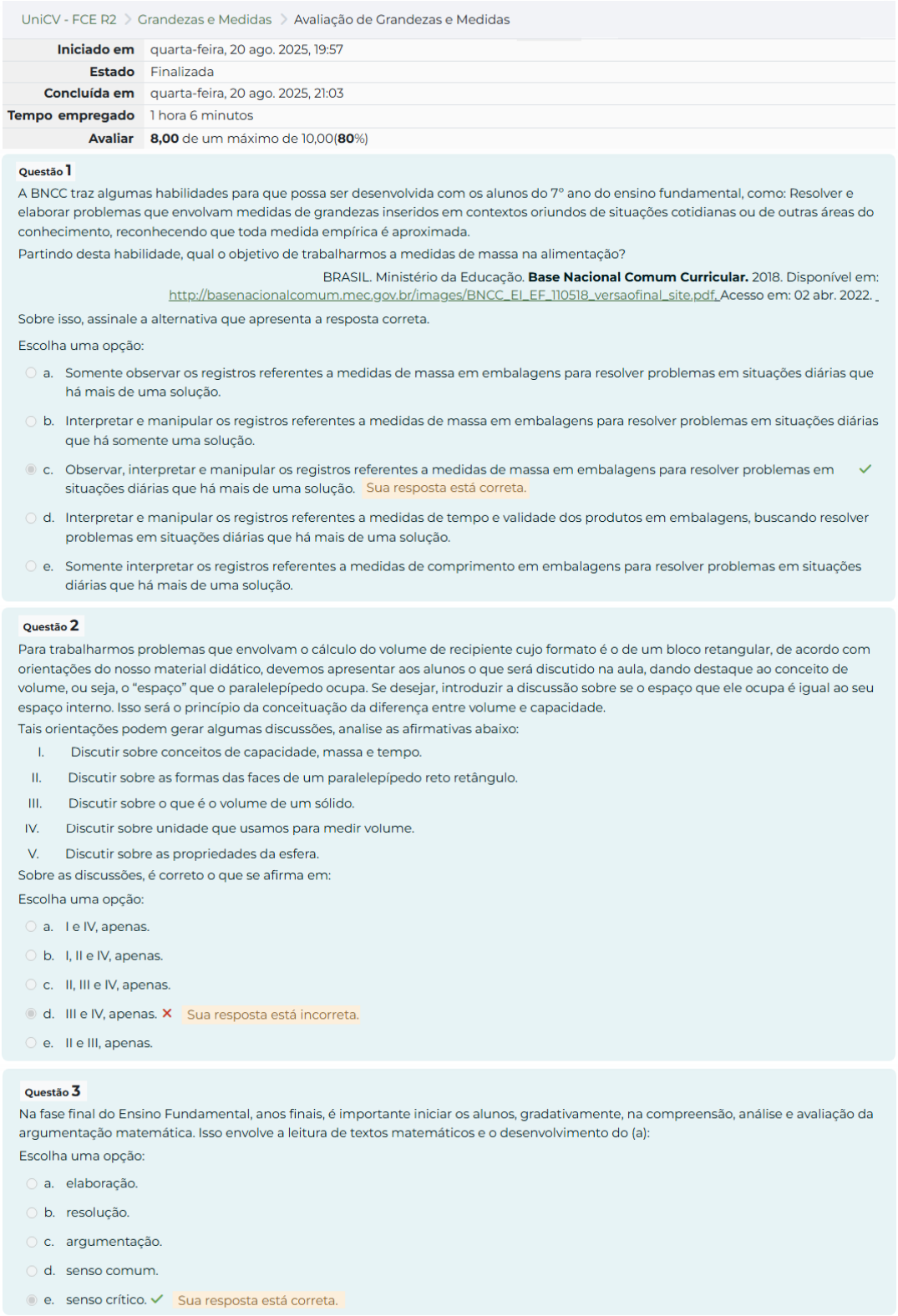 UniCV FCE R2 Grandezas e Medidas Avaliação de Grandezas e Medidas Iniciado em quarta-feira, 20 ago. 2025, 19:57 Estado Finalizada Concluída em quarta-feira, 20 ago. 2025, 21:03 Tempo empregado 1 hora 6 minutos Avaliar 8,00 de um máximo de 10,00(80%) Questão 1 A BNCC traz algumas habilidades para que possa ser desenvolvida com alunos do 7° ano do ensino fundamental, como: Resolver e elaborar problemas que envolvam medidas de grandezas inseridos em contextos oriundos de situações cotidianas ou de outras áreas do conhecimento, reconhecendo que toda medida empírica é aproximada. Partindo desta habilidade, qual objetivo de trabalharmos a medidas de massa na alimentação? Ministério da Educação. Base Nacional Comum Curricular. 2018. Disponível em: abr. 2022. Sobre isso, assinale a alternativa que apresenta a resposta correta. Escolha uma opção: a. Somente observar registros referentes a medidas de massa em embalagens para resolver problemas em situações diárias que há mais de uma solução. b. Interpretar e manipular os registros referentes a medidas de massa em embalagens para resolver problemas em situações diárias que há somente uma solução. C. Observar, interpretar e manipular os registros referentes a medidas de massa em embalagens para resolver problemas em situações diárias que há mais de uma solução. Sua resposta está correta. d. Interpretar e manipular os registros referentes a medidas de tempo e validade dos produtos em embalagens, buscando resolver problemas em situações diárias que há mais de uma solução. e. Somente interpretar os registros referentes a medidas de comprimento em embalagens para resolver problemas em situações diárias que há mais de uma solução. Questão 2 Para trabalharmos problemas que envolvam cálculo do volume de recipiente cujo formato é de um bloco retangular, de acordo com orientações do nosso material didático, devemos apresentar aos alunos que será discutido na aula, dando destaque ao conceito de volume, ou seja, "espaço" que paralelepípedo ocupa. Se desejar, introduzir a discussão sobre se espaço que ele ocupa é igual ao seu espaço interno. Isso será o princípio da conceituação da diferença entre volume e capacidade. Tais orientações podem gerar algumas discussões, analise as afirmativas abaixo: I. Discutir sobre conceitos de capacidade, massa e tempo. II. Discutir sobre as formas das faces de um paralelepípedo reto retângulo. III. Discutir sobre que é volume de um sólido. IV. Discutir sobre unidade que usamos para medir volume. V. Discutir sobre as propriedades da esfera. Sobre as discussões, é correto que se afirma em: Escolha uma opção: a. le IV, apenas. b. I, e IV, apenas. C. II, III e IV, apenas. d. III e IV, apenas. Sua resposta está incorreta. e. e III, apenas. Questão 3 Na fase final do Ensino Fundamental, anos finais, é importante iniciar os alunos, gradativamente, na compreensão, análise e avaliação da argumentação matemática. Isso envolve a leitura de textos matemáticos e desenvolvimento do (a): Escolha uma opção: a. elaboração. b. resolução. C. argumentação. d. senso comum. e. senso crítico. Sua resposta está correta.