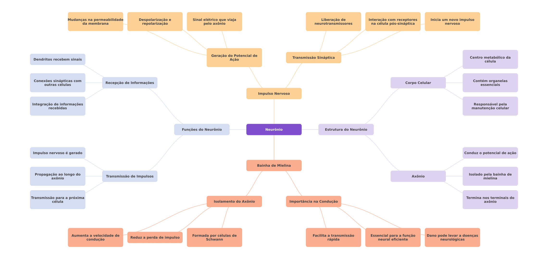 Mudanças na permeabilidade Despolarização e Sinal elétrico que viaja Liberação de Interação com receptores Inicia um novo impulso da membrana repolarização pelo axônio neurotransmissores na célula pós-sináptica nervoso Geração do Potencial de Dendritos recebem sinais Ação Transmissão Sináptica Centro metabólico da célula Conexões sinápticas com outras células Recepção de Informações Corpo Celular Contém organelas essenciais Impulso Nervoso Integração de informações Responsável pela recebidas manutenção celular Funções do Neurônio Neurônio Estrutura do Neurônio Impulso nervoso é gerado Conduz potencial de ação Bainha de Mielina Propagação ao longo do Transmissão de Impulsos Axônio Isolado pela bainha de axônio mielina Transmissão para a próxima Termina nos terminais do célula Isolamento do Axônio Importância na Condução axônio Aumenta a velocidade de Formada por células de Facilita a transmissão condução Reduz a perda de impulso Essencial para a função Dano pode levar a doenças Schwann rápida neural eficiente neurológicas