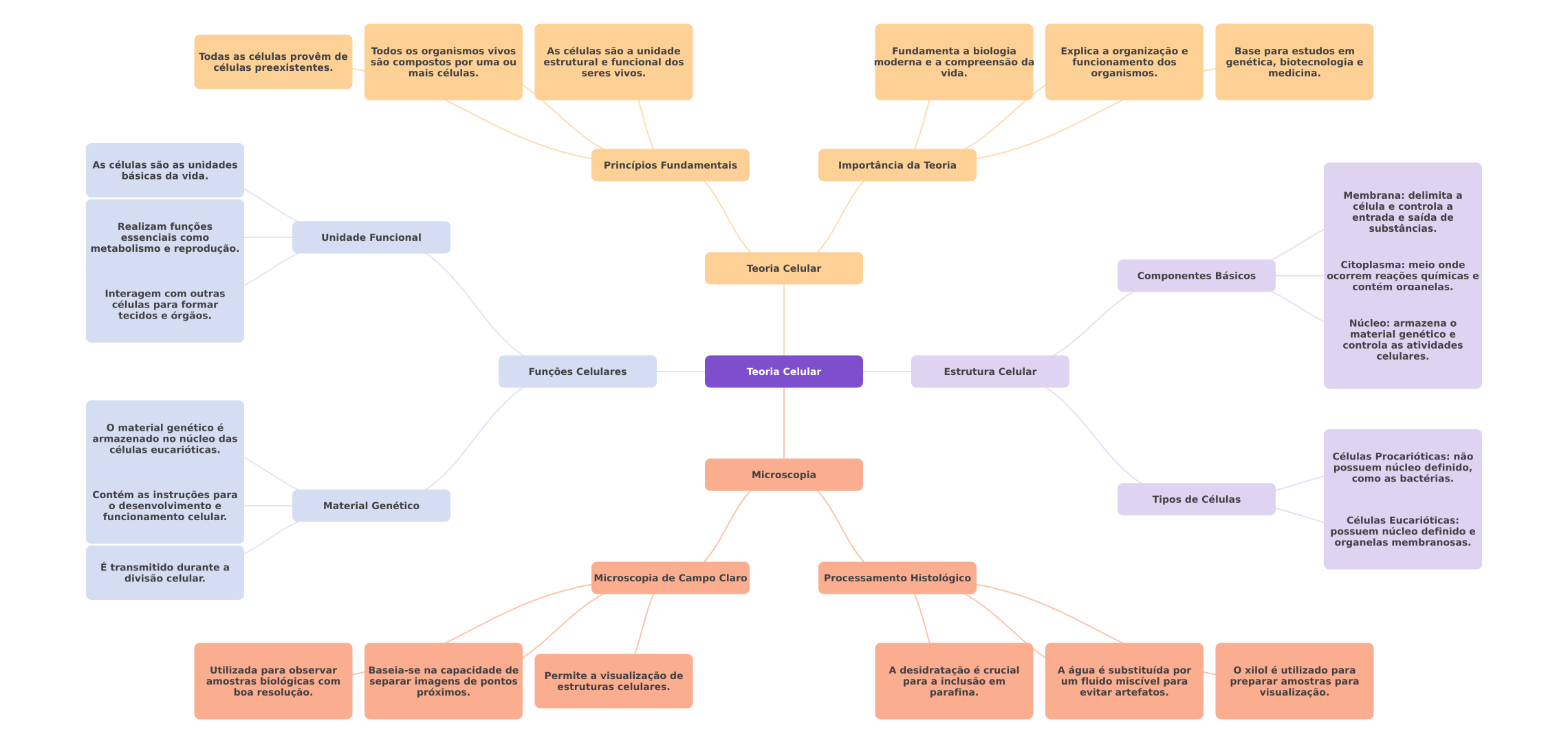 Todos os organismos vivos As células são a unidade Todas as células provêm de Fundamenta a biologia Explica a organização e Base para estudos em são compostos por uma ou estrutural e funcional dos células preexistentes. moderna e a compreensão da funcionamento dos genética, biotecnologia e mais células. seres vivos. vida. organismos. medicina. As células são as unidades Princípios Fundamentais Importância da Teoria básicas da vida. Membrana: delimita a célula e controla a entrada e saída de Realizam funções substâncias. essenciais como Unidade Funcional metabolismo e reprodução. Teoria Celular Citoplasma: meio onde Componentes Básicos ocorrem reações químicas e contém organelas. Interagem com outras células para formar tecidos e órgãos. Núcleo: armazena material genético e controla as atividades celulares. Funções Celulares Teoria Celular Estrutura Celular material genético é armazenado no núcleo das células eucarióticas. Células Procarióticas: não possuem núcleo definido, Microscopia como as bactérias. Contém as instruções para Material Genético Tipos de Células e funcionamento celular. Células Eucarióticas: possuem núcleo definido e organelas membranosas. É transmitido durante a divisão celular. Microscopia de Campo Claro Processamento Histológico Utilizada para observar Baseia-se na capacidade de Permite a visualização de A desidratação é crucial A água é substituída por xilol é utilizado para amostras biológicas com separar imagens de pontos estruturas celulares. para a inclusão em um fluido miscível para preparar amostras para boa resolução. próximos. parafina. evitar artefatos. visualização.