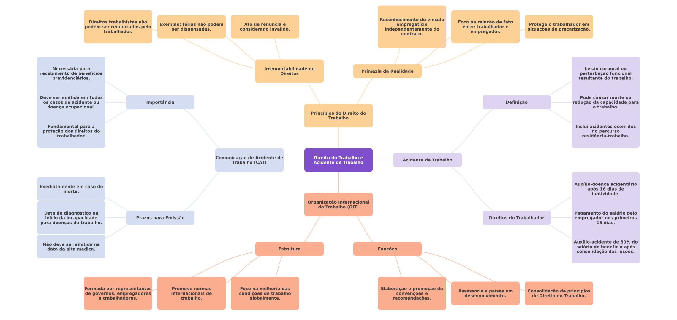 Reconhecimento do vínculo Direitos trabalhistas não Foco na relação de fato Exemplo: férias não podem Ato de renúncia é empregatício podem ser renunciados pelo entre trabalhador e Protege trabalhador em trabalhador. ser dispensadas. considerado inválido. independentemente do contrato. empregador. situações de precarização. Necessária para Irrenunciabilidade de Primazia da Realidade Lesão corporal ou recebimento de benefícios Direitos perturbação funcional previdenciários. resultante do trabalho. Deve ser emitida em todos Pode causar morte ou os casos de acidente ou Importância Definição redução da capacidade para doença ocupacional. trabalho. Princípios do Direito do Trabalho Fundamental para a Inclui acidentes ocorridos proteção dos direitos do no percurso trabalhador. residência-trabalho. Comunicação de Acidente de Direito do Trabalho e Acidente de Trabalho Trabalho (CAT) Acidente de Trabalho Auxílio-doença acidentário Imediatamente em caso de após 16 dias de morte. inatividade. Organização Internacional do Trabalho (OIT) Data do diagnóstico ou Pagamento do salário pelo início da incapacidade Prazos para Emissão Direitos do Trabalhador empregador nos primeiros para doenças do trabalho. 15 dias. Auxílio-acidente de 80% do Não deve ser emitida na data da alta médica. Estrutura Funções salário de benefício após consolidação das lesões. Formada por representantes Promove normas Foco na melhoria das Elaboração e promoção de de governos, empregadores internacionais de condições de trabalho convenções e Assessoria a países em Consolidação de princípios desenvolvimento. de Direito do Trabalho. e trabalhadores. trabalho. globalmente. recomendações.