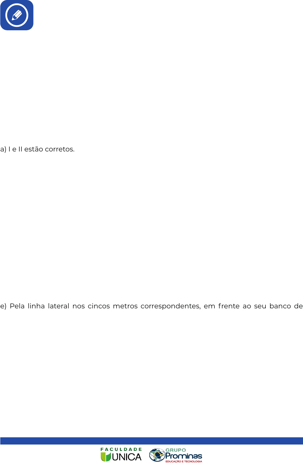65 FIXANDO O CONTEÚDO 1. Segundo as Regras Oficiais de Futsal 2021 (CBFS), regra 07 (duração da partida), item 2 (finalização dos períodos); o controle do tempo será de responsabilidade de um cronometrista que determinará com o uso de seu apito ou ao toque da sirene do placar eletrônico o final de cada período. Um dos árbitros ao ouvir o sinal finalizará o período ou a partida observando a seguinte situação: I. Se tiver de ser executado ou repetido um tiro do segundo ponto penal ou um tiro livre direto, a partir da sexta falta acumulada, o período em questão é prolongado até o tiro ser executado. II. Se tiver de ser executado ou repetido um tiro penal, o período em questão é prolongado até o tiro ser executado. a) I e II estão corretos. b) I e II estão incorretos. c) Somente I está correto. d) Somente II está correto. e) I e II não se referem ao enunciado. 2. Guilherme é treinador de futsal e durante um jogo da categoria sub-11, três atletas receberam cartão amarelo devido à irregularidade durante a substituição. Esses jogadores entraram em quadra por um local proibido. Em um jogo de futsal, de acordo com as regras oficiais estabelecidas pela CBFS, é permitido ao jogador substituto entrar em quadra na seguinte situação: a) Pela linha de fundo para cobrar um pênalti. b) Pela linha lateral oposta ao banco de reservas, quando a bola estiver fora de jogo. c) Pela linha de meta para executar um tiro livre direto. d) Na linha lateral em frente ao banco de reservas adversário, durante um pedido de tempo técnico pelo assistente. e) Pela linha lateral nos cincos metros correspondentes, em frente ao seu banco de reservas. 3. As regras do Futebol são aprovadas pela Federação Internacional de Futebol (FIFA). O futebol é praticado em um campo com dimensões de 90 a 120 metros de comprimento por 45 a 90 metros de largura. No entanto, para jogos oficiais de caráter internacional, as dimensões são de 100 a 110 metros de comprimento e 64 a 75 metros de largura. O jogo de futebol tem duração de 90 minutos, divididos em dois tempos de 45 minutos cada, com intervalo de 15 minutos entre os tempos. Apesar de o tempo ser maior do que nos demais esportes coletivos, são permitidas cinco substituições no tempo regulamentar. No entanto, essas substituições devem acontecer no número máximo de paradas no jogo. Diante disso, quantas paradas para substituição podem ser feitas no futebol? Carlos Gabriel Realce Carlos Gabriel Realce 66 a) 1 parada. b) 2 paradas. c) 3 paradas. d) 4 paradas. e) 5 paradas. 4. No futebol, cada partida é controlada por um árbitro que tem total autoridade para cumprir as regras da modalidade durante o jogo. No entanto, o árbitro possui dois assistentes (“bandeirinhas”) para auxiliá-lo em algumas marcações como na aplicação da regra do impedimento. Considerando que os assistentes tomam em média 6,7 decisões de impedimento durante o jogo, é importante salientar que eles não devem cometer erros para não comprometer o desenvolvimento da partida. Para evitar os erros, os assistentes devem estar sempre bem posicionados, caso contrário, os erros são mais comuns, devido à percepção desses assistentes. Diante disso, analise a imagem abaixo: Nesta figura, o atacante da esquerda não está em impedimento (outside) e o atacante que está à direita está em posição de impedimento (inside). No entanto, quando o atacante da esquerda e o defensor são projetados sobre a retina do assistente em uma posição mais distante (Far), a imagem do atacante está à direita do defensor. Neste caso, qual será o possível tipo de erro a ser cometido pelo assistente? a) Levantar a bandeira. b) Deixar a bandeira abaixada. c) Dar sequência à jogada. d) Comunicar-se, via rádio, com o árbitro. e) Marcar bola ao chão. 5. Segundo Weston e colaboradores (2012), os árbitros de futebol apresentam alta demanda cognitiva durante uma partida. Porém, diferentemente dos atletas, o treino dos árbitros tem se limitado ao treinamento da condição física, da leitura das regras do jogo e ver vídeos de jogos para analisar e discutir os lances e as decisões (HENRIQUES; ARAÚJO, 2012). Em relação à atuação dos árbitros, analise as seguintes considerações abaixo: 1) Messner e Schmid (2007) observaram que, durante uma partida, se uma das equipes for da mesma cultura do árbitro, esta tem vantagem sobre a outra; 2) Durante uma partida, os árbitros acrescentam mais tempo de jogo quando o time mandante está perdendo; Carlos Gabriel Realce Carlos Gabriel Realce 67 3) Além disso, foi constatado que são marcados mais pênaltis, legítimos ou não, a favor do time mandante. De acordo com essas informações, o que isso indica em relação à atuação dos árbitros? a) Uma clara parcialidade dos árbitros a favor do time visitante. b) Uma clara parcialidade dos árbitros a favor do time mandante. c) Uma clara imparcialidade dos árbitros a favor do time mandante. d) Uma clara imparcialidade dos árbitros a favor do time visitante. e) Uma clara imparcialidade para os dois times. 6. (Adaptado de IF-CE/IF-CE/Técnico de Laboratório – Educação Física) Considere- se um árbitro de futebol, conhecedor das regras que regem a modalidade. Diante de algumas situações ocorridas em campo, analise as questões a seguir, considerando como válidas ou não durante uma partida. I. É válido um gol feito através de um arremesso lateral, sem que o mesmo toque em algum jogado. II. Poderá um goleiro fazer uma cobrança de uma penalidade máxima. III. Quando ocorre um impedimento, é concedido ao adversário um tiro livre indireto, cobrado no local da ocorrência. IV. O Juiz poderá determinar uma penalidade máxima, quando um jogador da defesa, dentro da área penal, agride o adversário de ataque que está conduzindo a bola. V. É permitido na defesa, durante uma partida, empurrar, segurar ou dar trancos, segurar a bola com as mãos fora da área penal