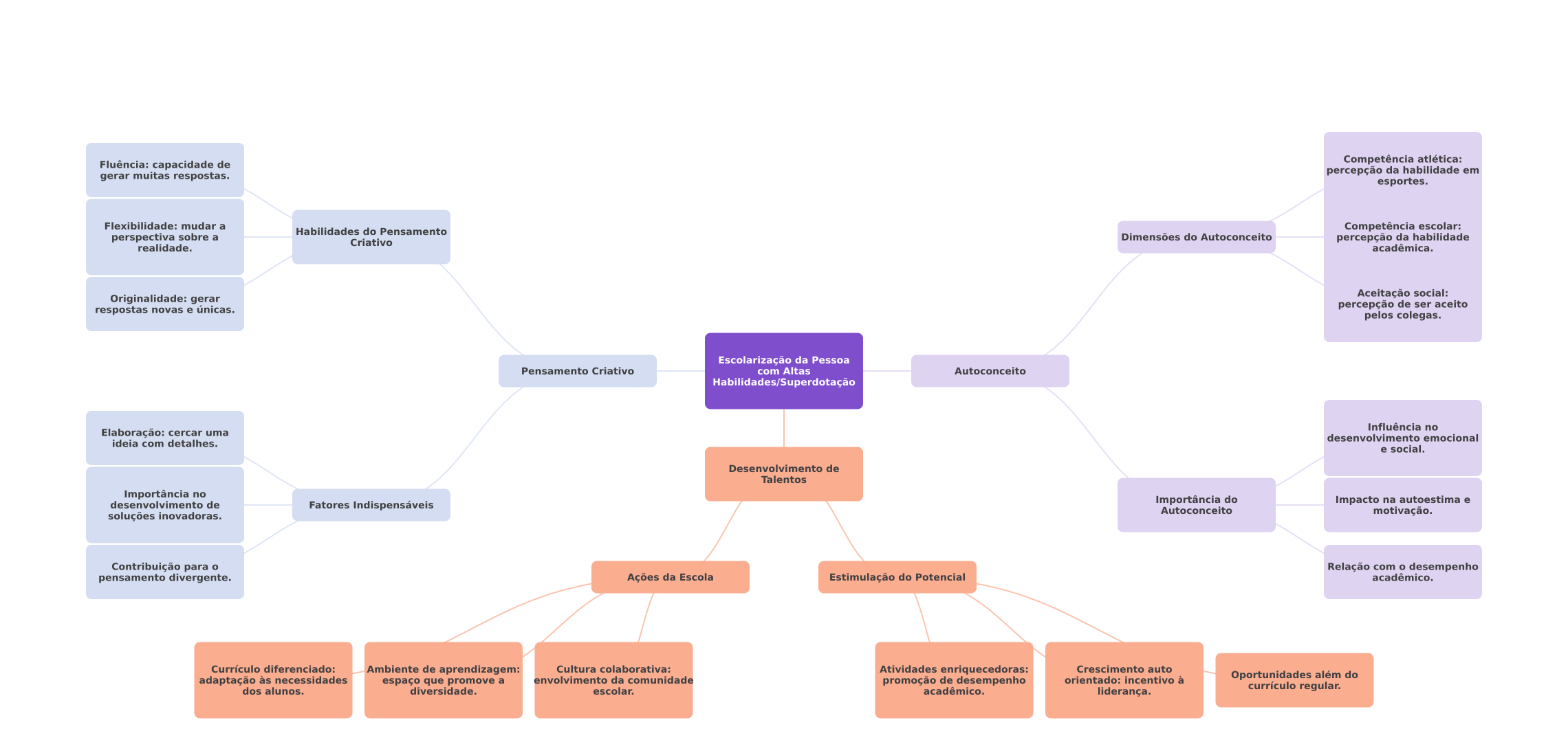 Criativo realidade. acadêmica. Aceitação social: Originalidade: gerar percepção de ser aceito respostas novas e únicas. pelos colegas. Escolarização da Pessoa Pensamento Criativo com Altas Autoconceito Habilidades/Superdotação Influência no Elaboração: cercar uma desenvolvimento ideia com detalhes. e social. Desenvolvimento de Talentos Importância no Importância do Impacto na autoestima desenvolvimento de Fatores Indispensáveis Autoconceito motivação. soluções inovadoras. Contribuição para Relação com desempen pensamento divergente. Ações da Escola Estimulação do Potencial acadêmico. Currículo diferenciado: Ambiente de aprendizagem: Cultura colaborativa: Atividades enriquecedoras: Crescimento auto adaptação às necessidades espaço que promove a envolvimento da comunidade promoção de desempenho orientado: incentivo à Oportunidades além do currículo regular. dos alunos. diversidade. escolar. acadêmico. liderança.