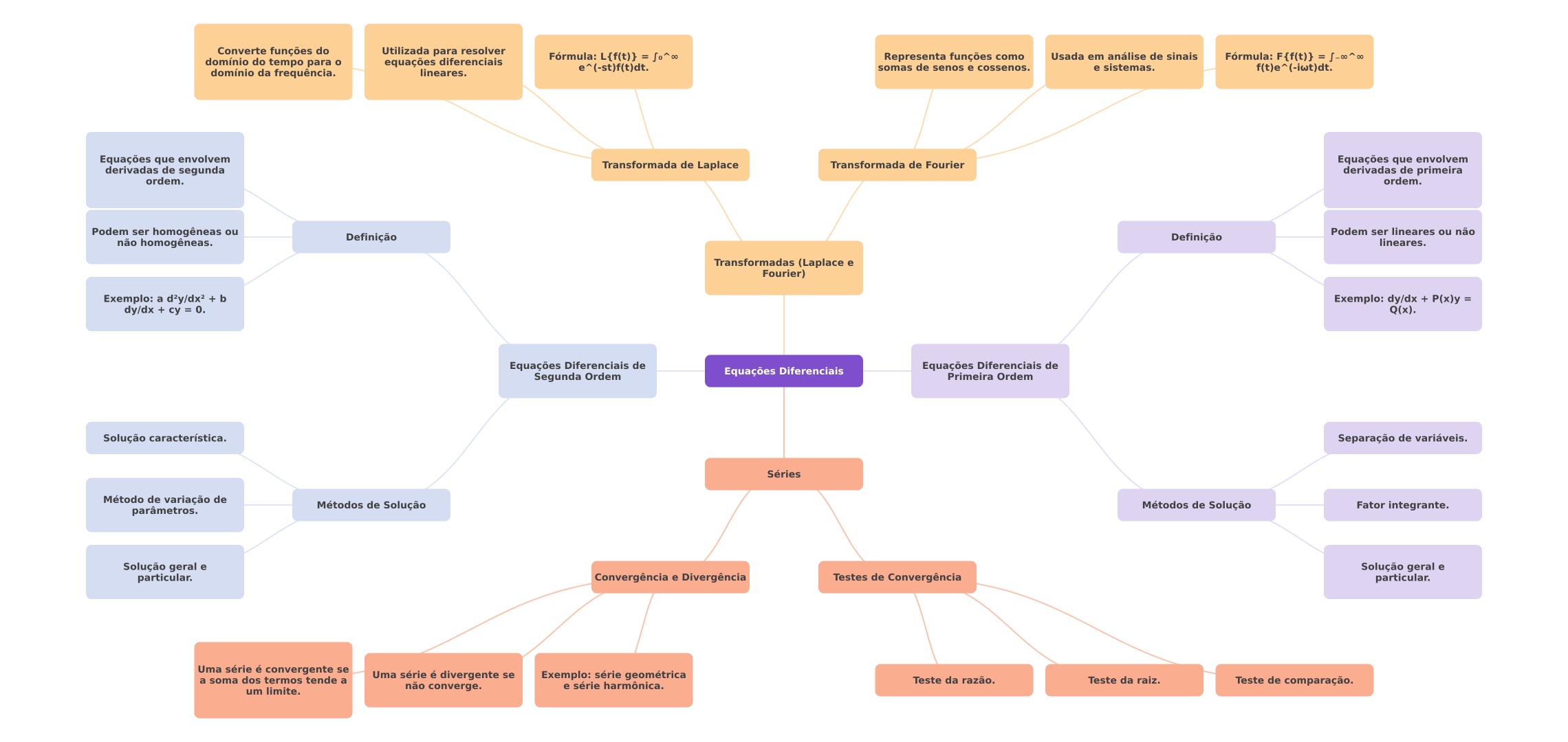 Converte funções do Utilizada para resolver domínio do tempo para equações diferenciais Fórmula: L{f(t)} = Representa funções como Usada em análise de sinais Fórmula: F{f(t)} = e^(-st)f(t)dt. somas de senos e cossenos. e sistemas. f(t)e ^(-iwt)dt. domínio da frequência. lineares. Equações que envolvem Transformada de Laplace Transformada de Fourier Equações que envolvem derivadas de segunda derivadas de primeira ordem. ordem. Podem ser homogêneas ou Podem ser lineares ou não não homogêneas. Definição Definição lineares. Transformadas (Laplace e Fourier) Exemplo: a + b Exemplo: dy/dx + P(x)y = dy/dx + = 0. Q(x). Equações Diferenciais de Equações Diferenciais Equações Diferenciais de Segunda Ordem Primeira Ordem Solução característica. Separação de variáveis. Séries Método de variação de Métodos de Solução Métodos de Solução parâmetros. Fator integrante. Solução geral e Solução geral e particular. Convergência e Divergência Testes de Convergência particular. Uma série é convergente se a soma dos termos tende a Uma série é divergente se Exemplo: série geométrica Teste da razão. Teste da raiz. e série harmônica. Teste de comparação. um limite. não converge.